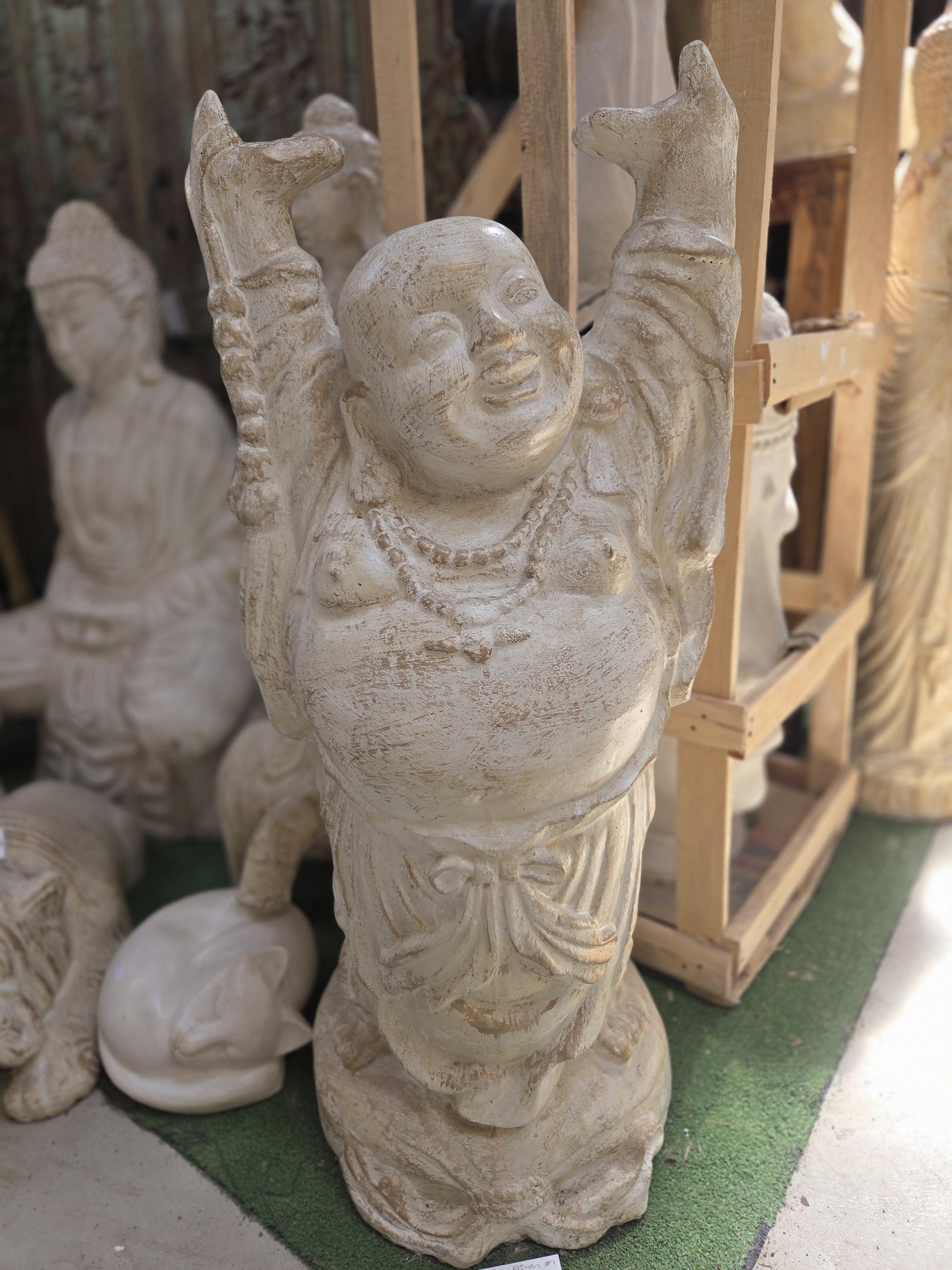 The “happy fatman Buddha” refers to Budai, a Chinese deity often called the Laughing Buddha or Happy Buddha, who is depicted as a stout, bald man with a big belly and a cheerful expression. He is a symbol of good luck, contentment and prosperity.