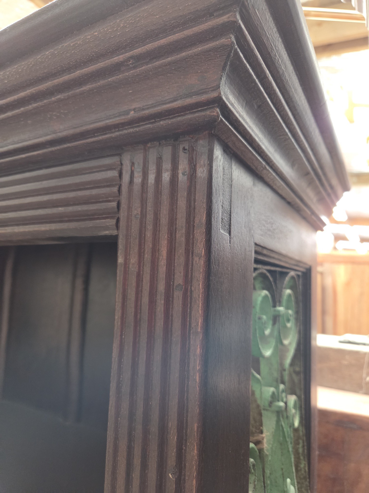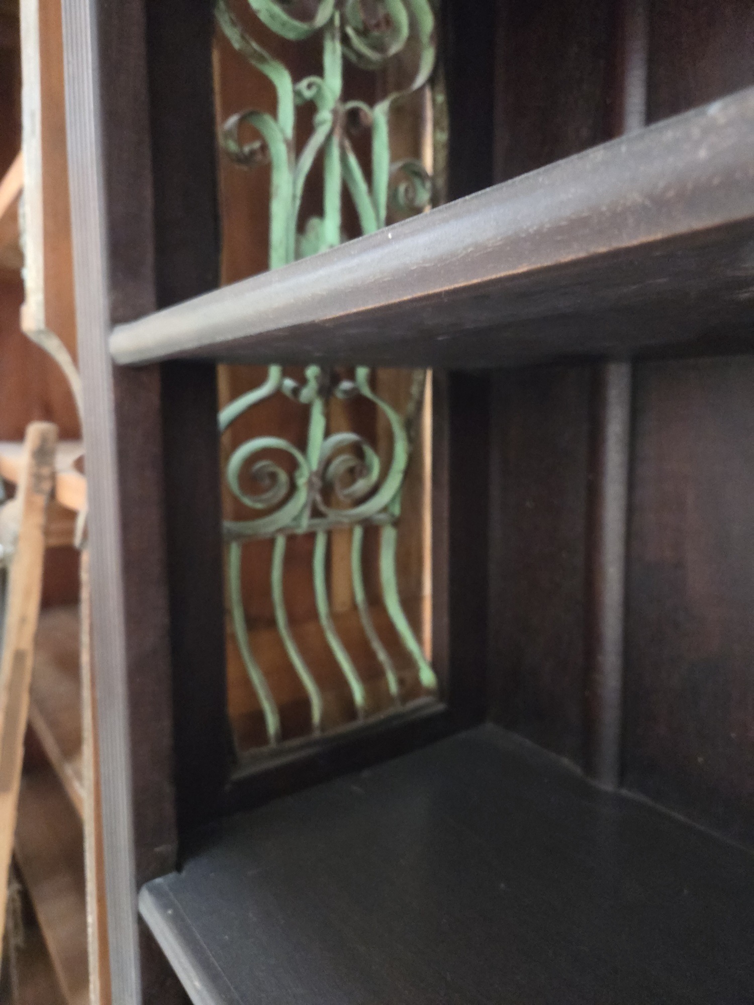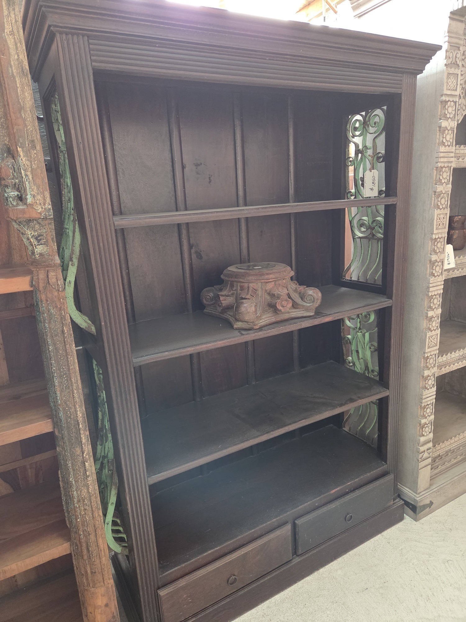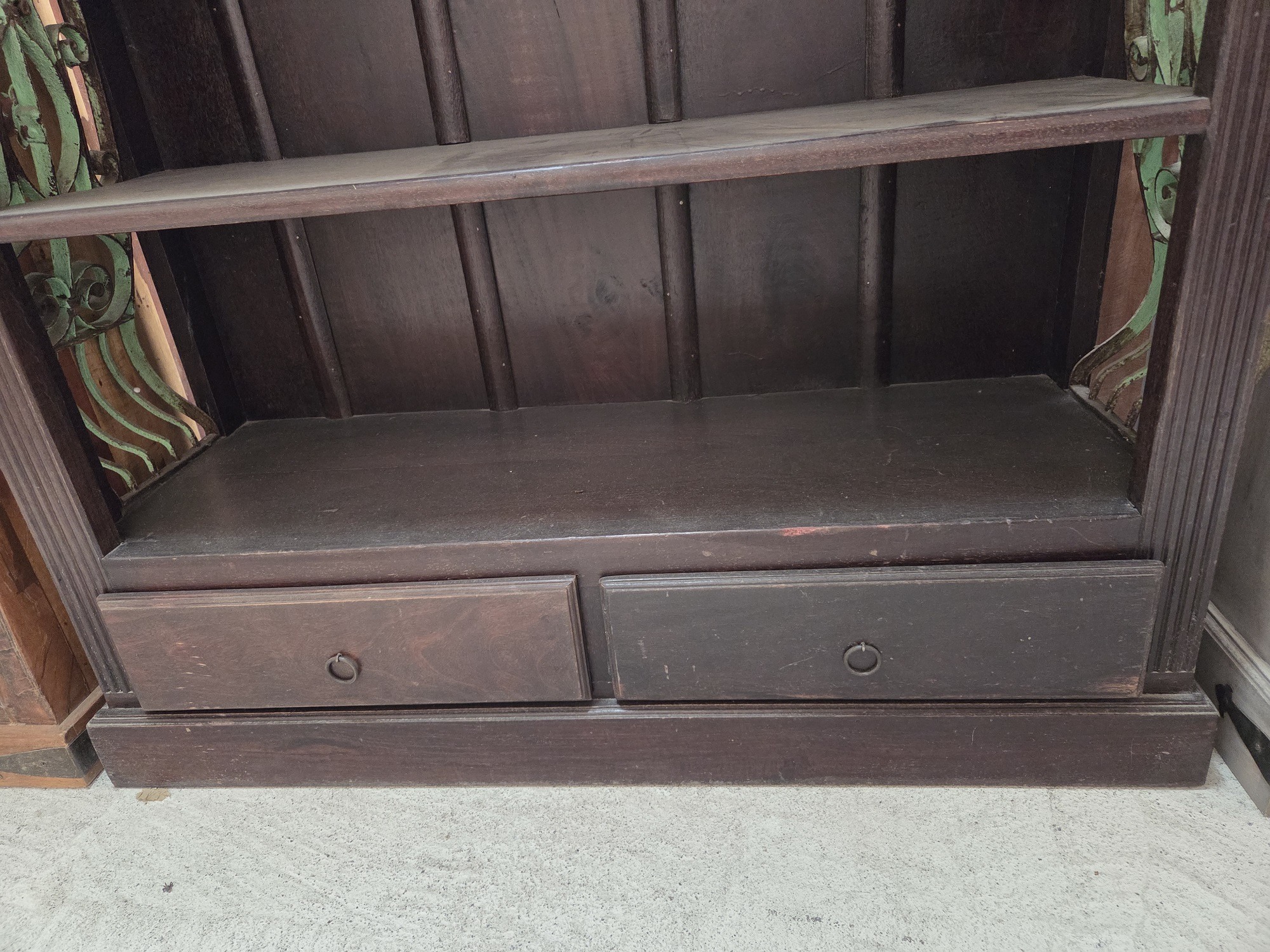 Lovely wood bookcase with wrought iron side panels and two drawers along the bottom.