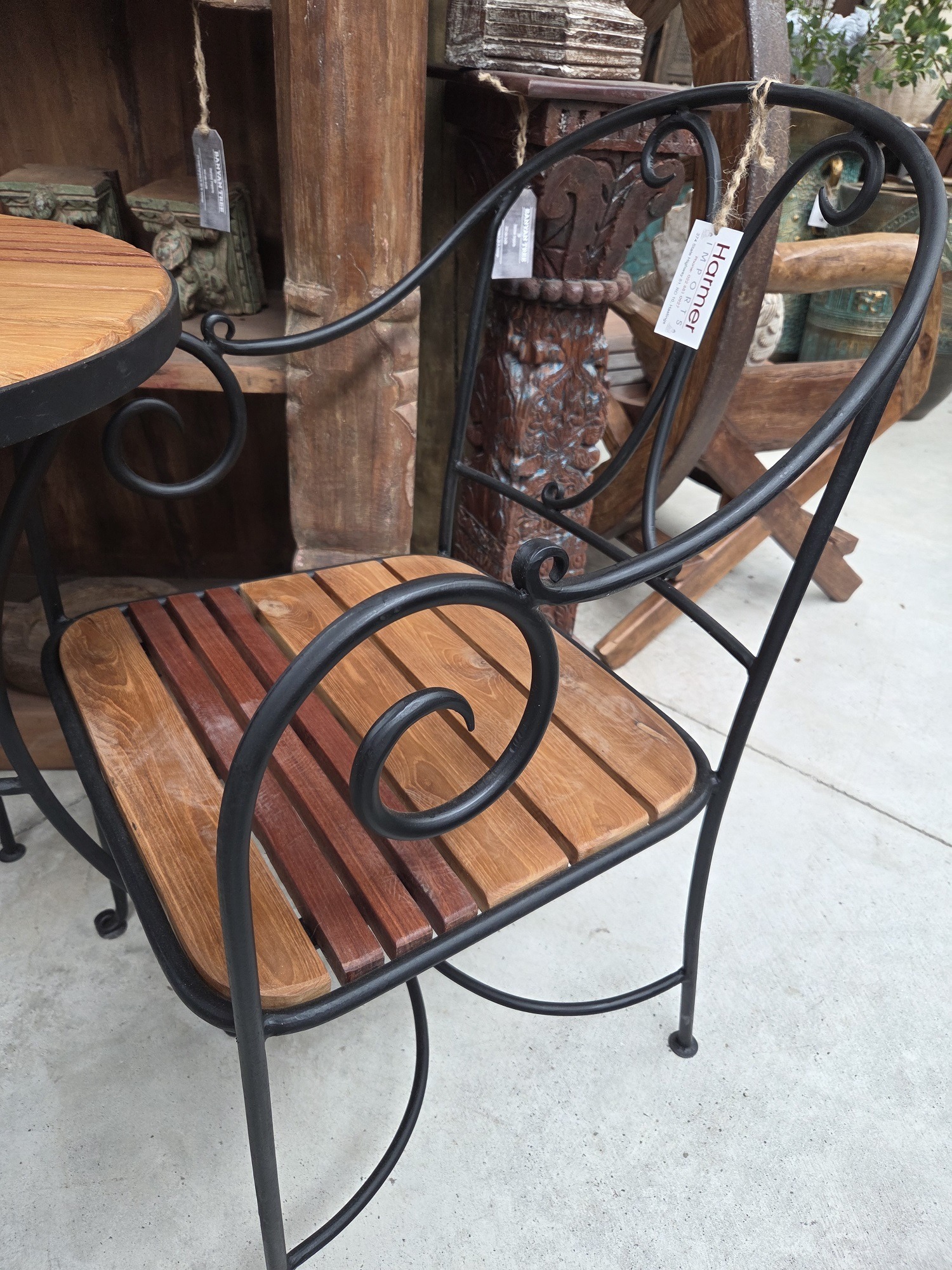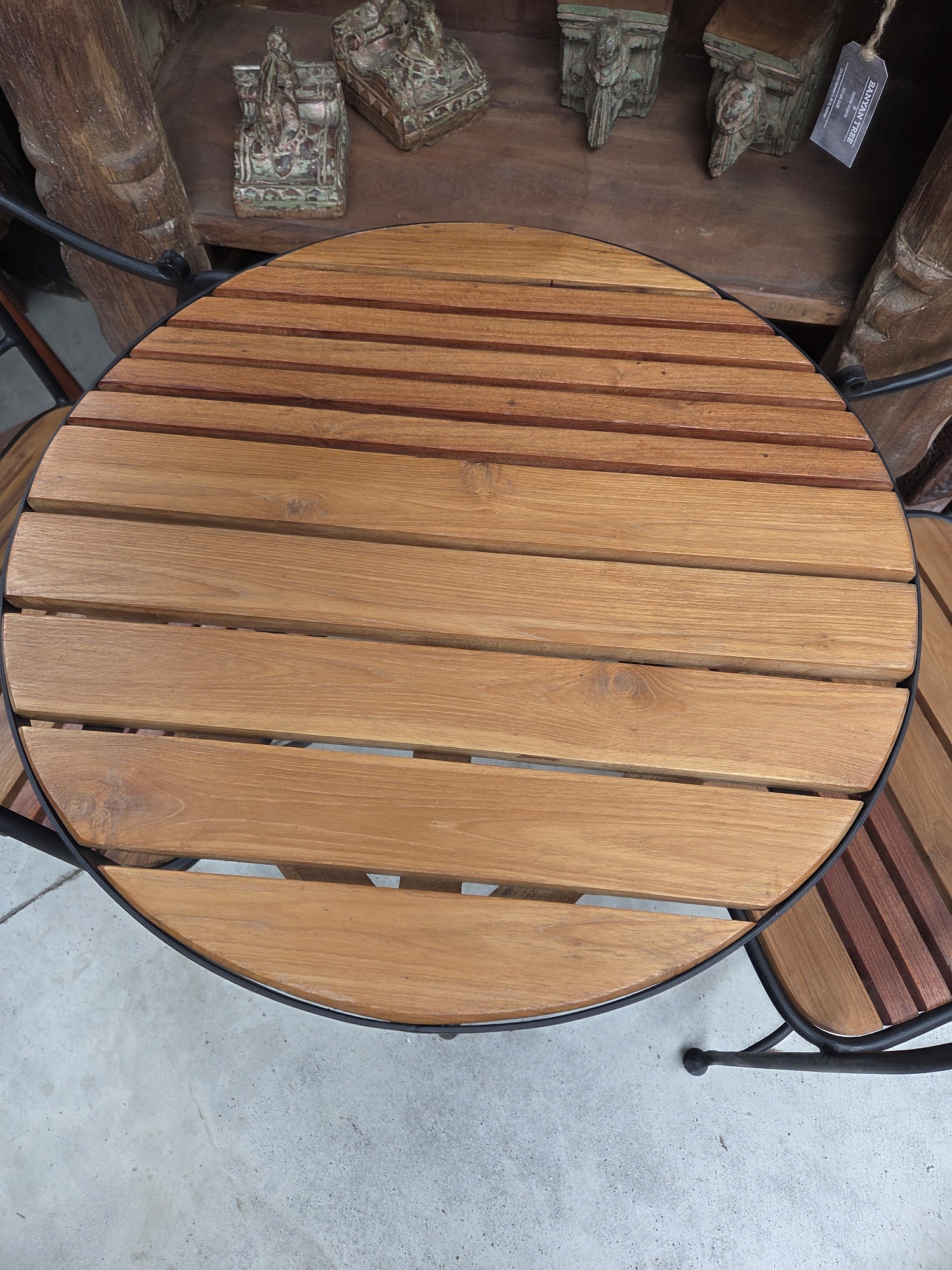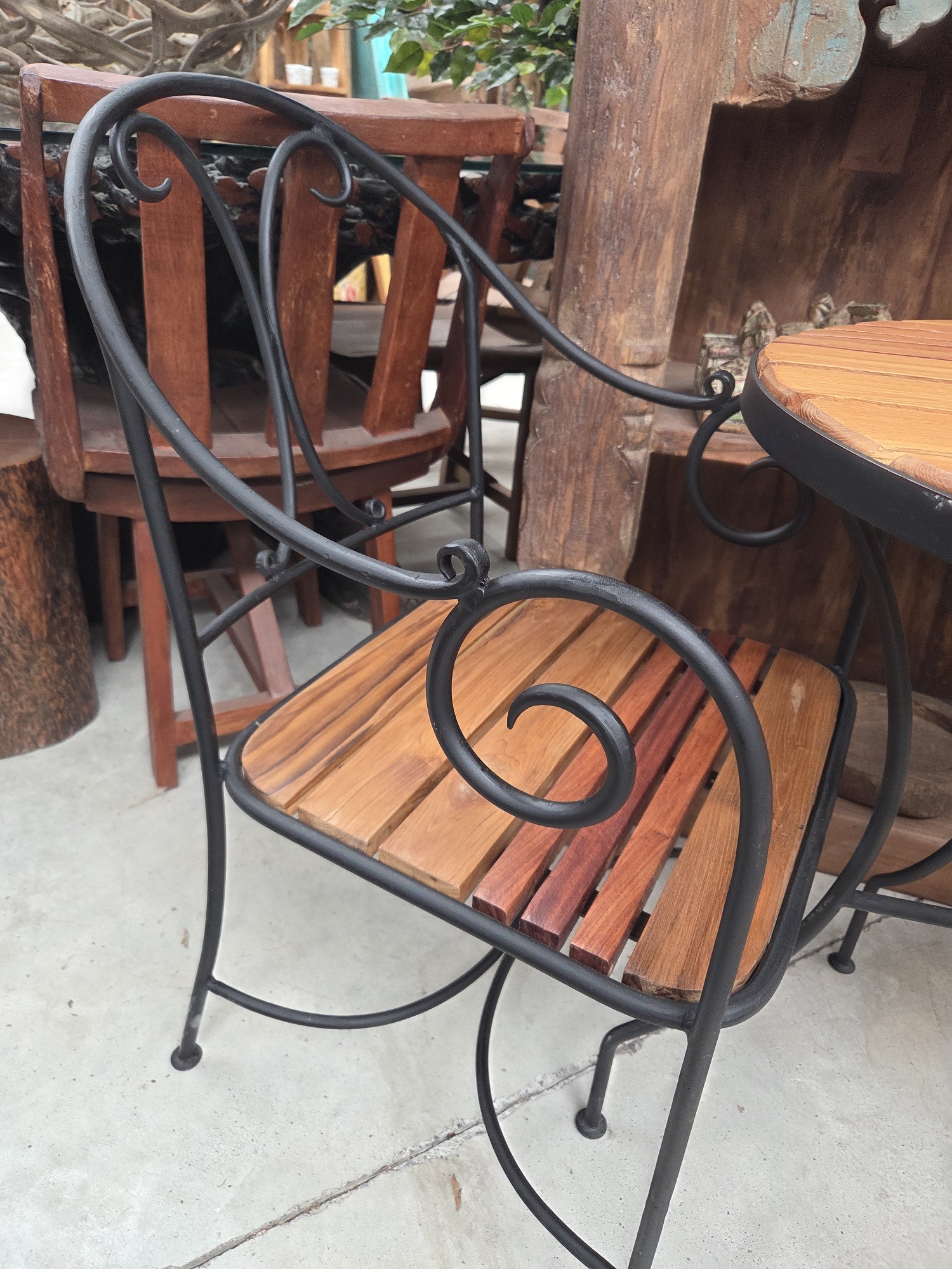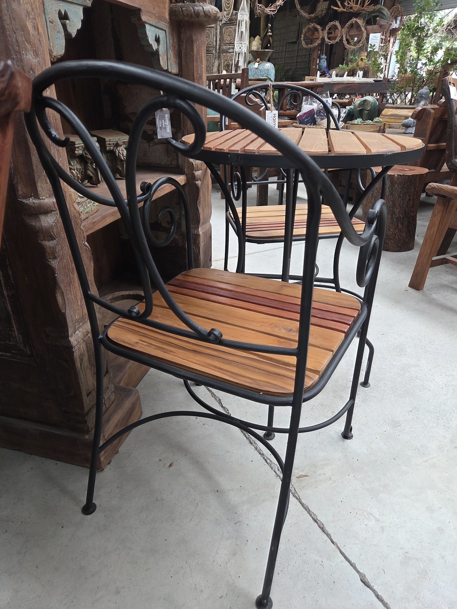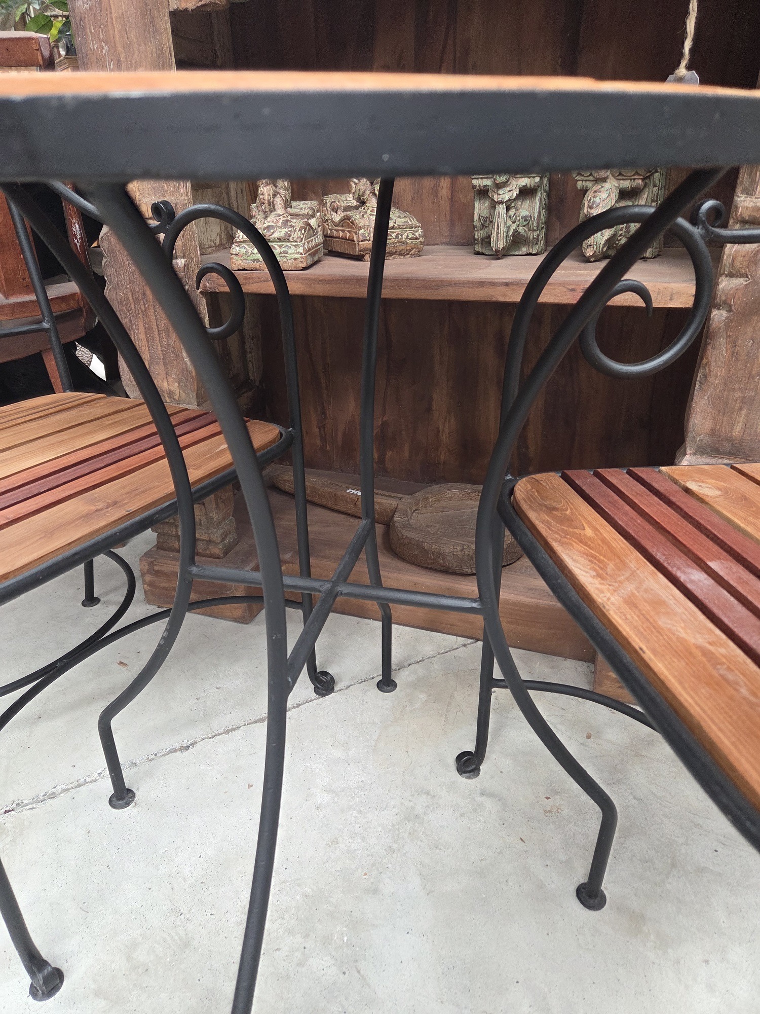A lovely wood and wrought iron cafe set. Perfect for a small balcony or terrace.