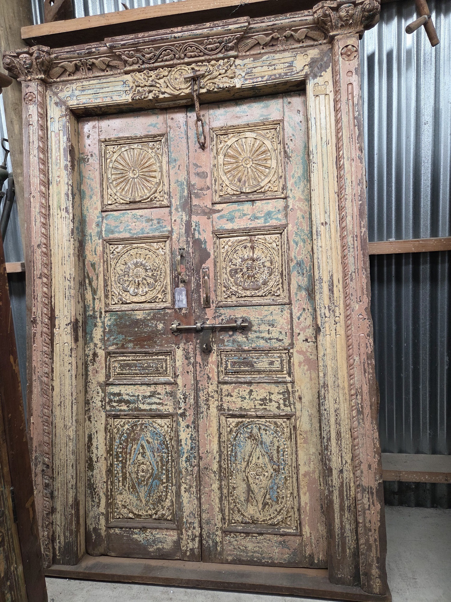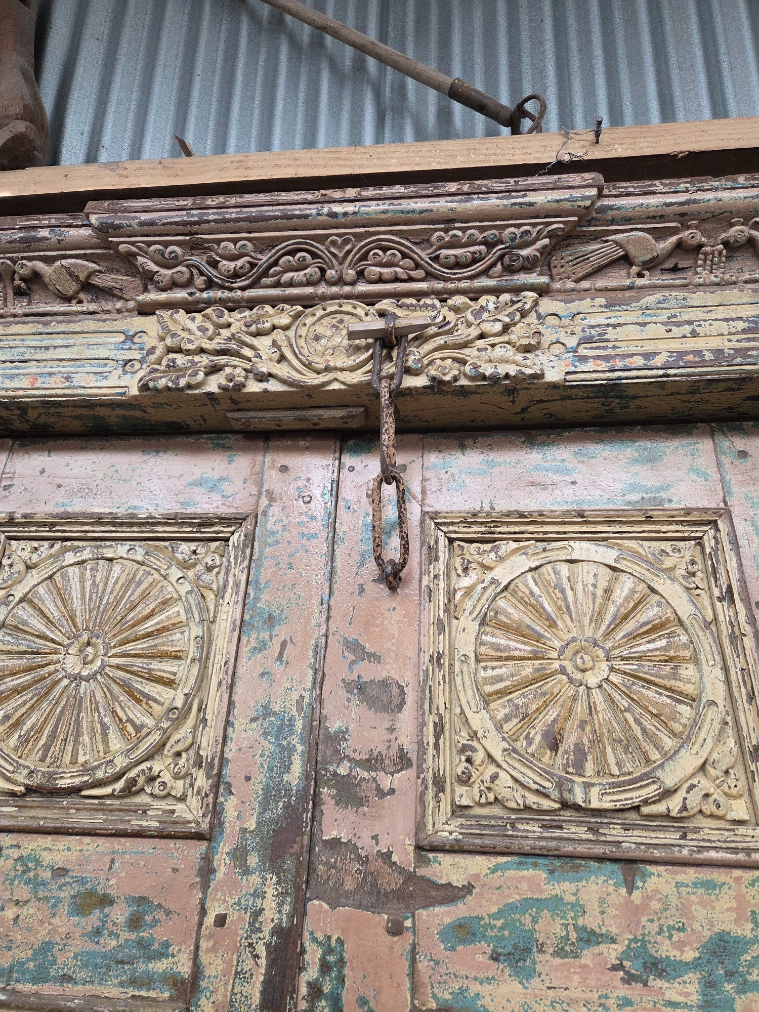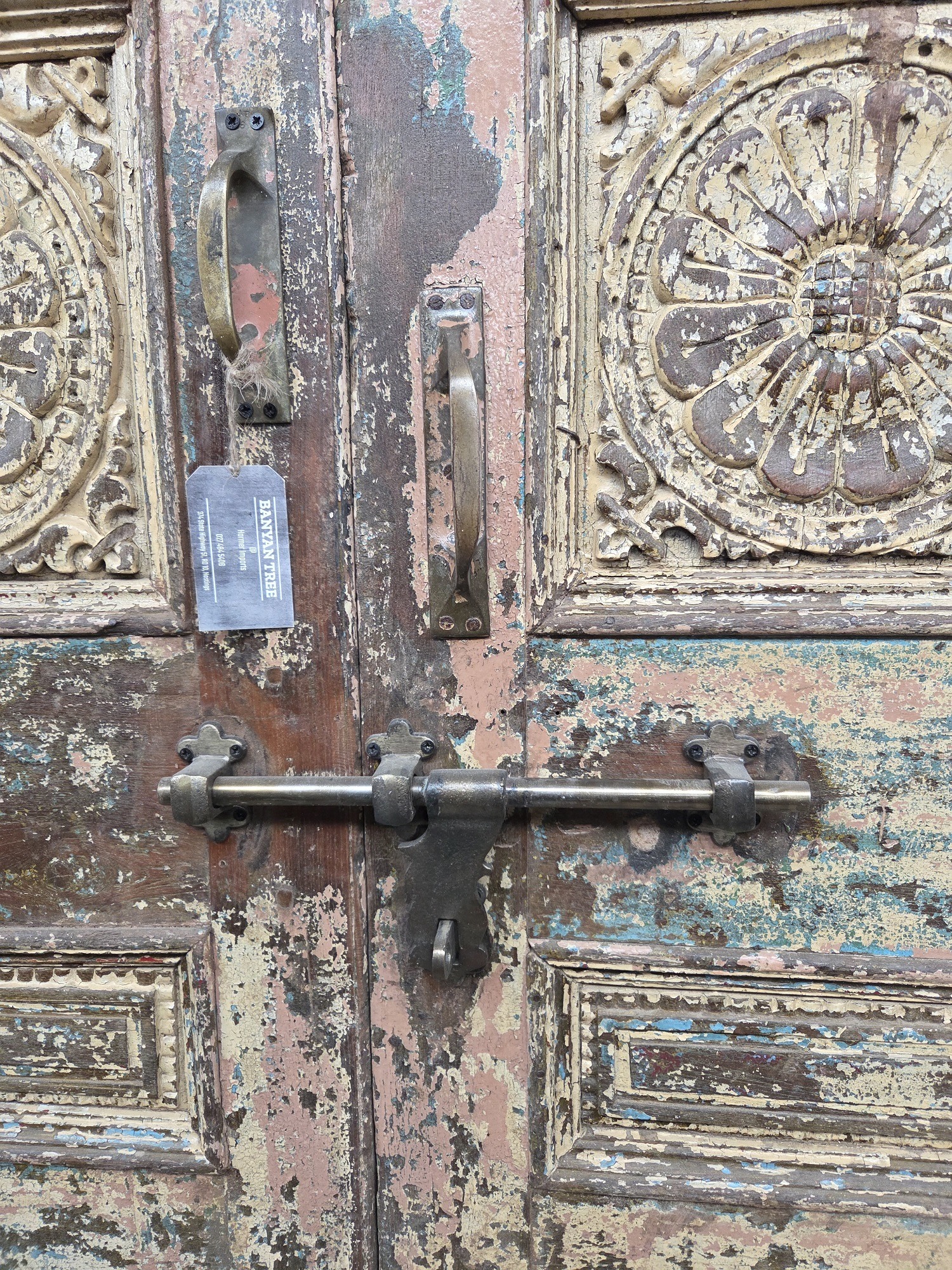 Our doors are all one of pieces which have been handpicked by us. The majority are salvaged from historic buildings, or Temples, from areas all around India. They are made from Teak wood and have been out in the weather for many years, so are suitable for outdoor use. They are hand carved and most have their original fittings. They are naturally aged, with their original patina.