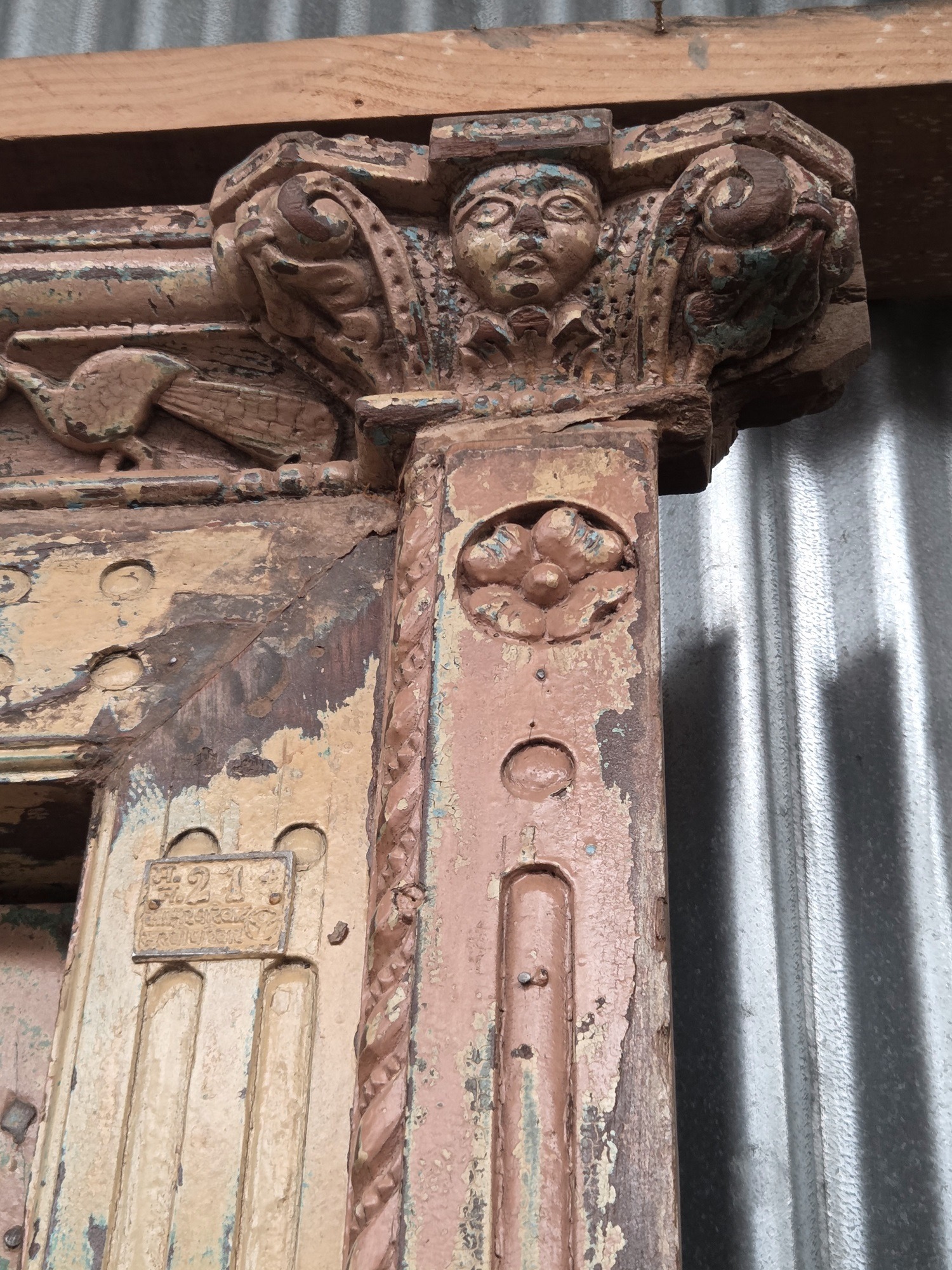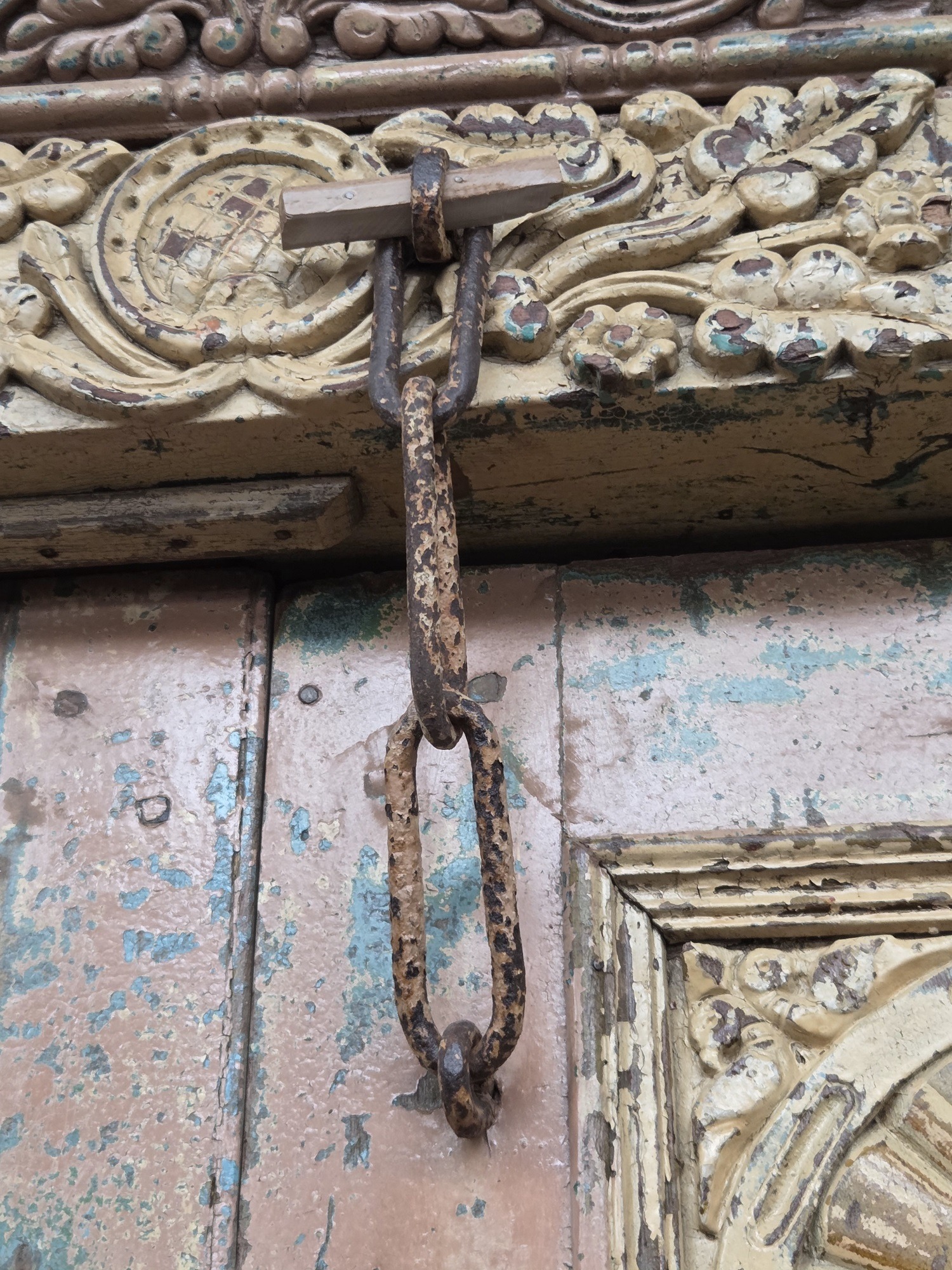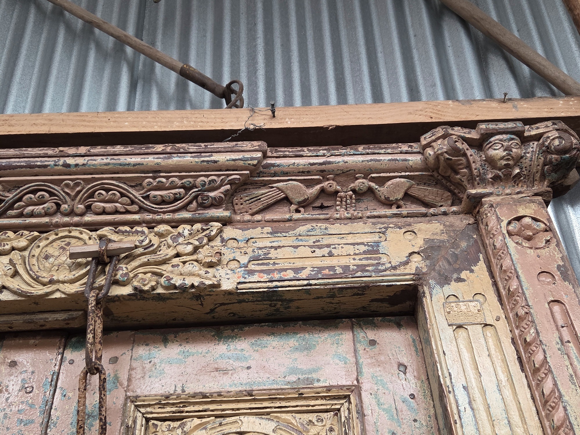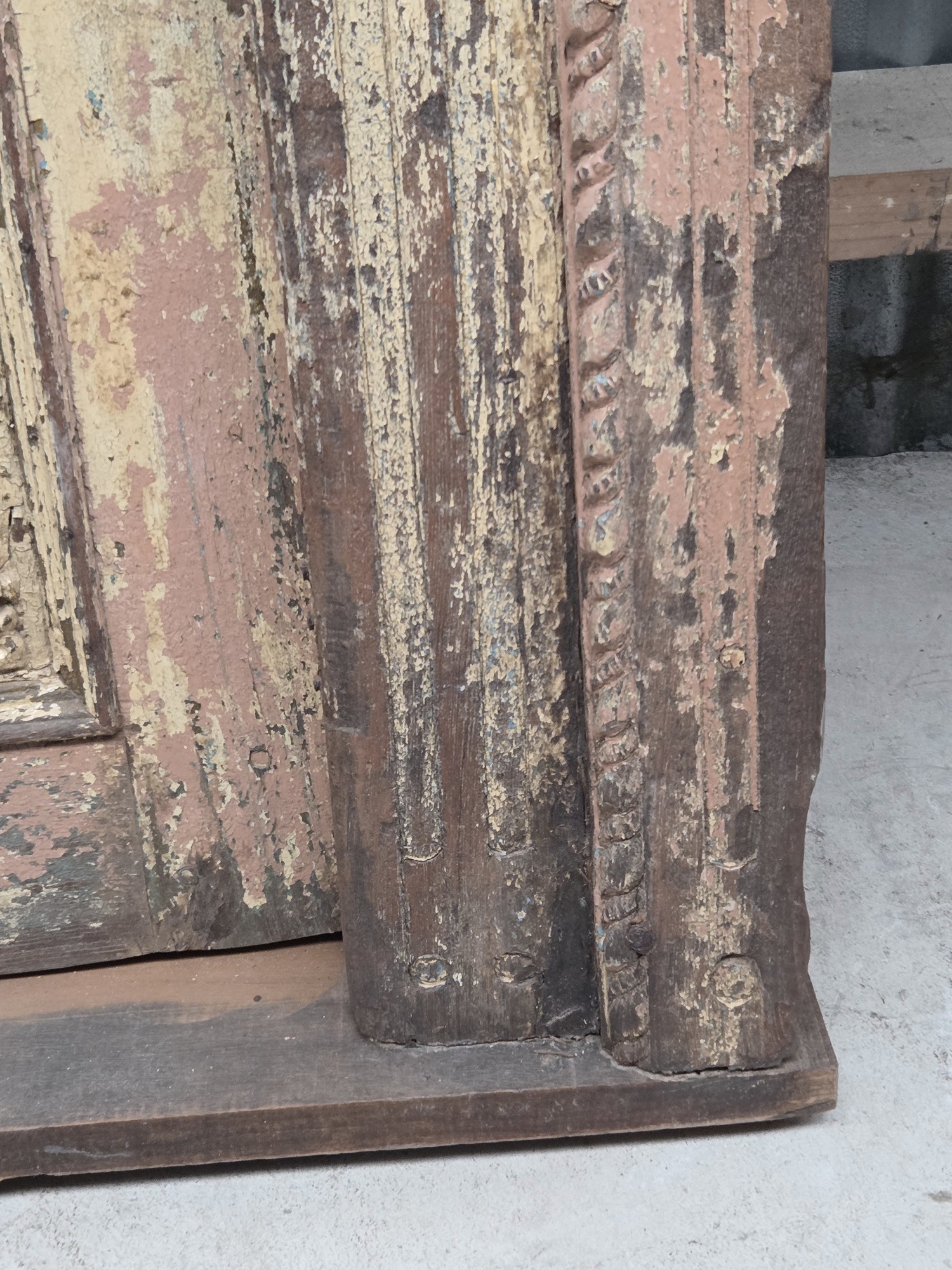 Our doors are all one of pieces which have been handpicked by us. The majority are salvaged from historic buildings, or Temples, from areas all around India. They are made from Teak wood and have been out in the weather for many years, so are suitable for outdoor use. They are hand carved and most have their original fittings. They are naturally aged, with their original patina.