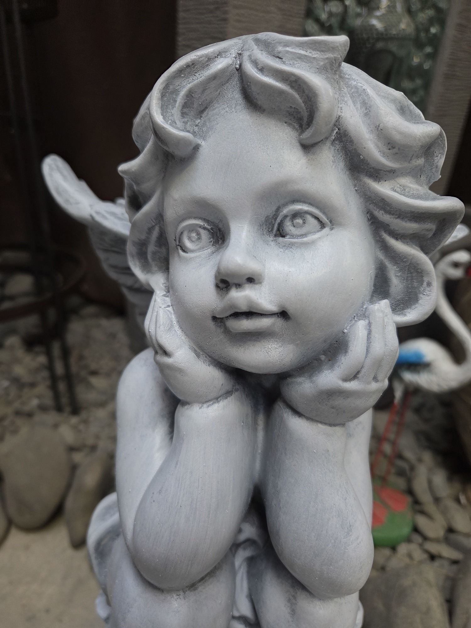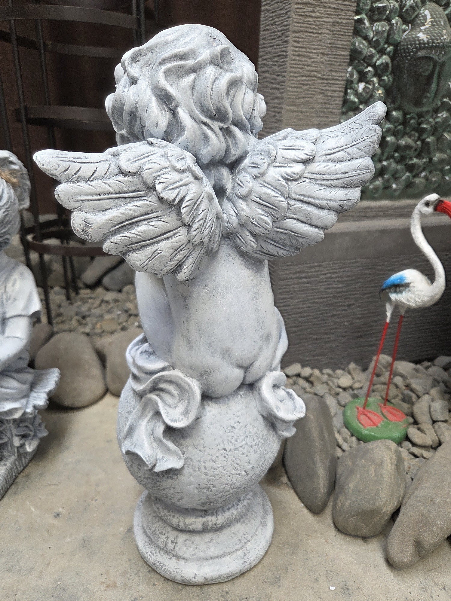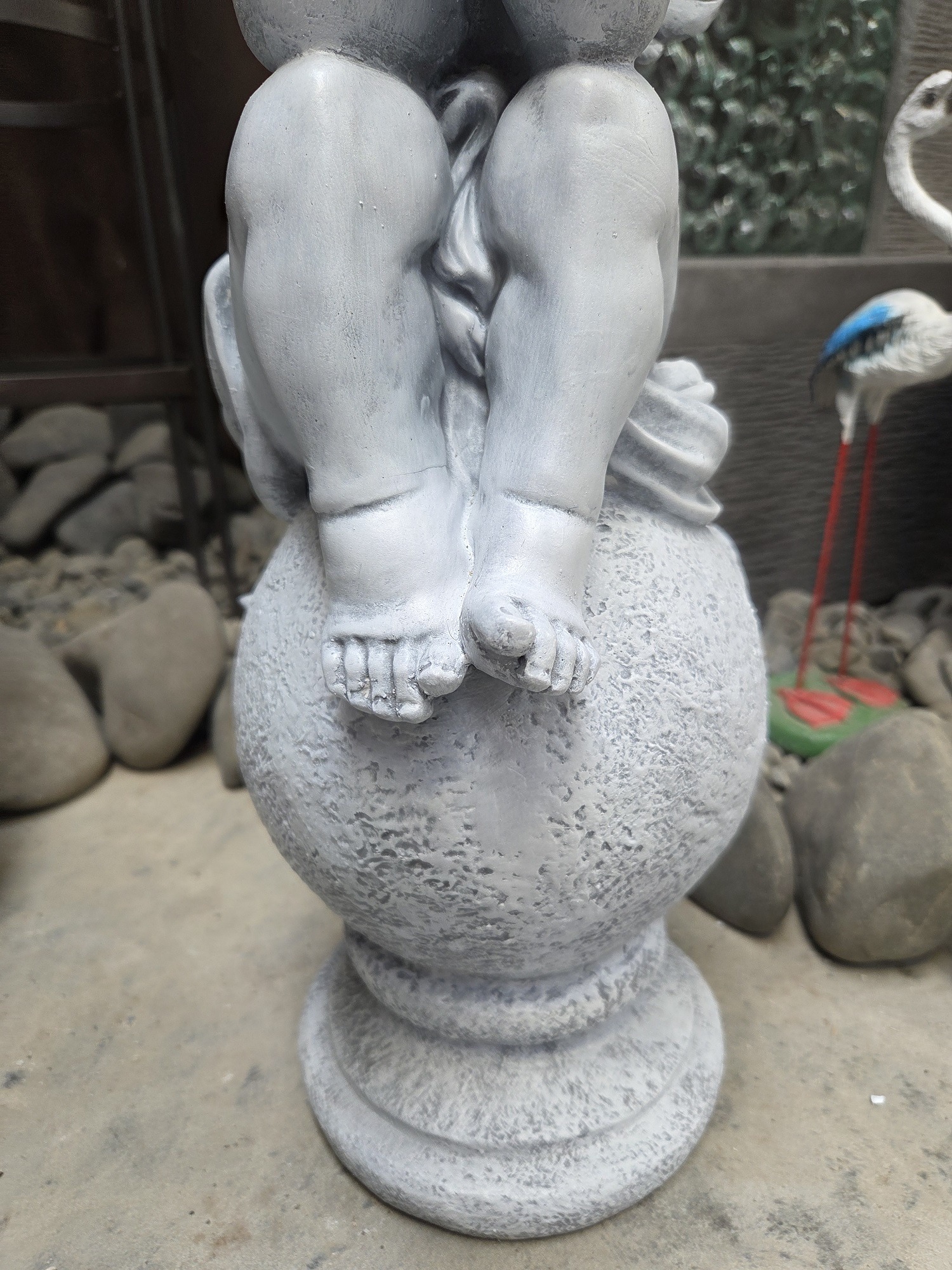 A lovely concrete statue of a cupid on a ball.