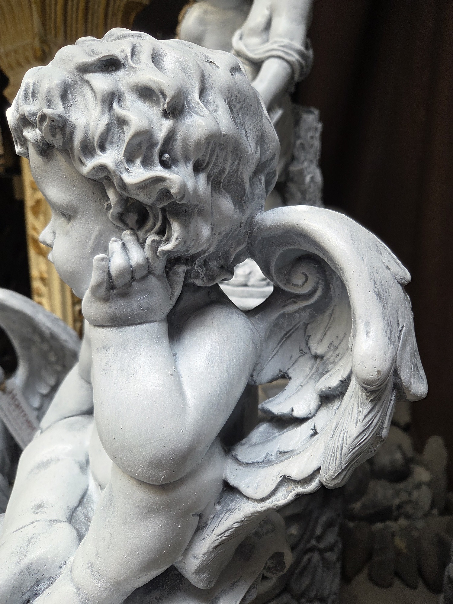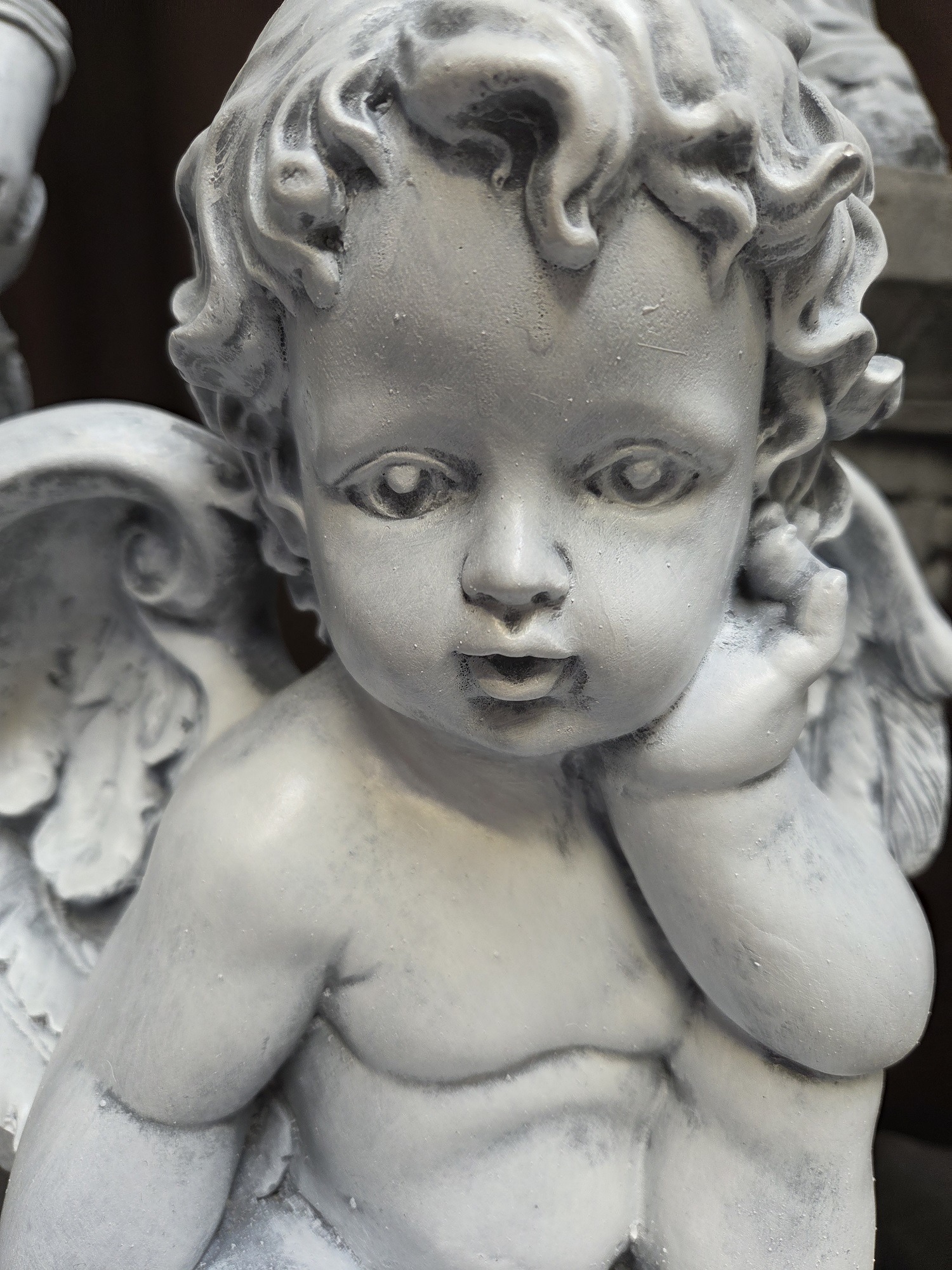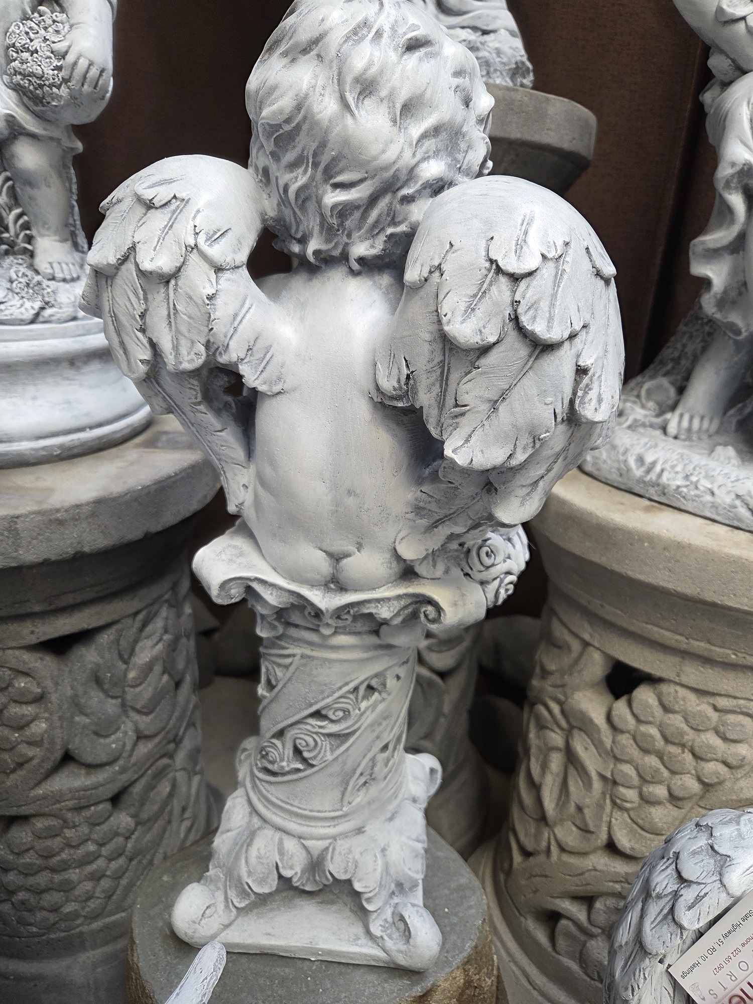 A lovely concrete statue of a cupid on a pedestal.