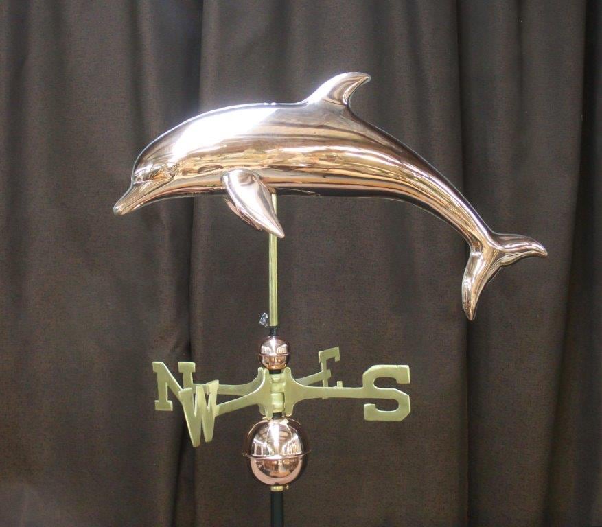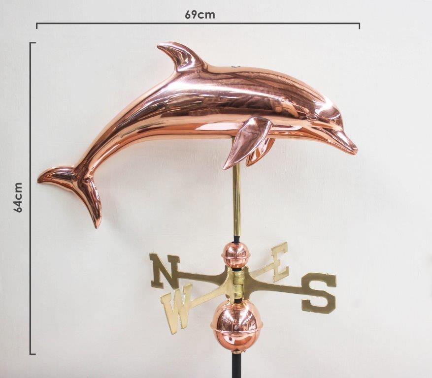 Enhance your home or garden with a stunning copper weathervane. Made from premium quality copper, our weathervanes are made to age gracefully, developing a rich patina over time that adds character and charm to any outdoor space. Perfect for rooftops, barns and garden posts. It’s meticulously crafted to provide both beauty and accurate wind direction. This Dolphin weathervane comes with a sturdy metal base plate making installation easy.