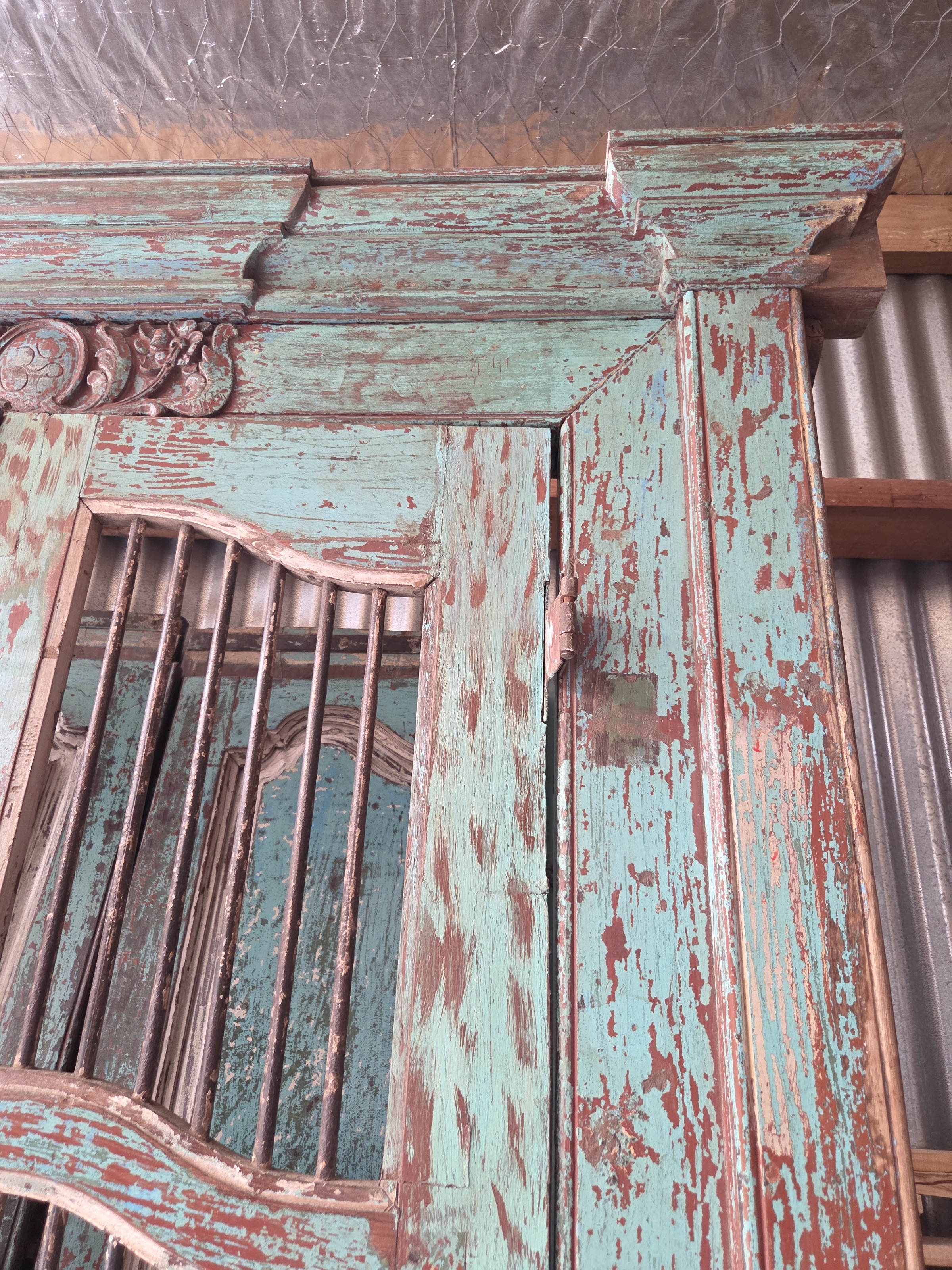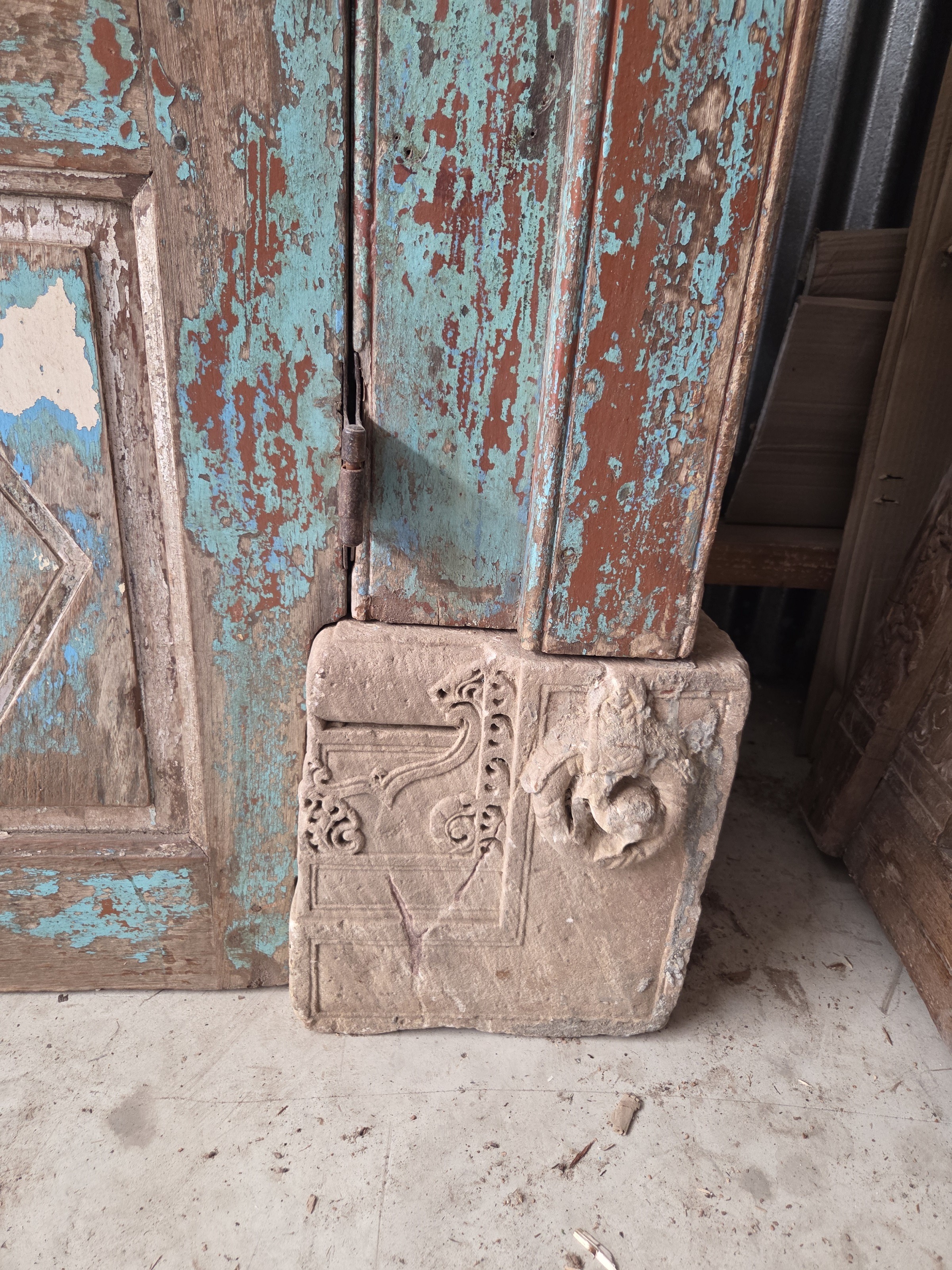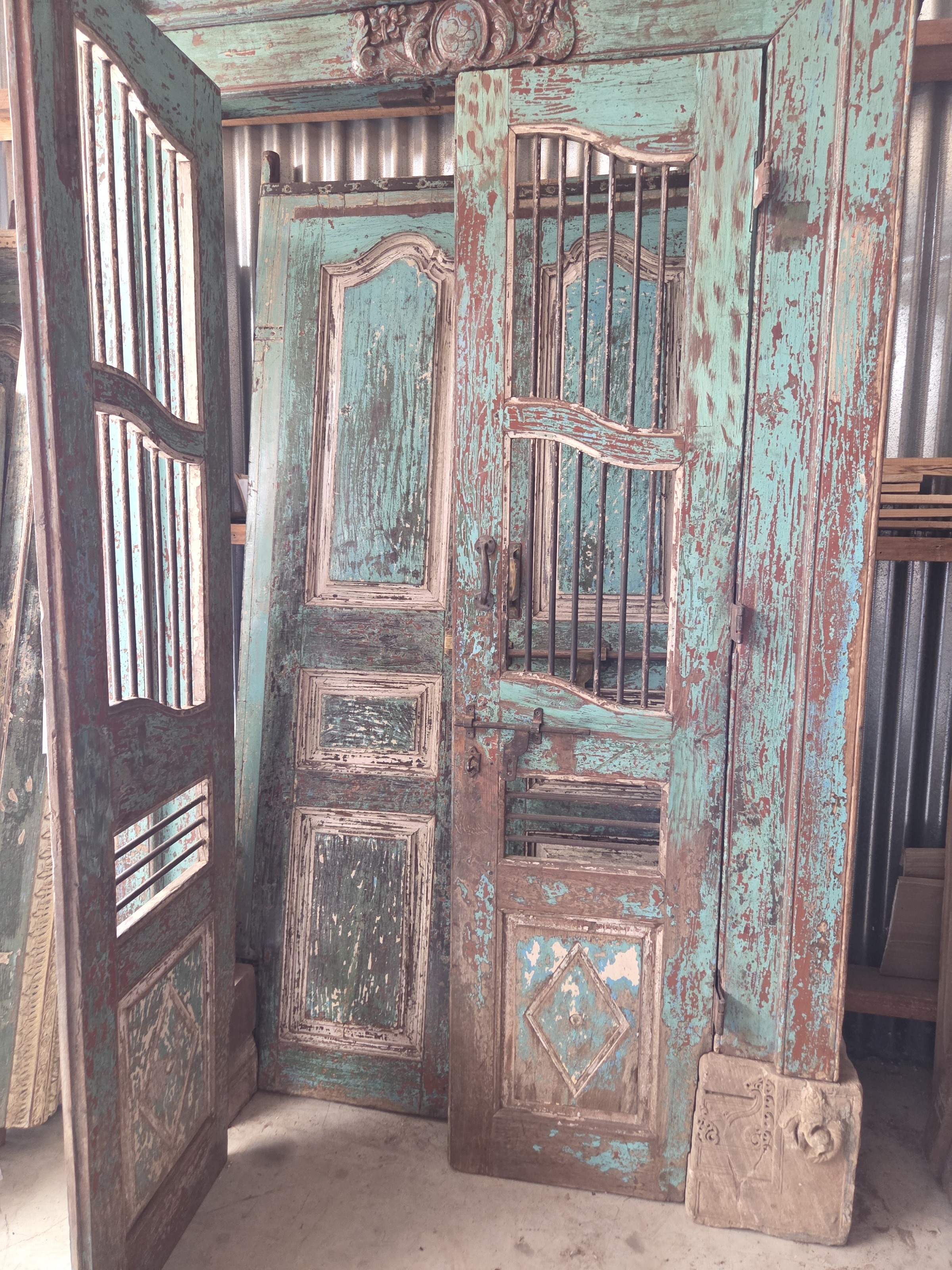 Our doors are all one of pieces which have been handpicked by us. The majority are salvaged from historic buildings, or Temples, from areas all around India. They are made from Teak wood and have been out in the weather for many years, so are suitable for outdoor use. They are hand carved and most have their original fittings. They are naturally aged, with their original patina.