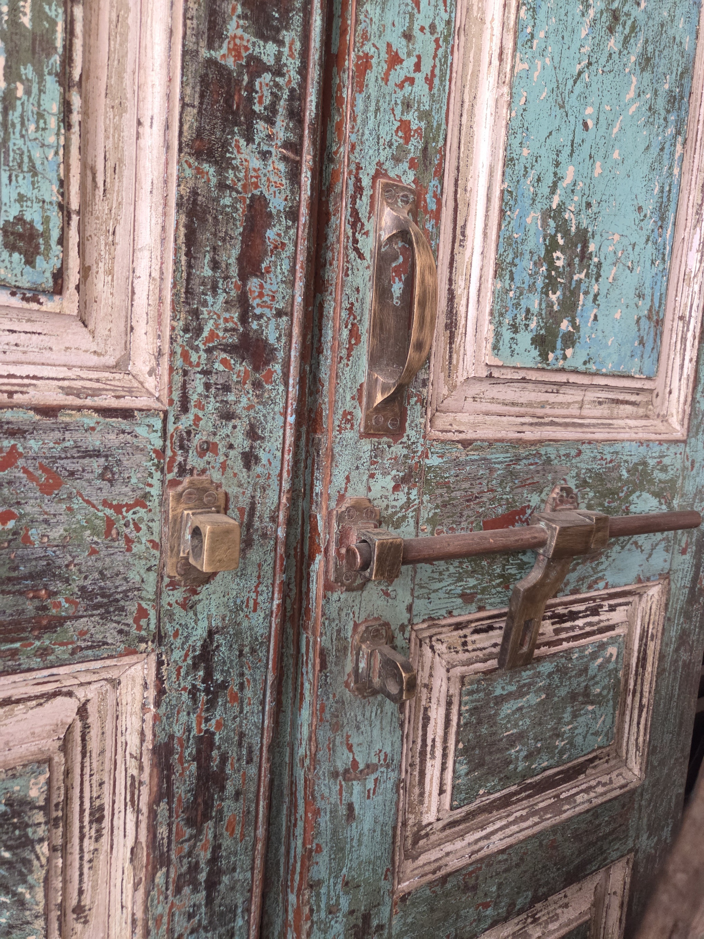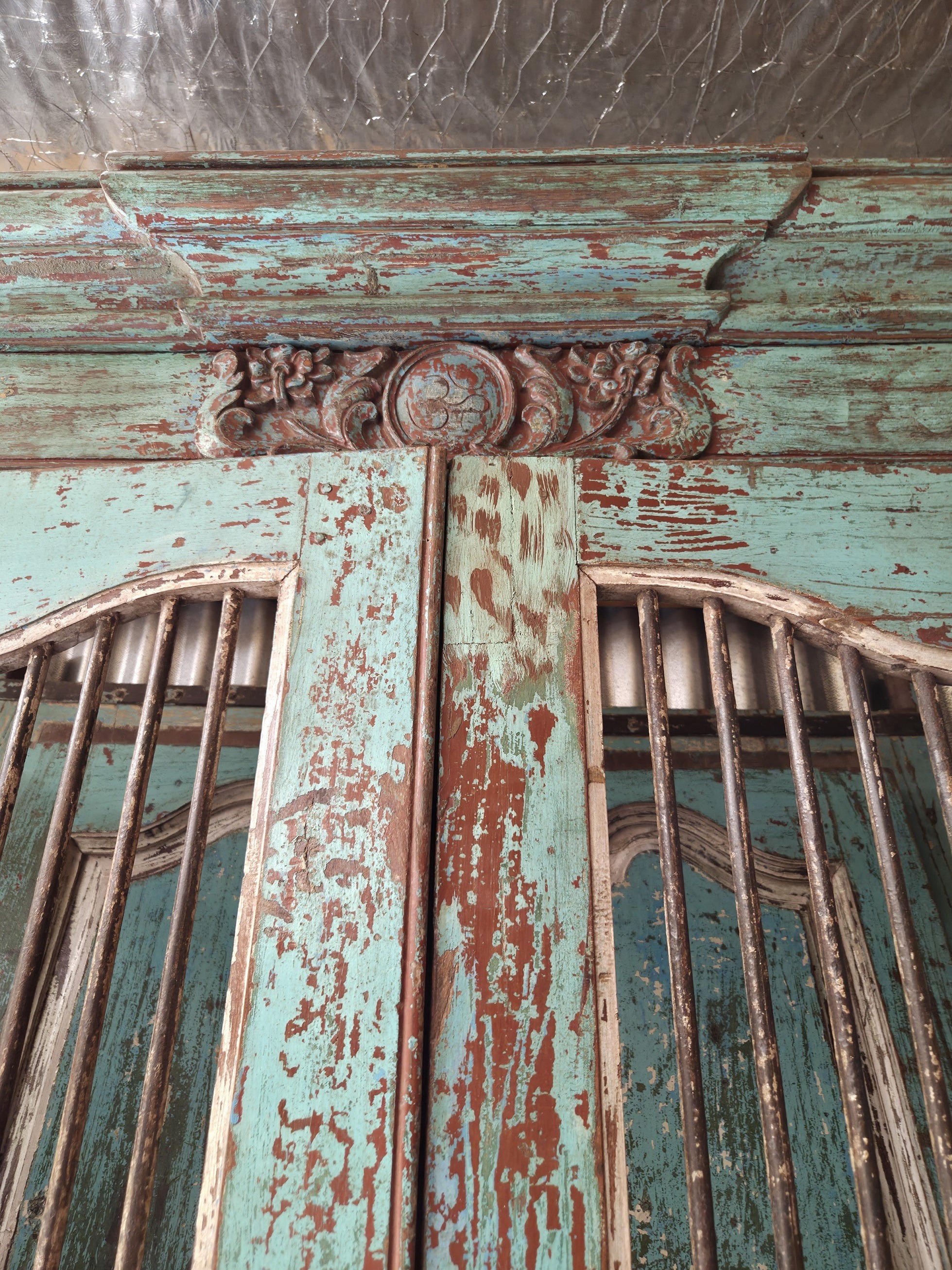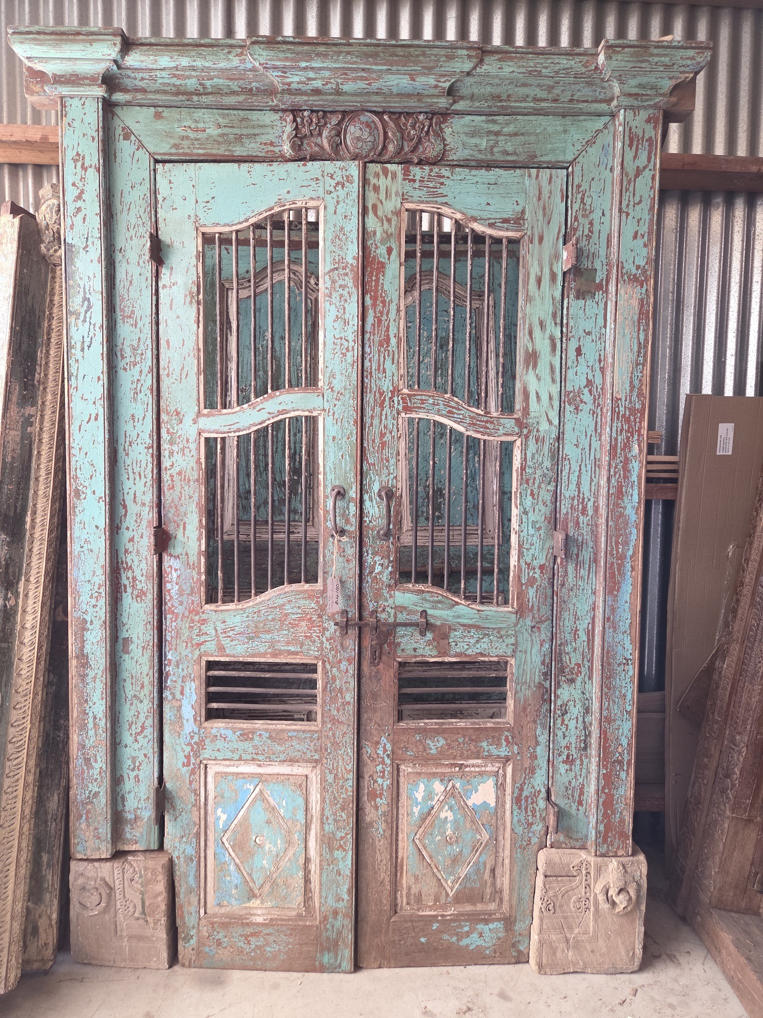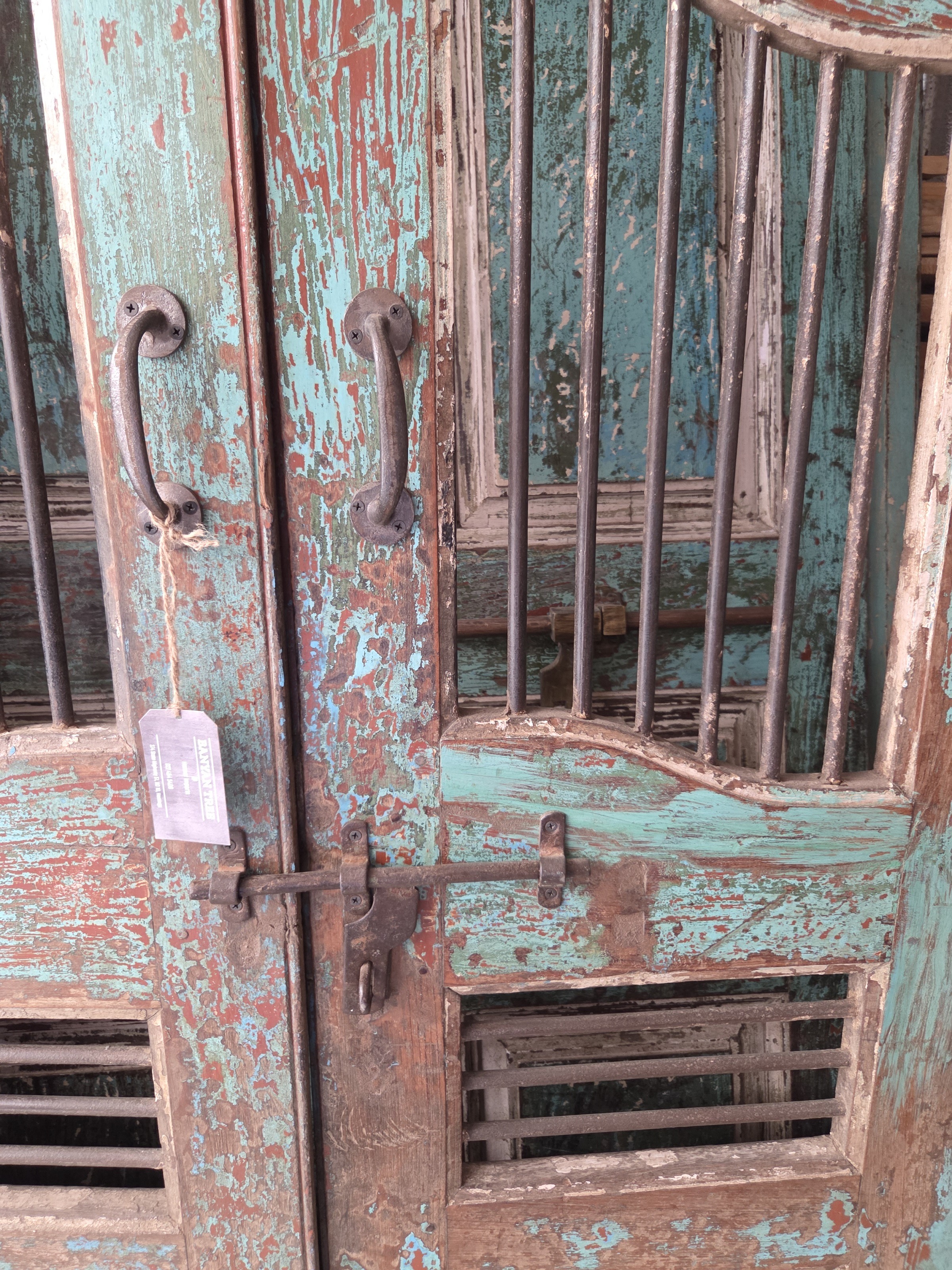 Our doors are all one of pieces which have been handpicked by us. The majority are salvaged from historic buildings, or Temples, from areas all around India. They are made from Teak wood and have been out in the weather for many years, so are suitable for outdoor use. They are hand carved and most have their original fittings. They are naturally aged, with their original patina.