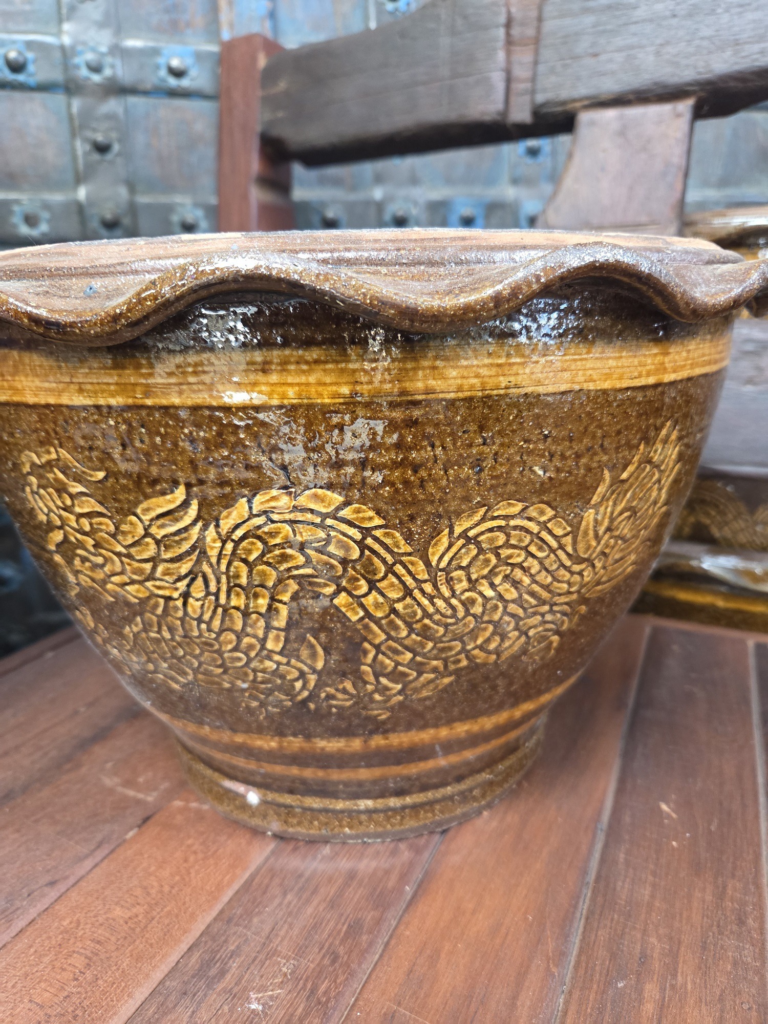 Thai Dragon pots (Ohng Mungkorn) are traditional, durable glazed stoneware featuring hand sculptured, raised dragon motifs. Traditionally used for storing rainwater, these versatile pots now commonly serve as decorative garden planters for trees, bamboo or lotus plants.