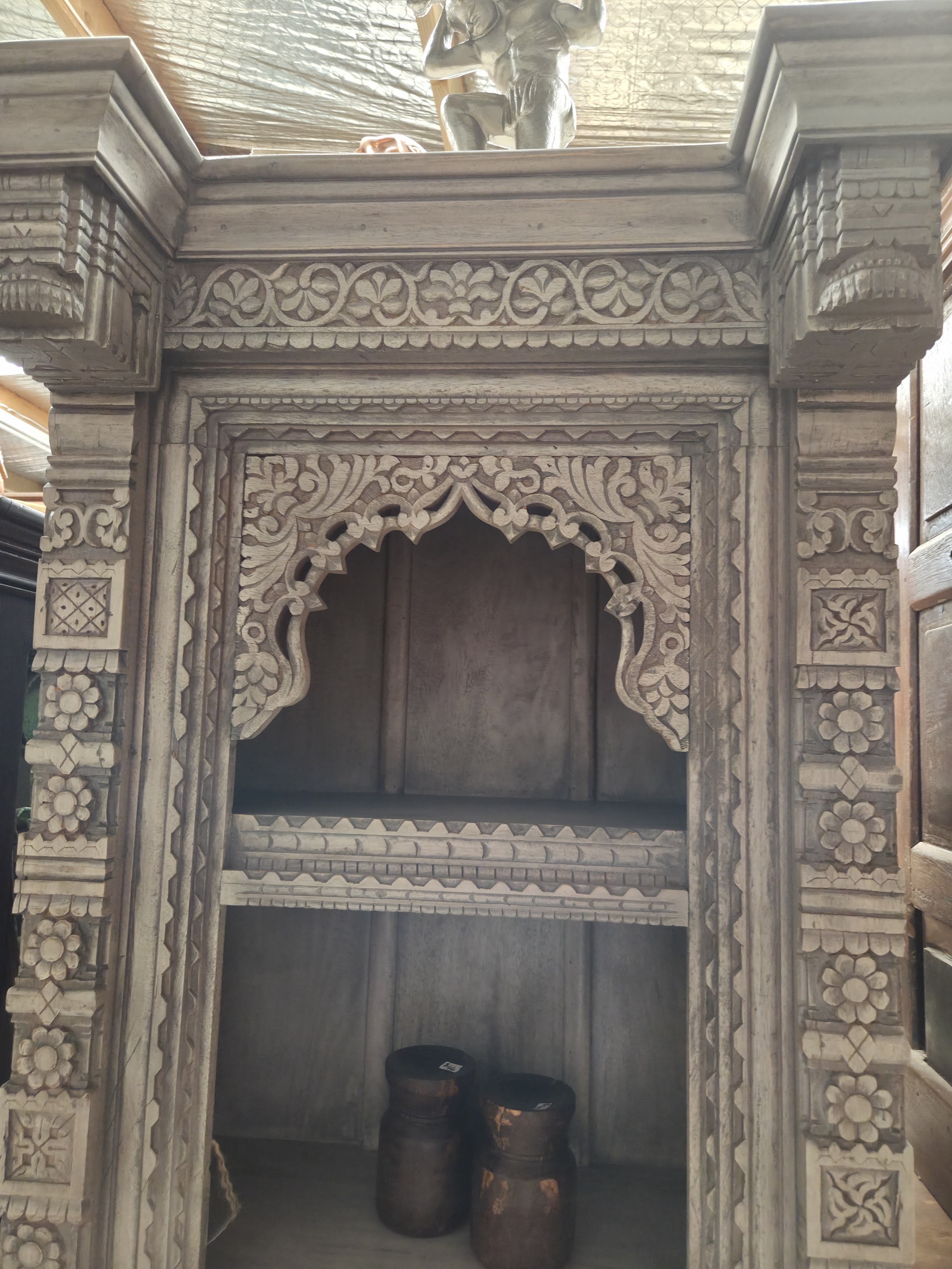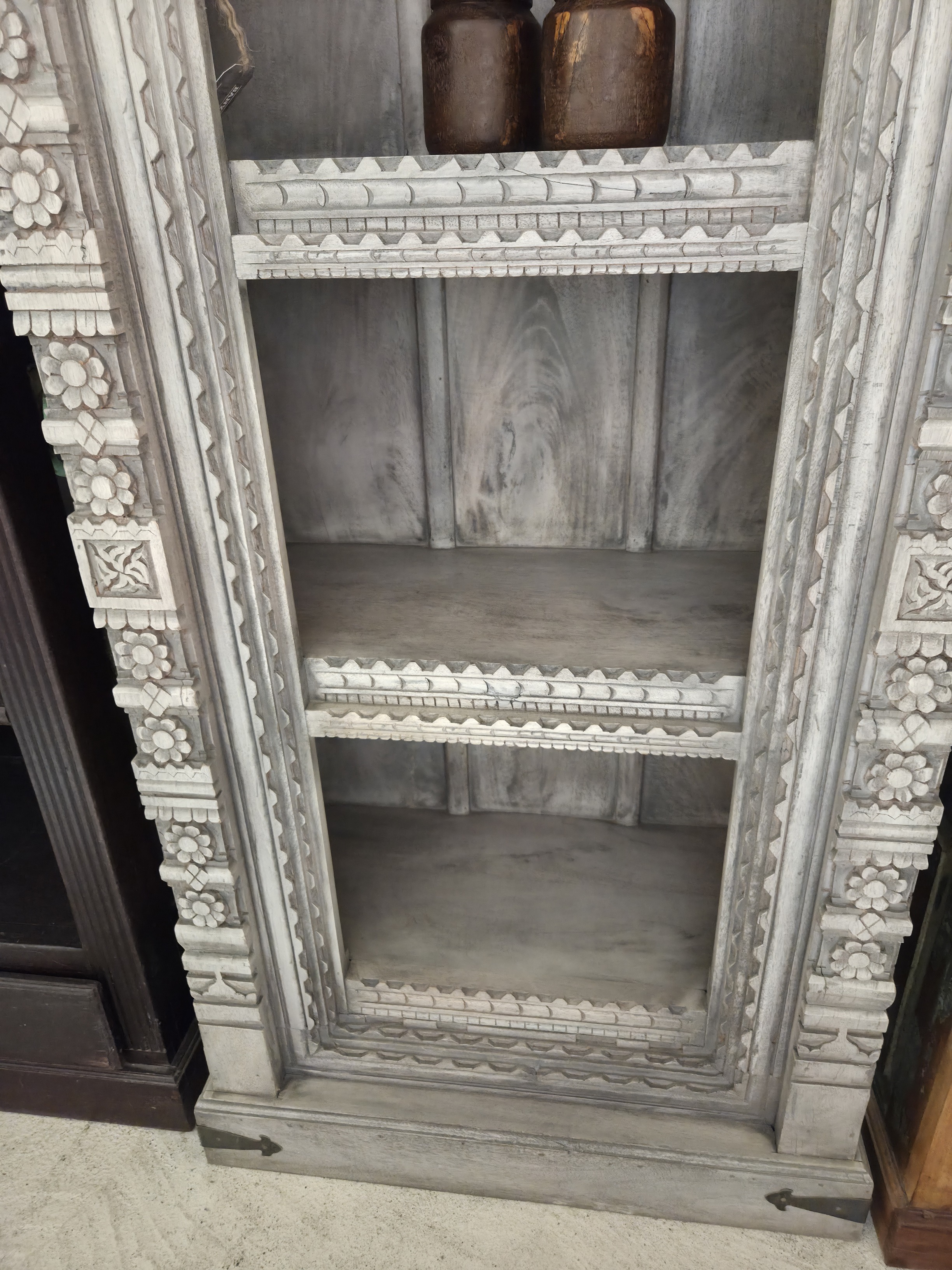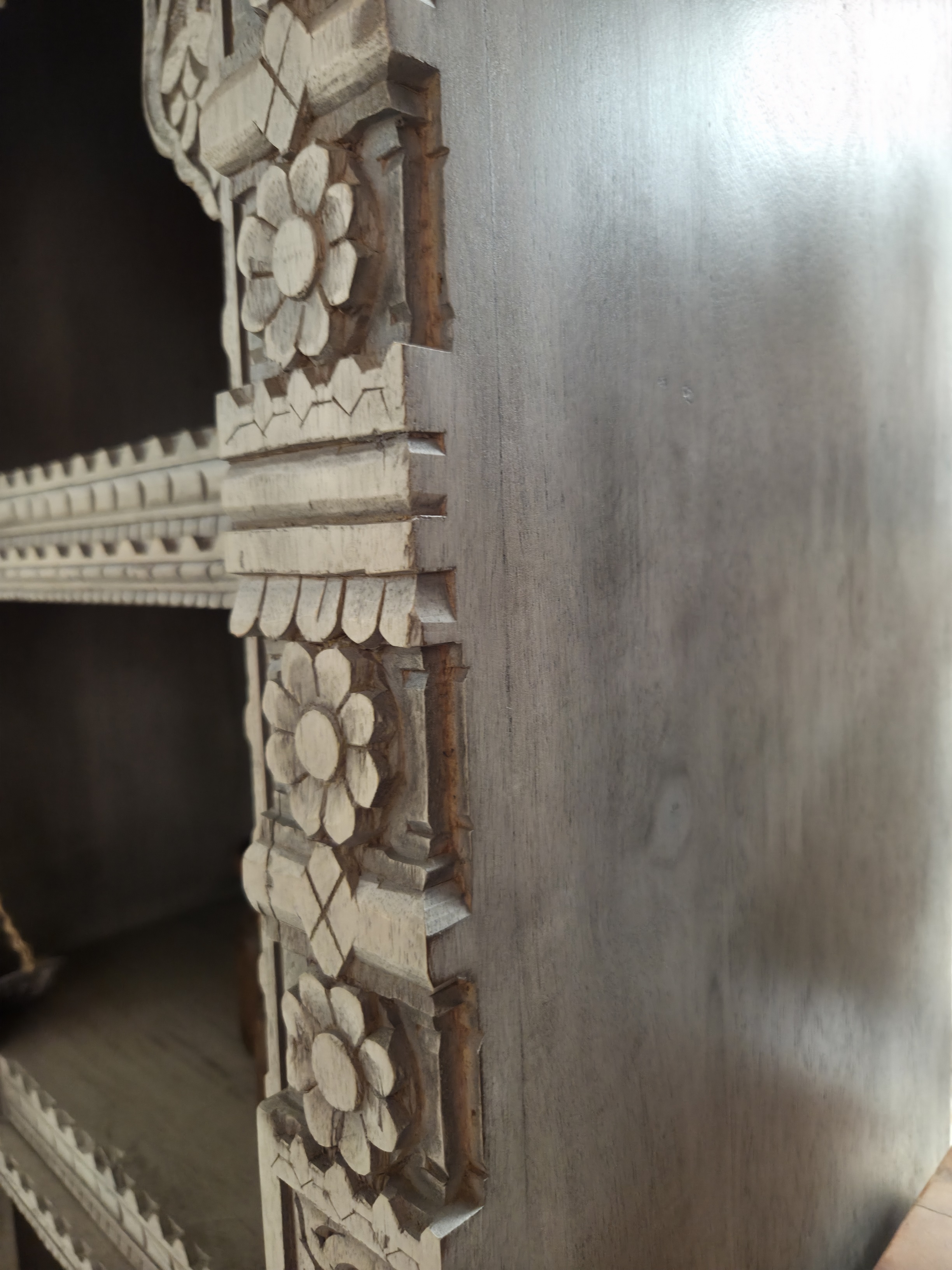 Lovely hand carved book case on recycled wood.
