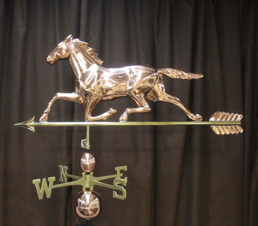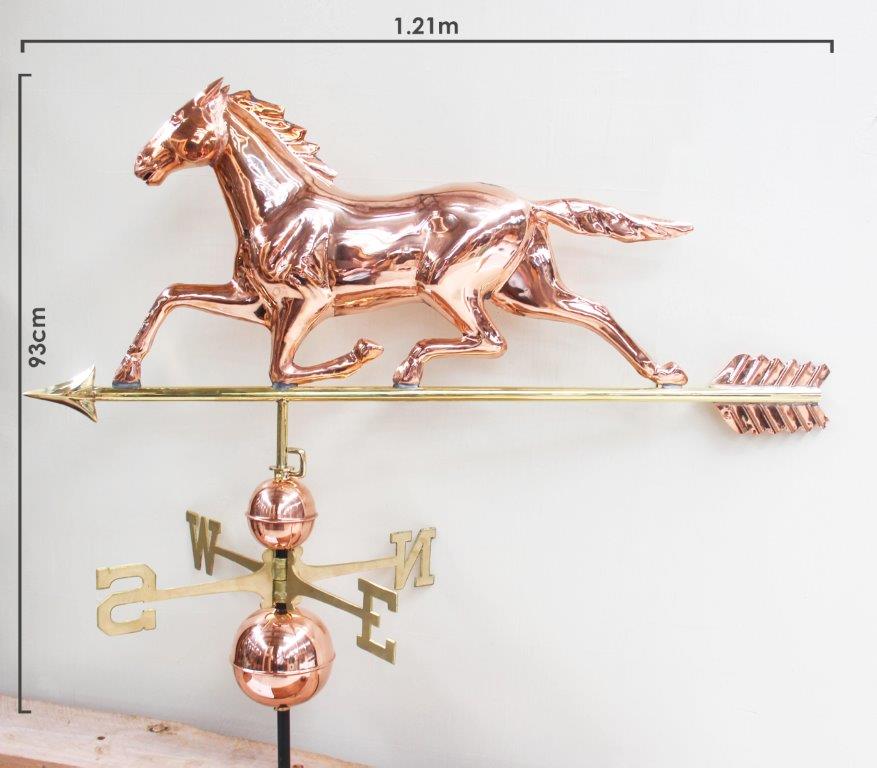 Enhance your home or garden with a stunning copper weathervane. Made from premium quality copper, our weathervanes are made to age gracefully, developing a rich patina over time that adds character and charm to any outdoor space. Perfect for rooftops, barns and garden posts. It’s meticulously crafted to provide both beauty and accurate wind direction. This Horse weathervane comes with a sturdy metal base plate making installation easy.