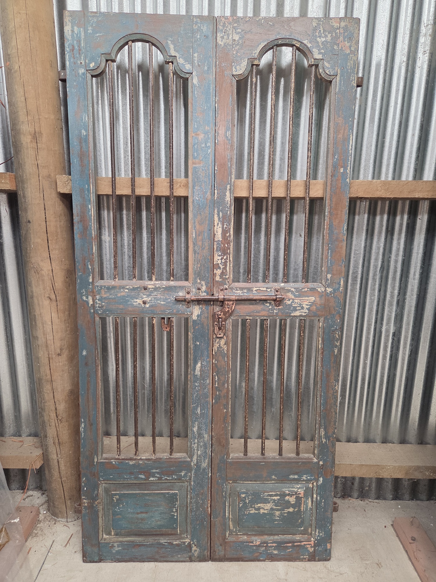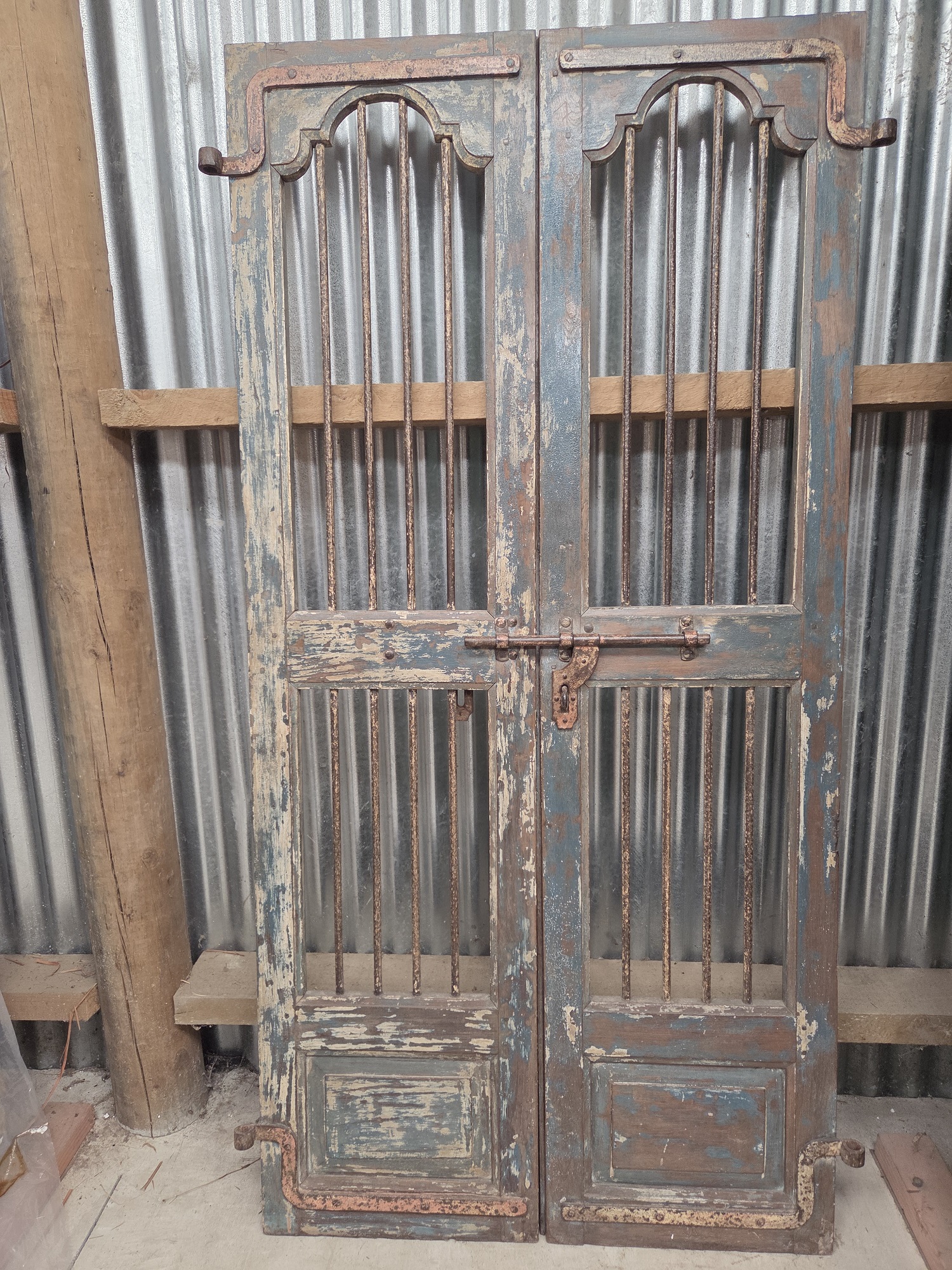 Antique Indian Jali gates are traditionally crafted, intricately designed lattice doors and gates, often featuring teak wood and wrought iron, originating from 19th century havelis in Gujarat and Rajasthan. These durable, ornate pieces provide security, ventilation, and privacy, commonly used today as decorative garden gates, entrance doors, or unique interior decor. They often have a rich, worn patina with original iron fittings.