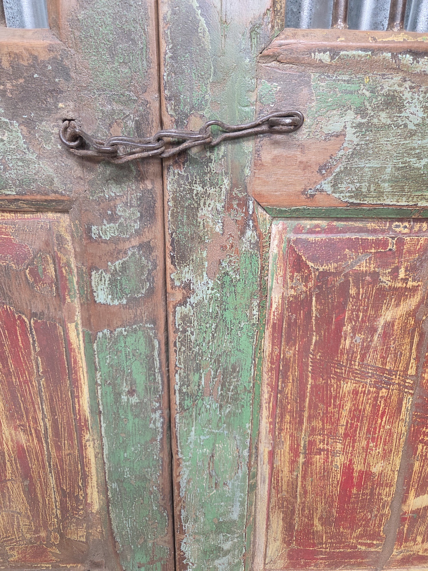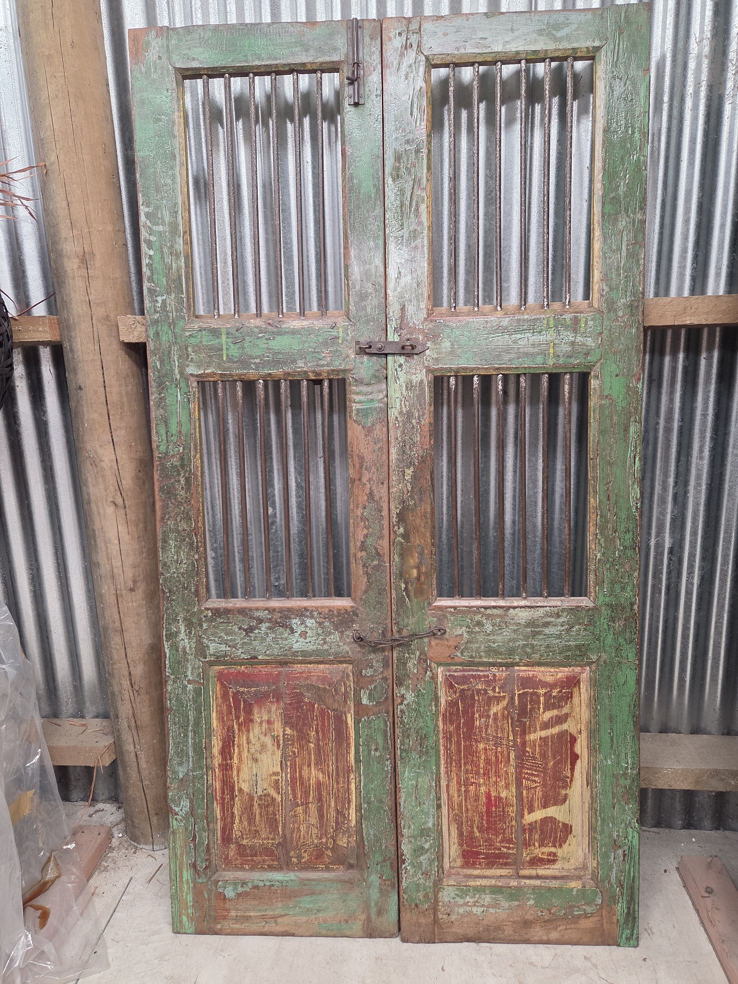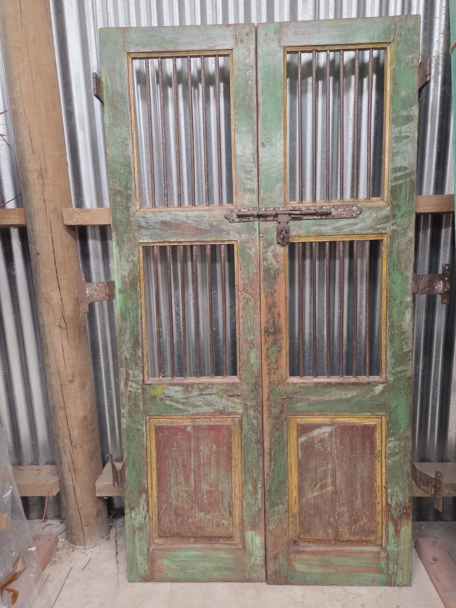 Antique Indian Jali gates are traditionally crafted, intricately designed lattice doors and gates, often featuring teak wood and wrought iron, originating from 19th century havelis in Gujarat and Rajasthan. These durable, ornate pieces provide security, ventilation, and privacy, commonly used today as decorative garden gates, entrance doors, or unique interior decor. They often have a rich, worn patina with original iron fittings.