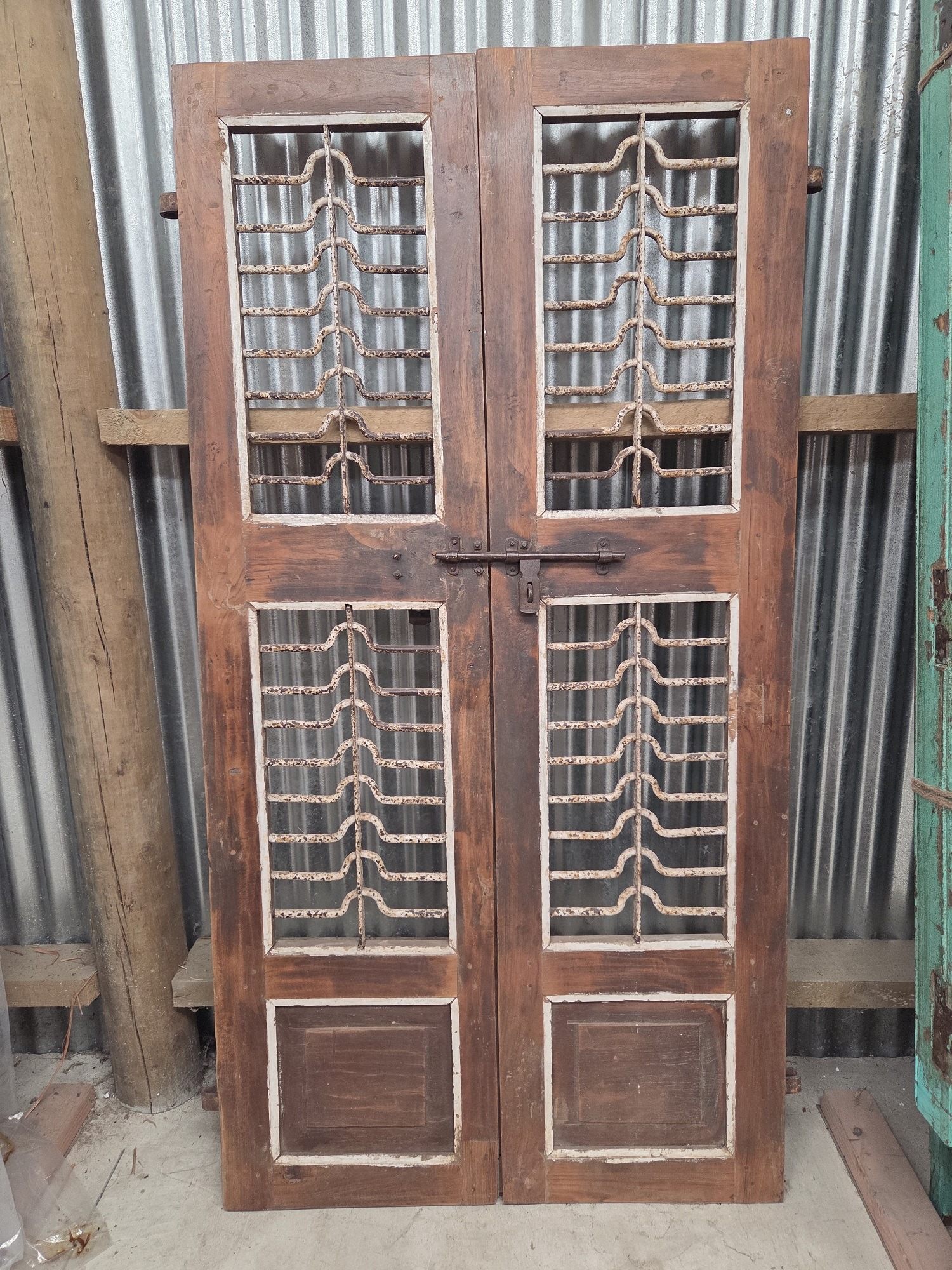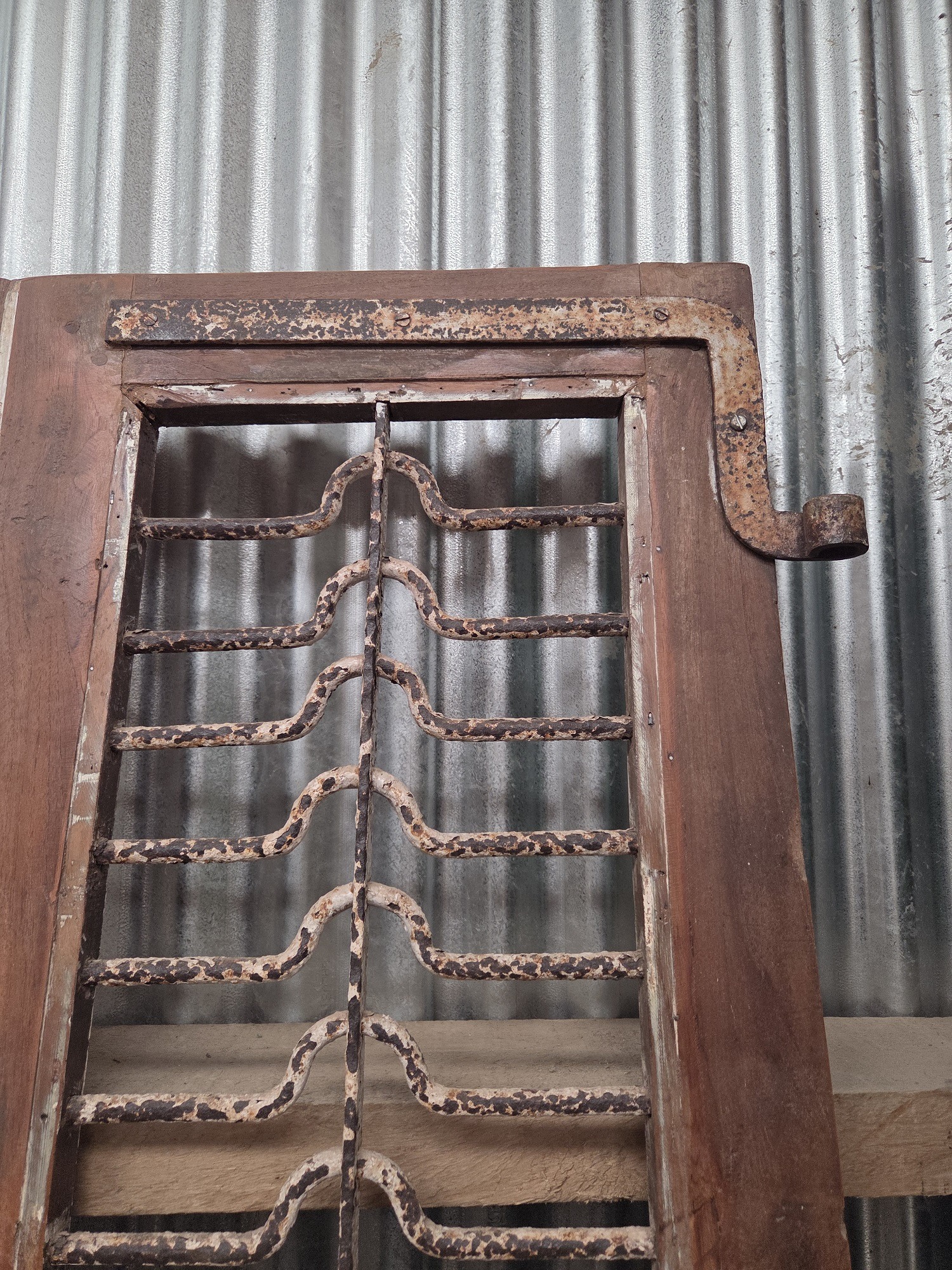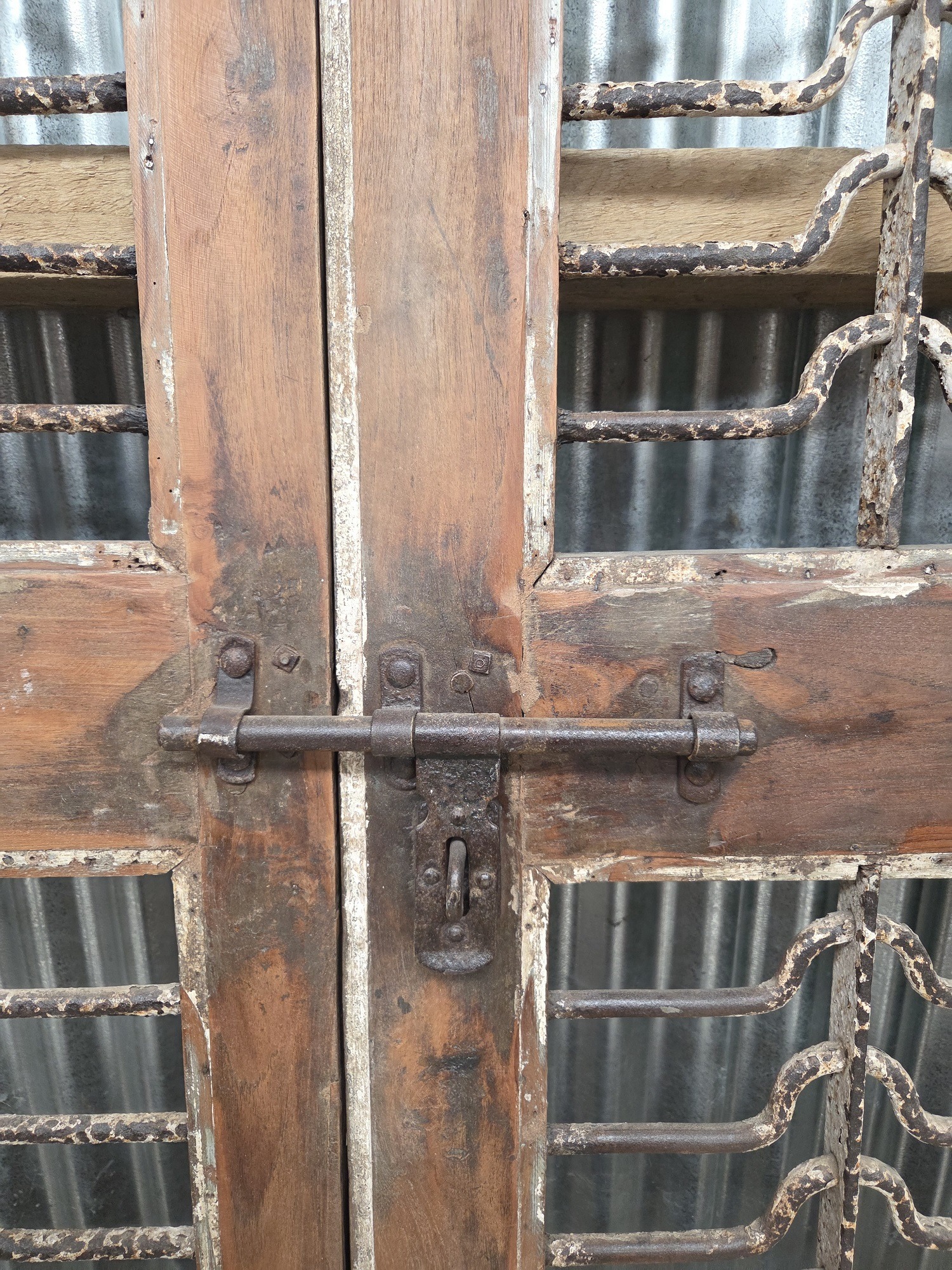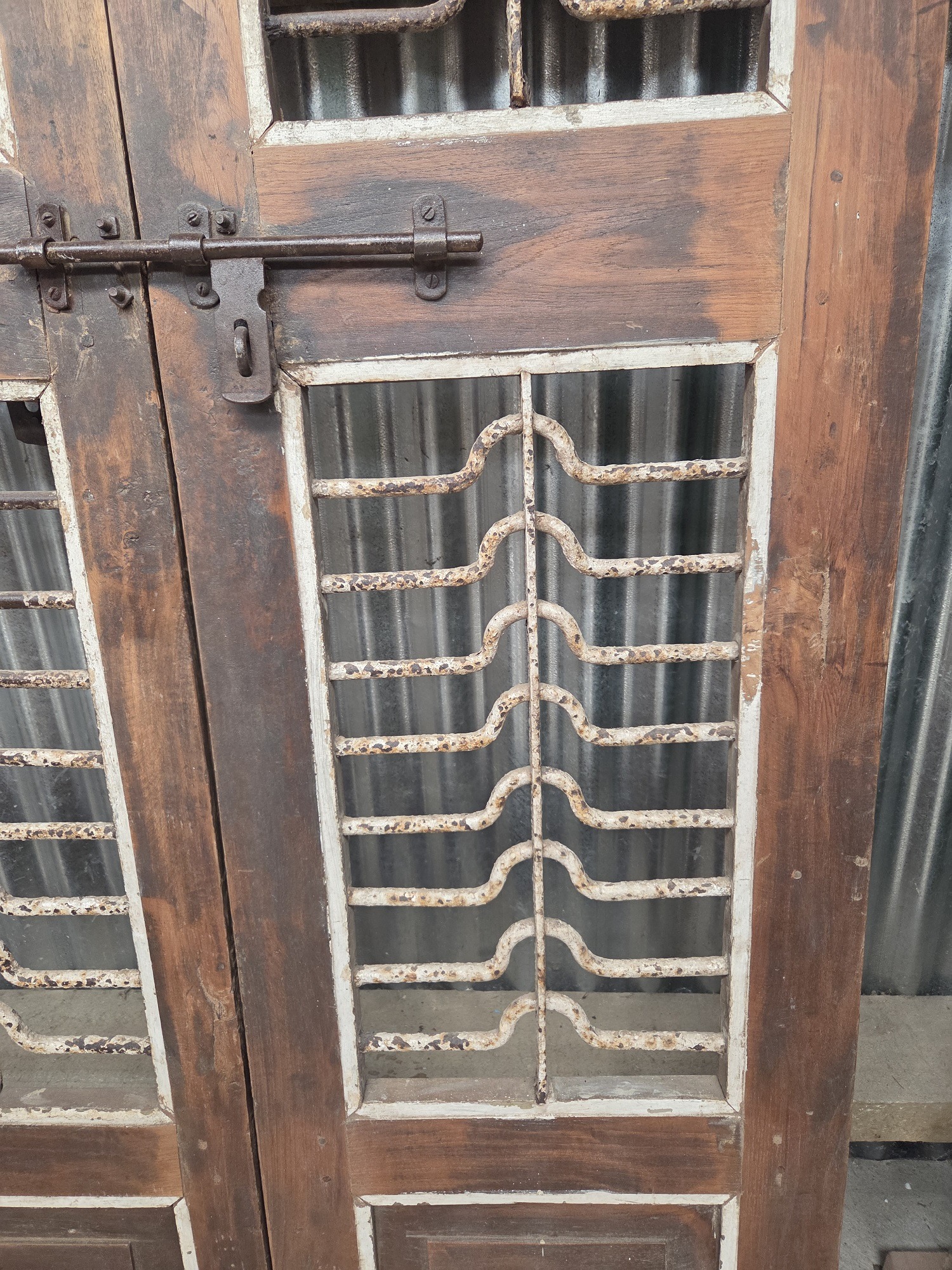 Antique Indian Jali gates are traditionally crafted, intricately designed lattice doors and gates, often featuring teak wood and wrought iron, originating from 19th century havelis in Gujarat and Rajasthan. These durable, ornate pieces provide security, ventilation, and privacy, commonly used today as decorative garden gates, entrance doors, or unique interior decor. They often have a rich, worn patina with original iron fittings.