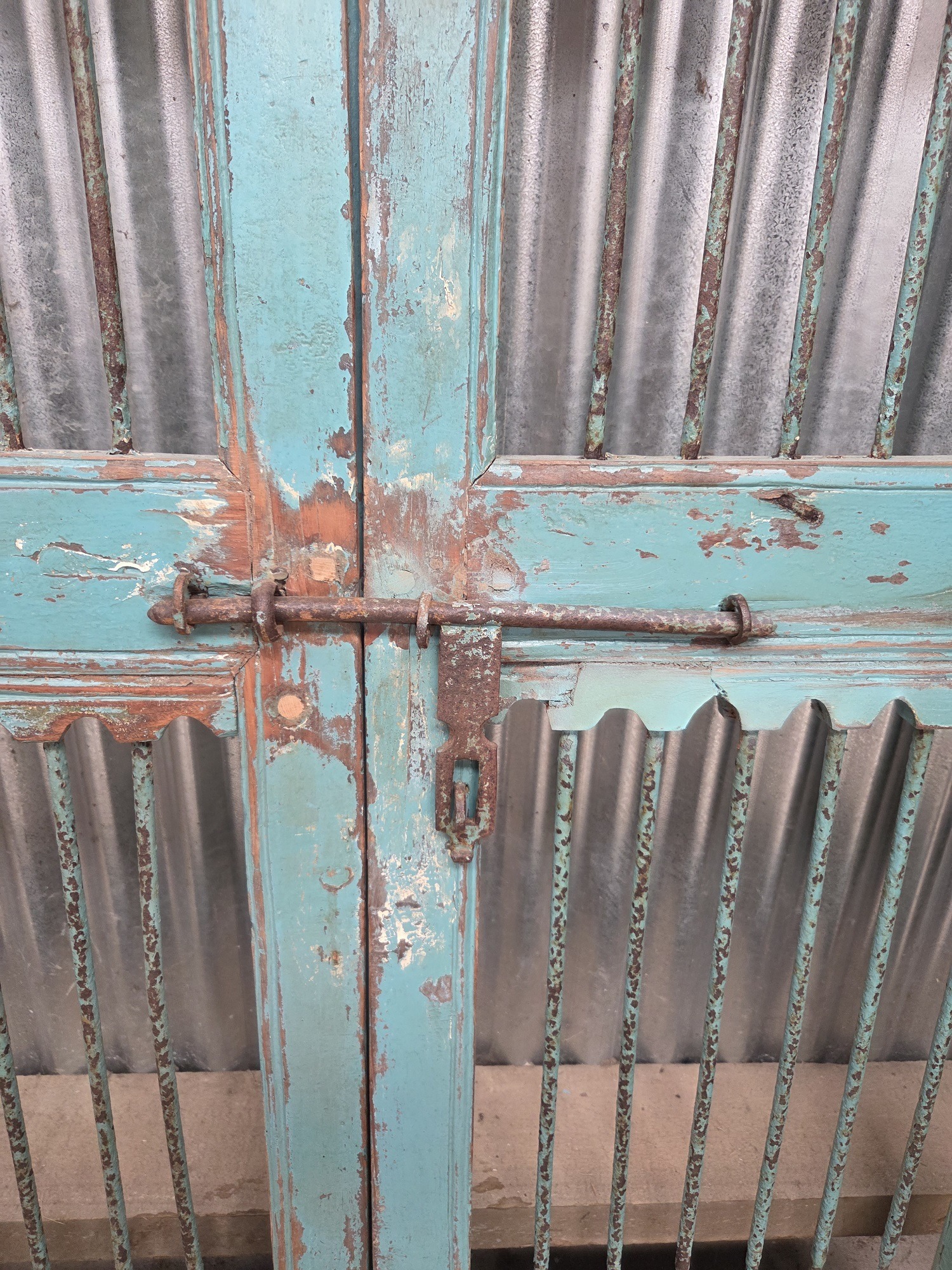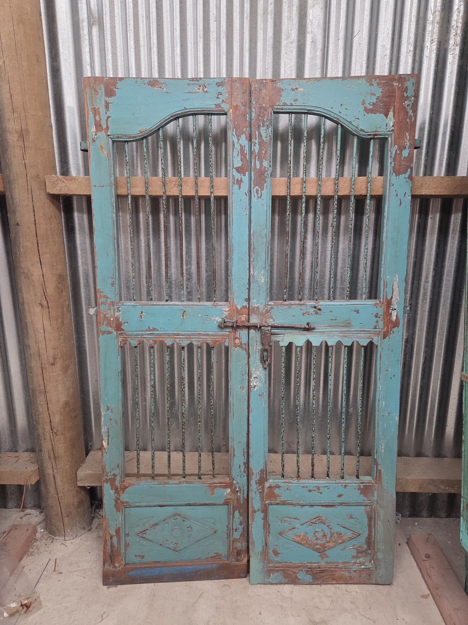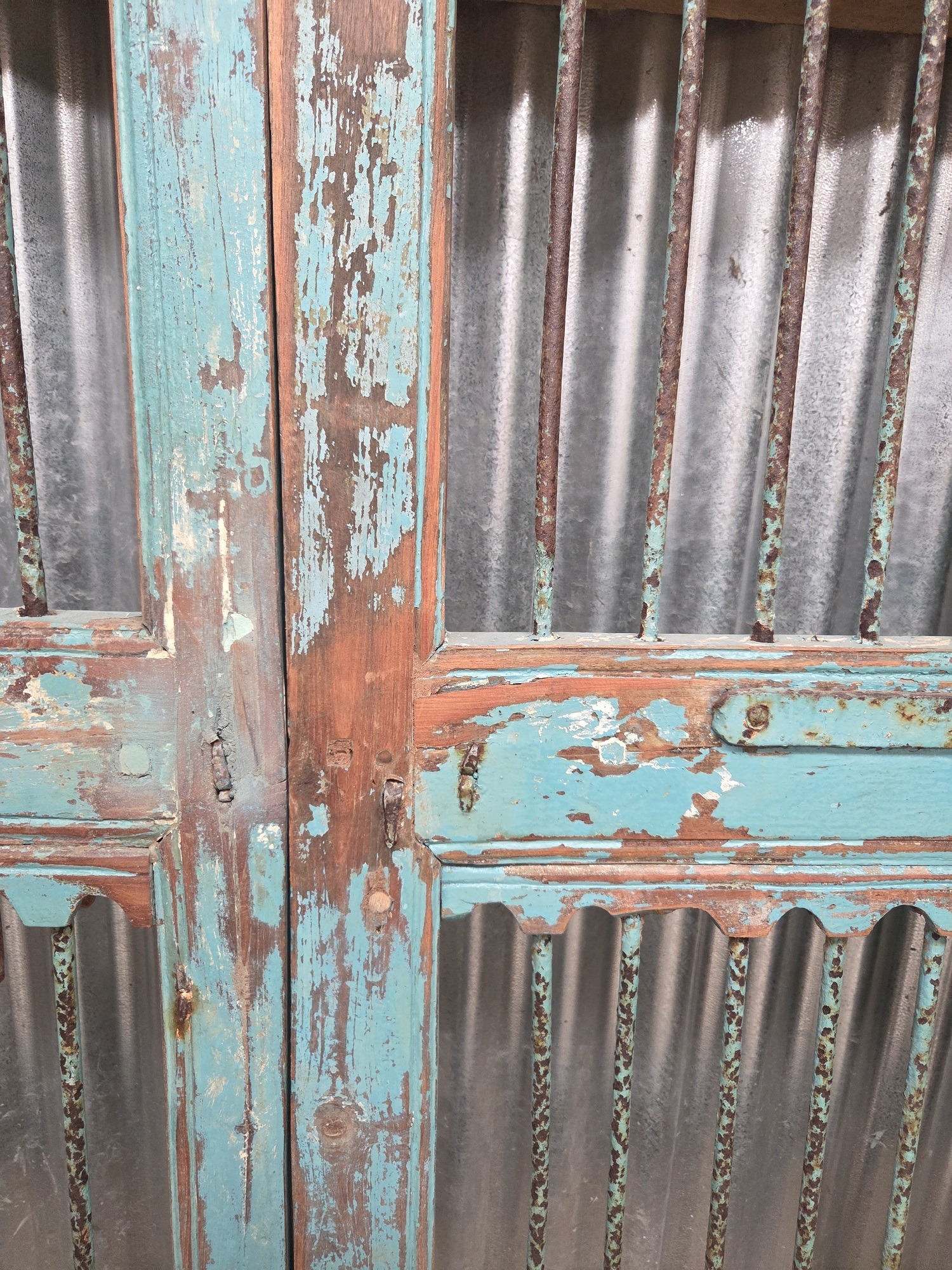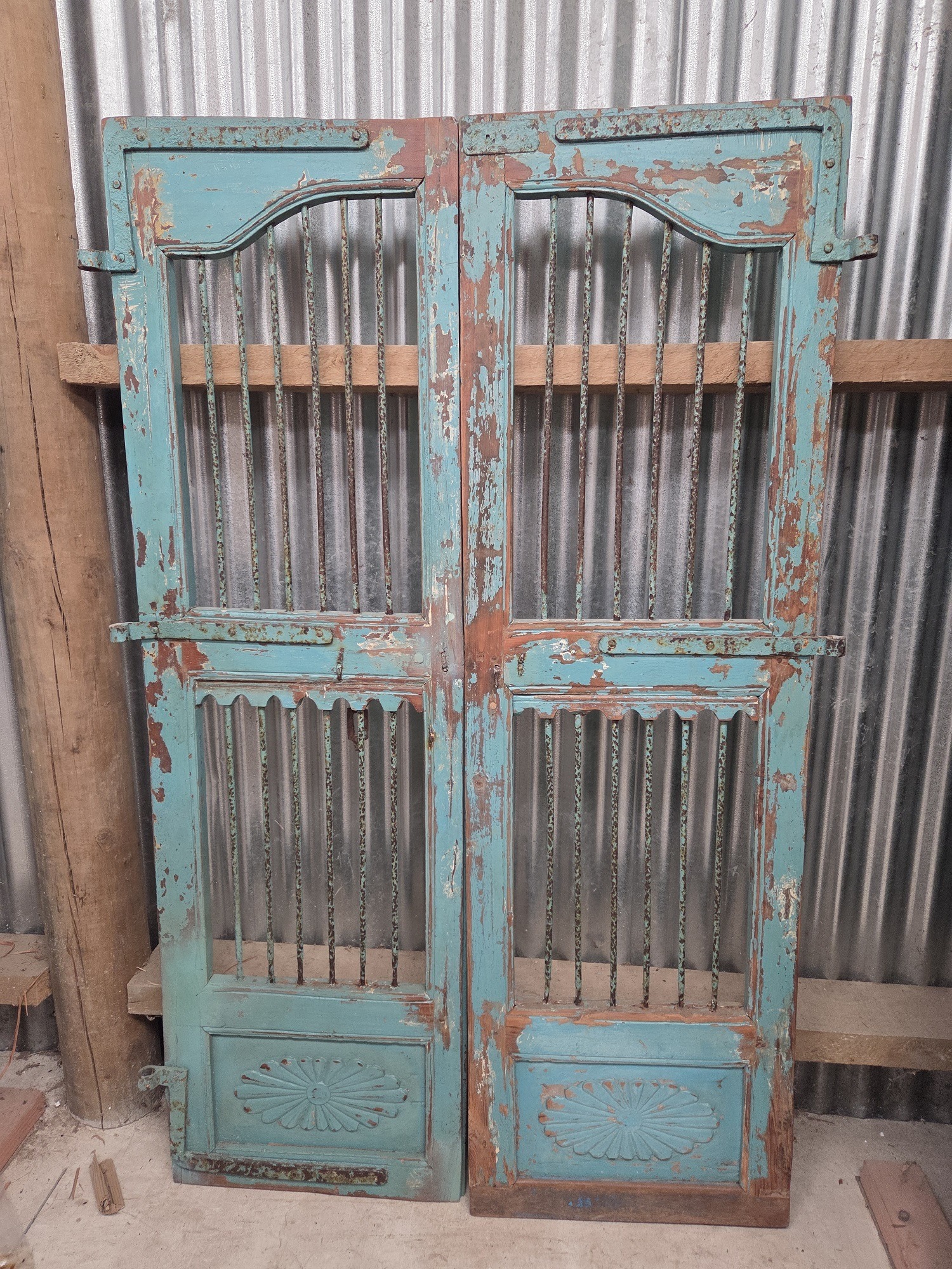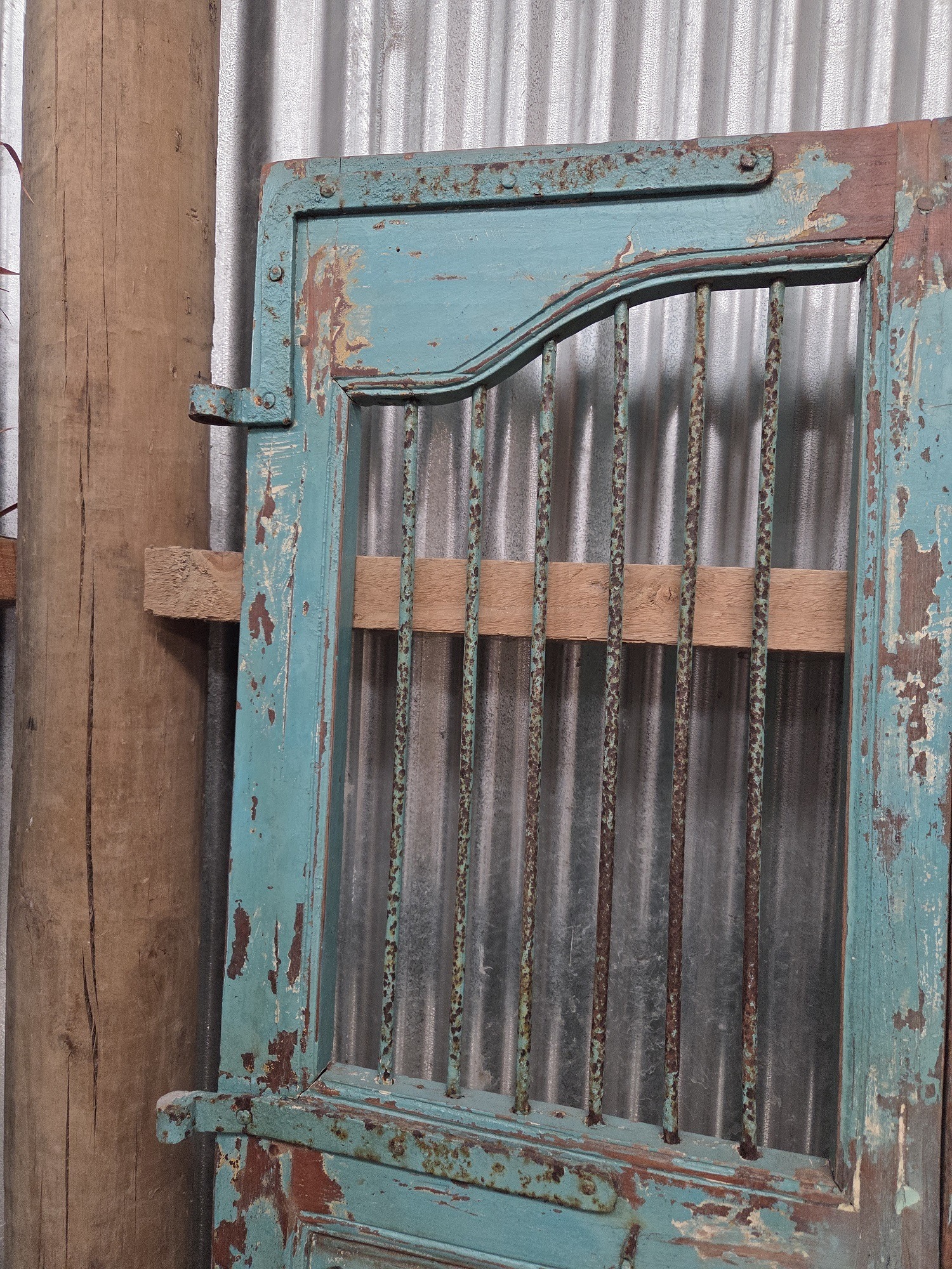 Antique Indian Jali gates are traditionally crafted, intricately designed lattice doors and gates, often featuring teak wood and wrought iron, originating from 19th century havelis in Gujarat and Rajasthan. These durable, ornate pieces provide security, ventilation, and privacy, commonly used today as decorative garden gates, entrance doors, or unique interior decor. They often have a rich, worn patina with original iron fittings.