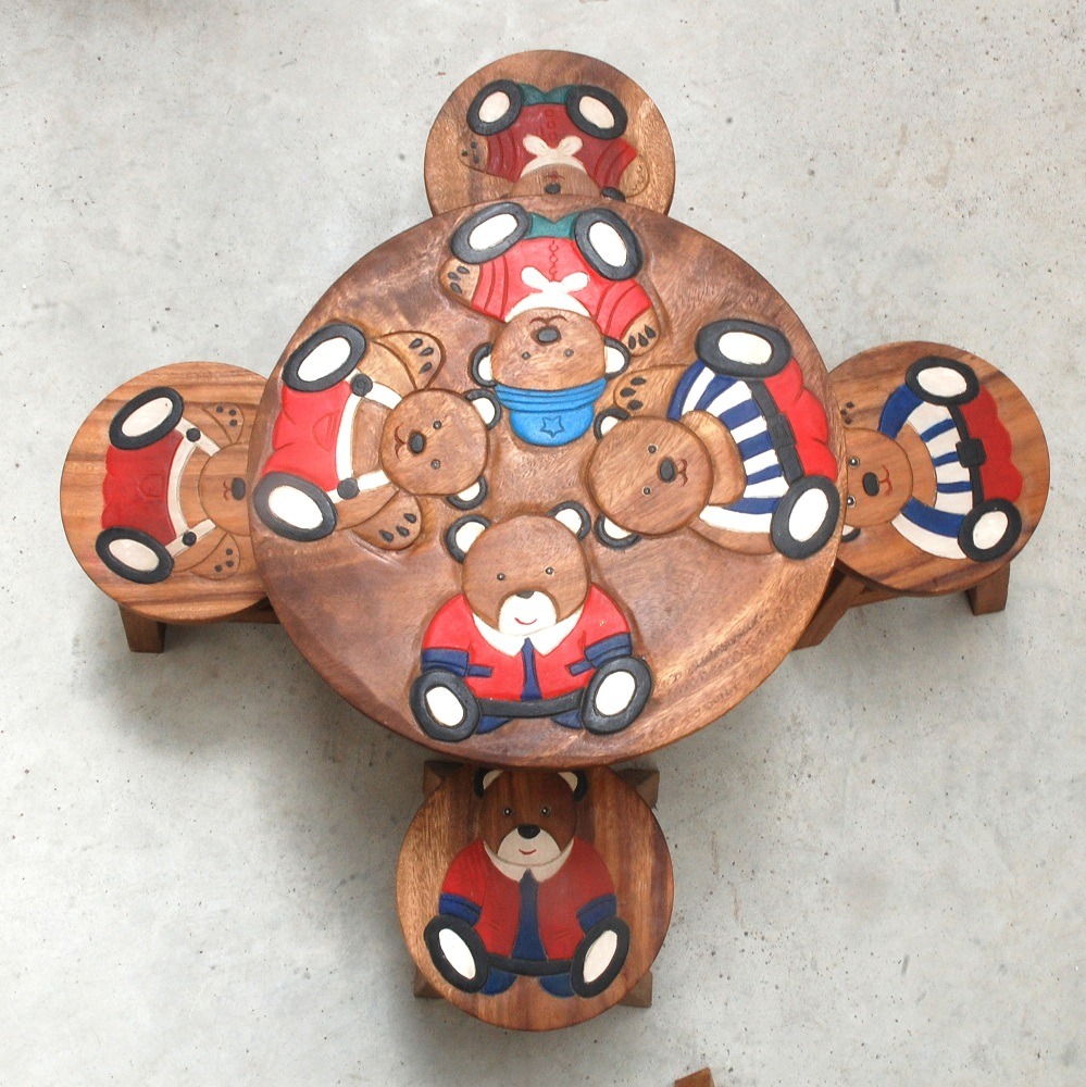 Our kids furniture is all manufactured by hand, from carving and assembling, to painting and waxing. It is primarily crafted from Monkeywood, also referred to as Suarwood. These along with other substainable options like reclaimed Teakroot, are chosen for their durability and strength. They are all a durable hardwood and are noted for their sturdiness. They are all hand painted with non toxic vegetable paints and dyes and can be something that can be passed down to future generations.