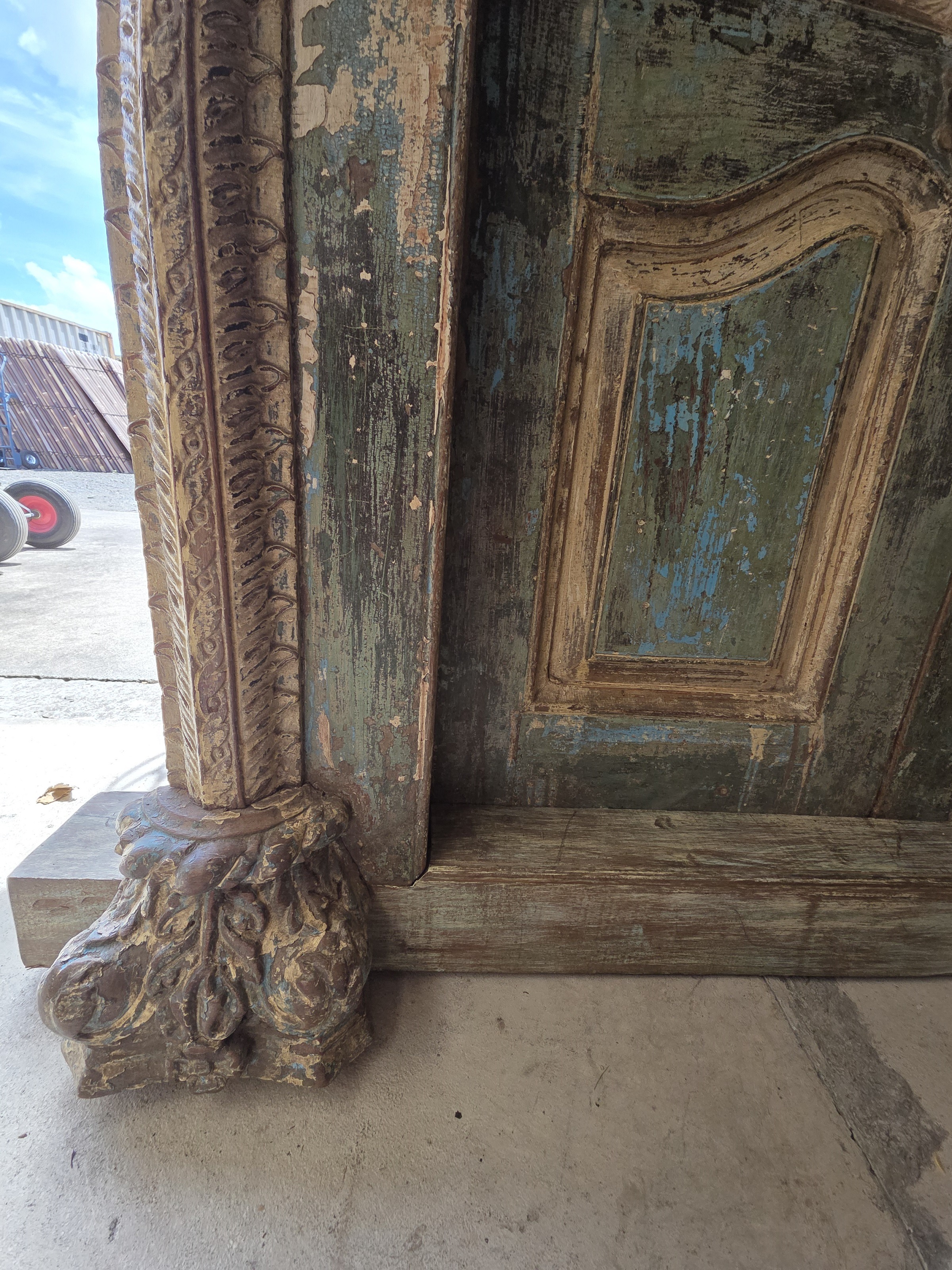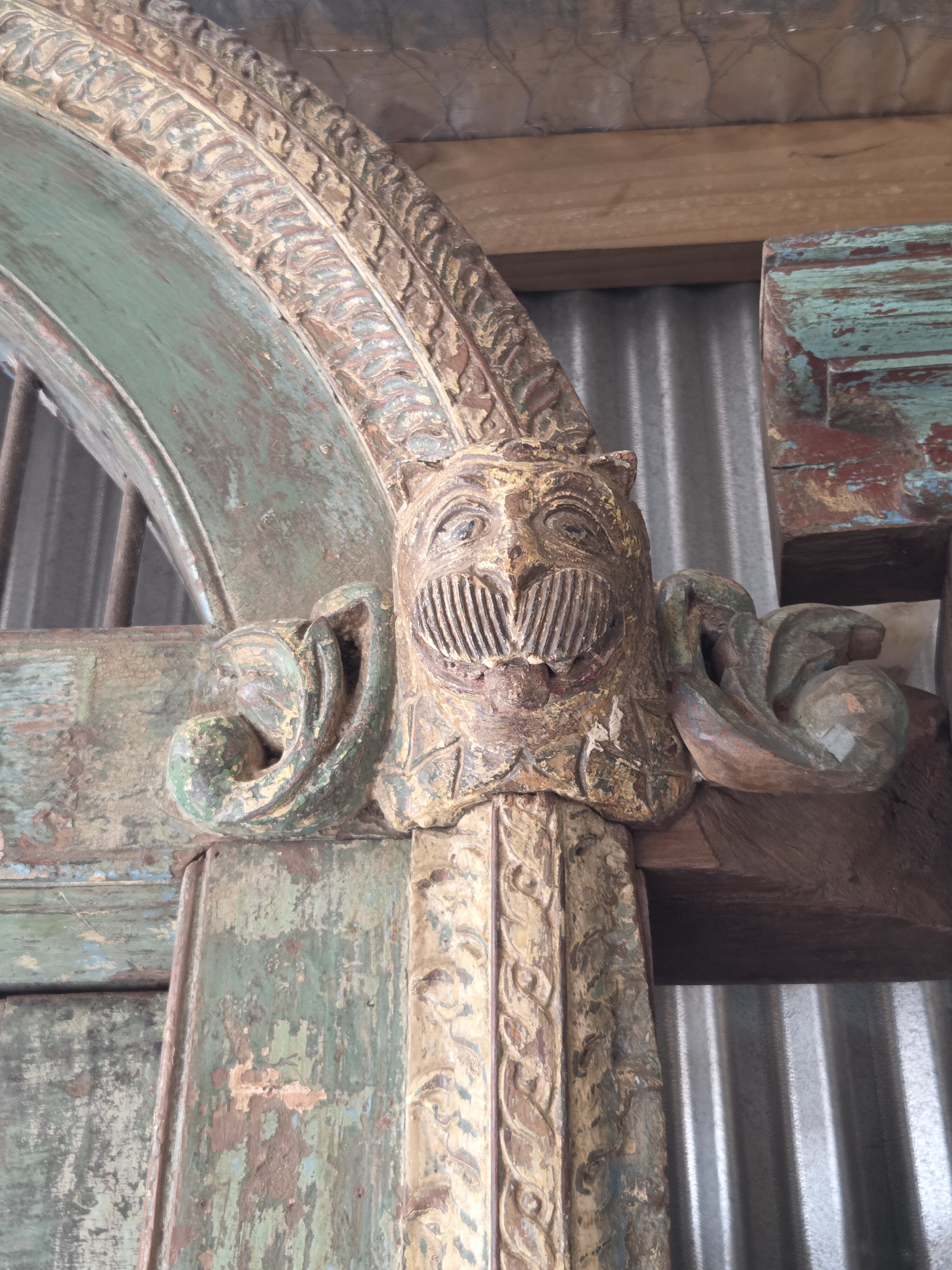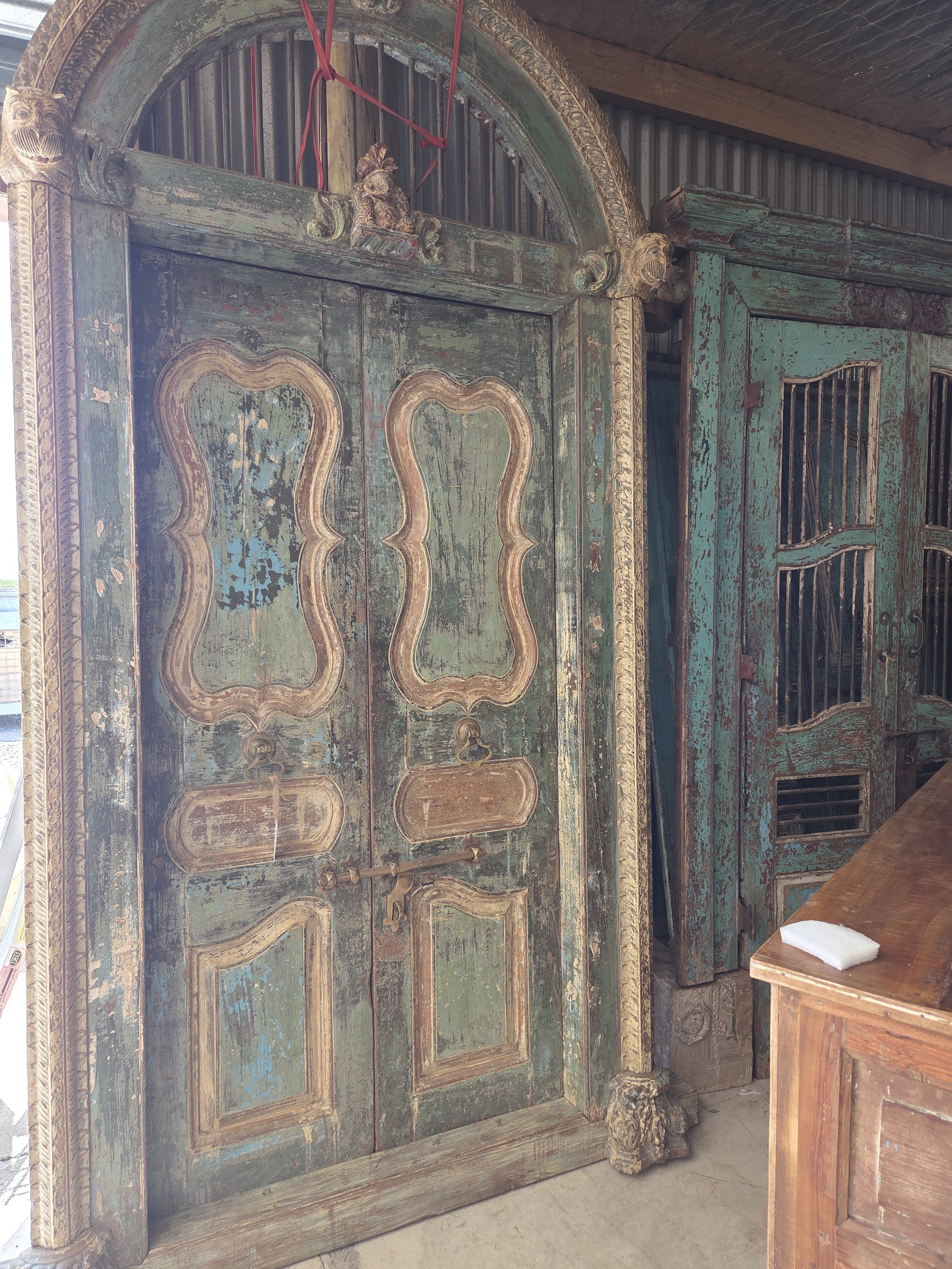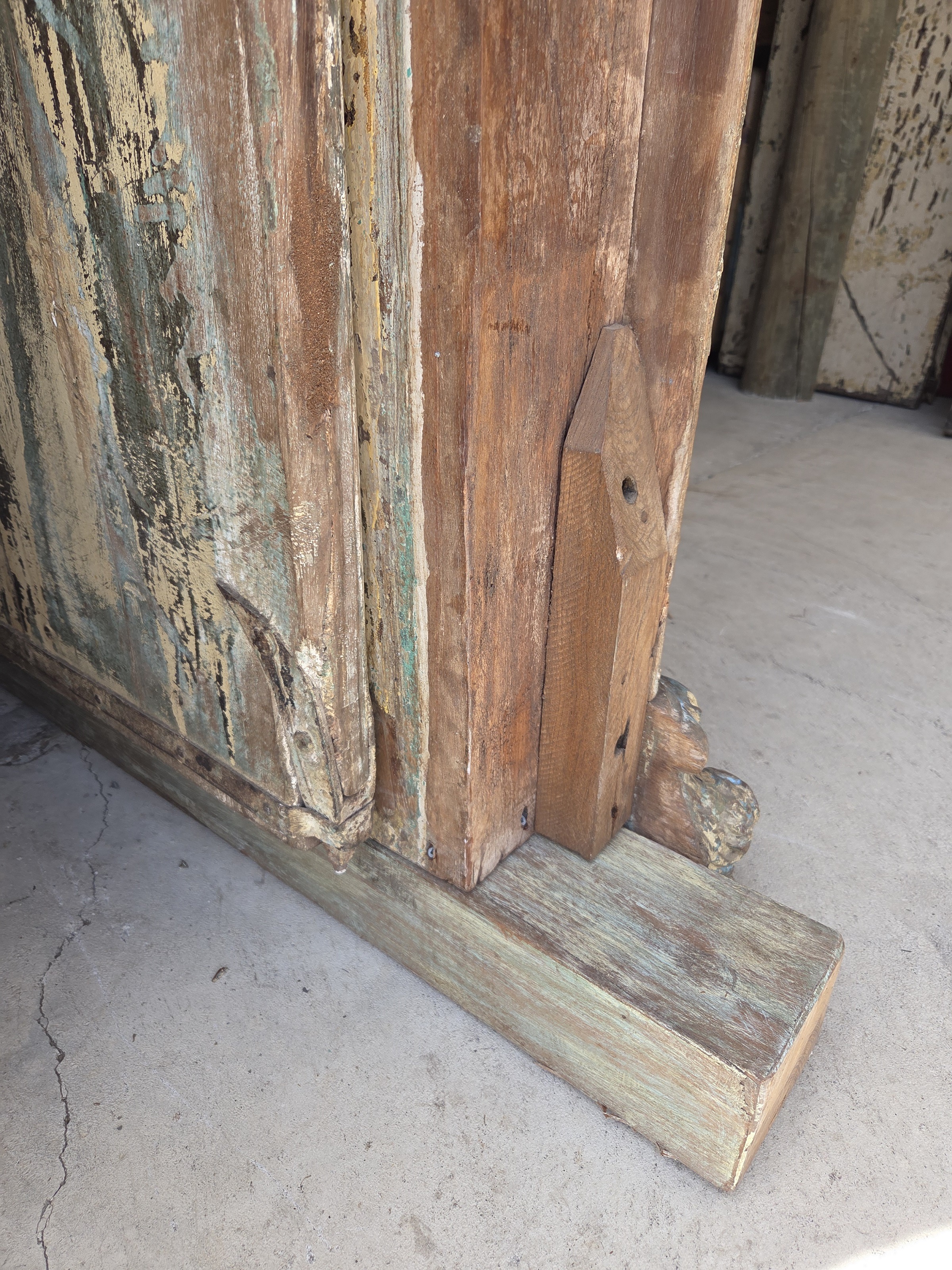 Our doors are all one of pieces which have been handpicked by us. The majority are salvaged from historic buildings, or Temples, from areas all around India. They are made from Teak wood and have been out in the weather for many years, so are suitable for outdoor use. They are hand carved and most have their original fittings. They are naturally aged, with their original patina.