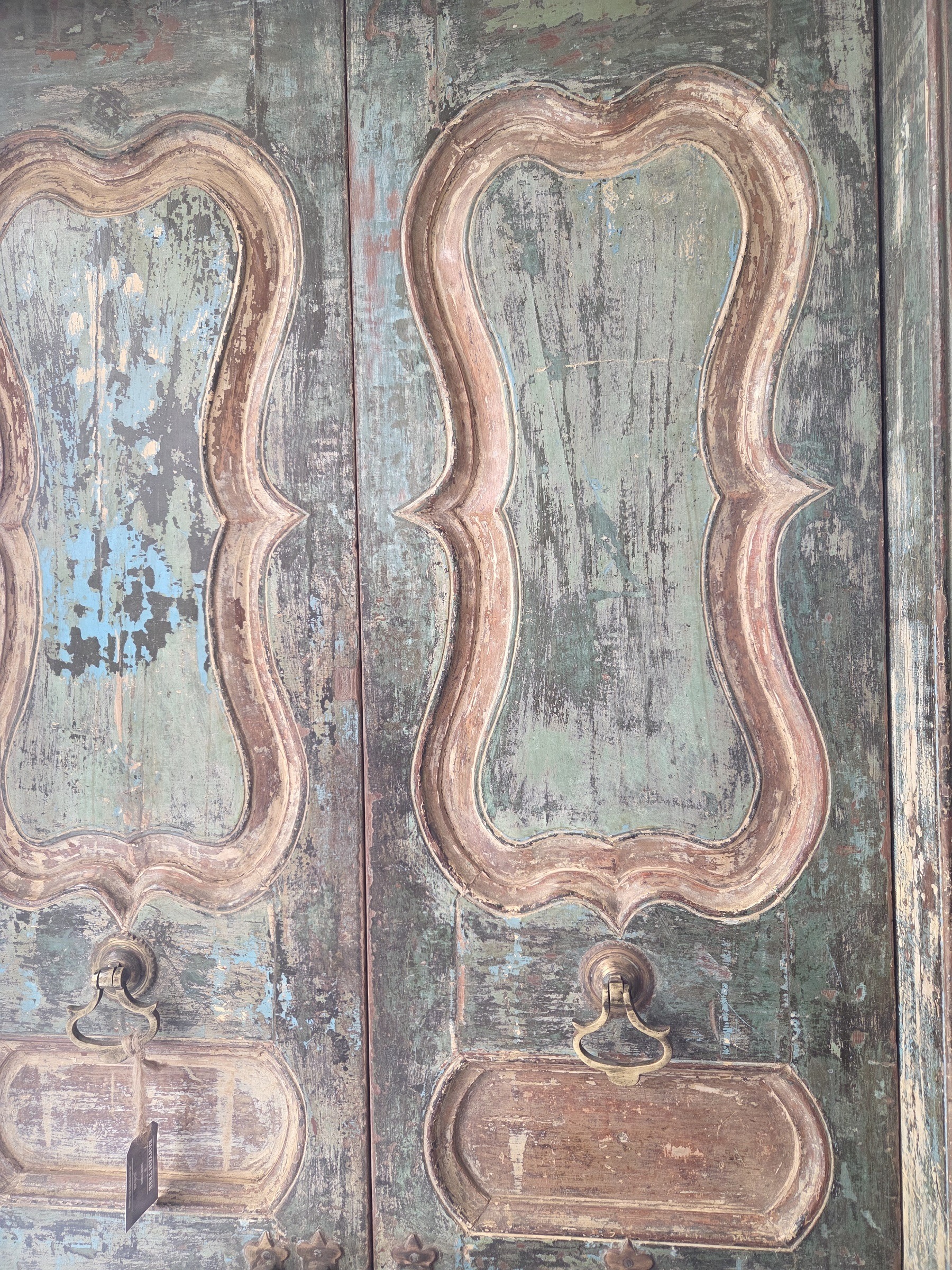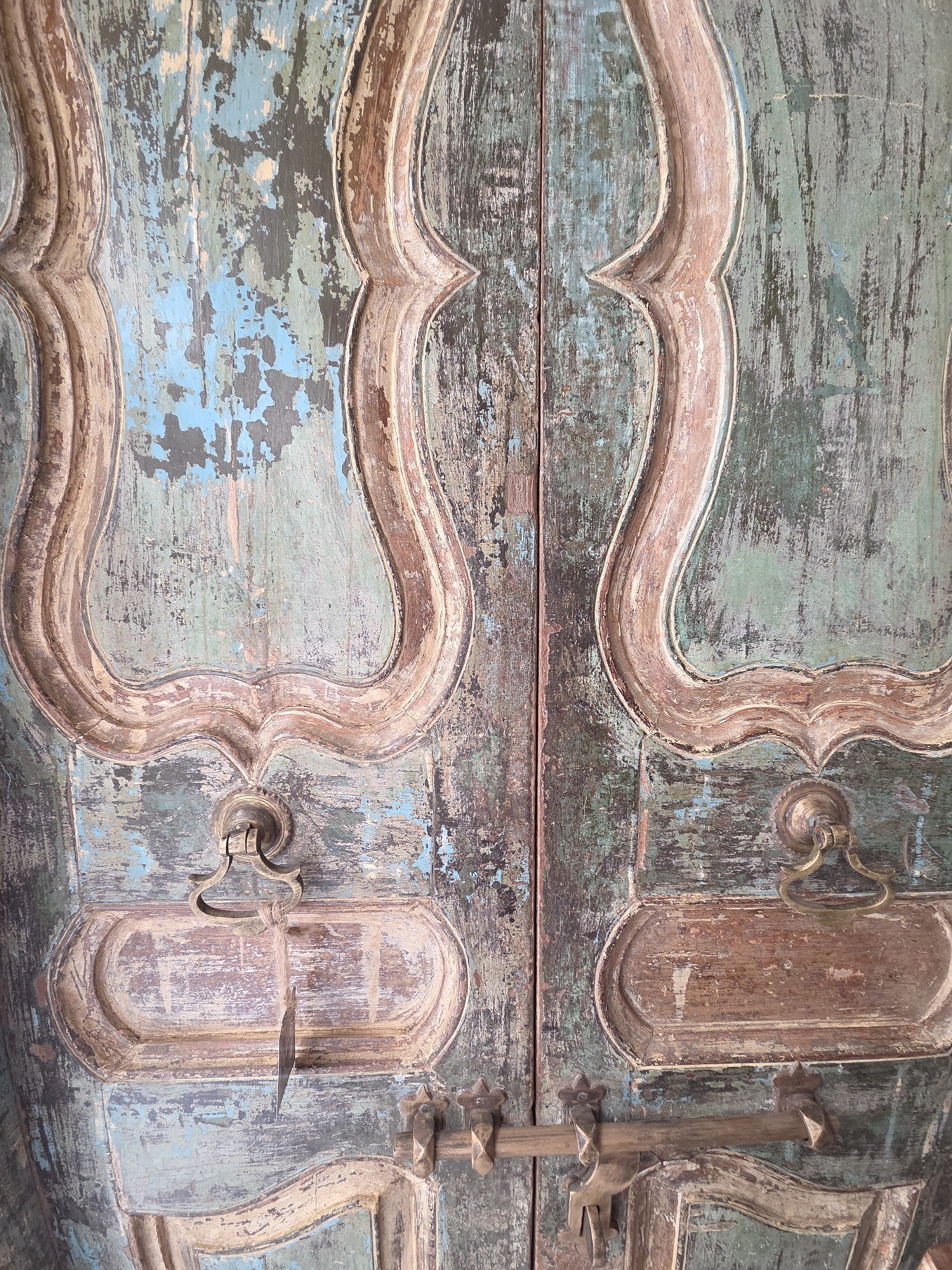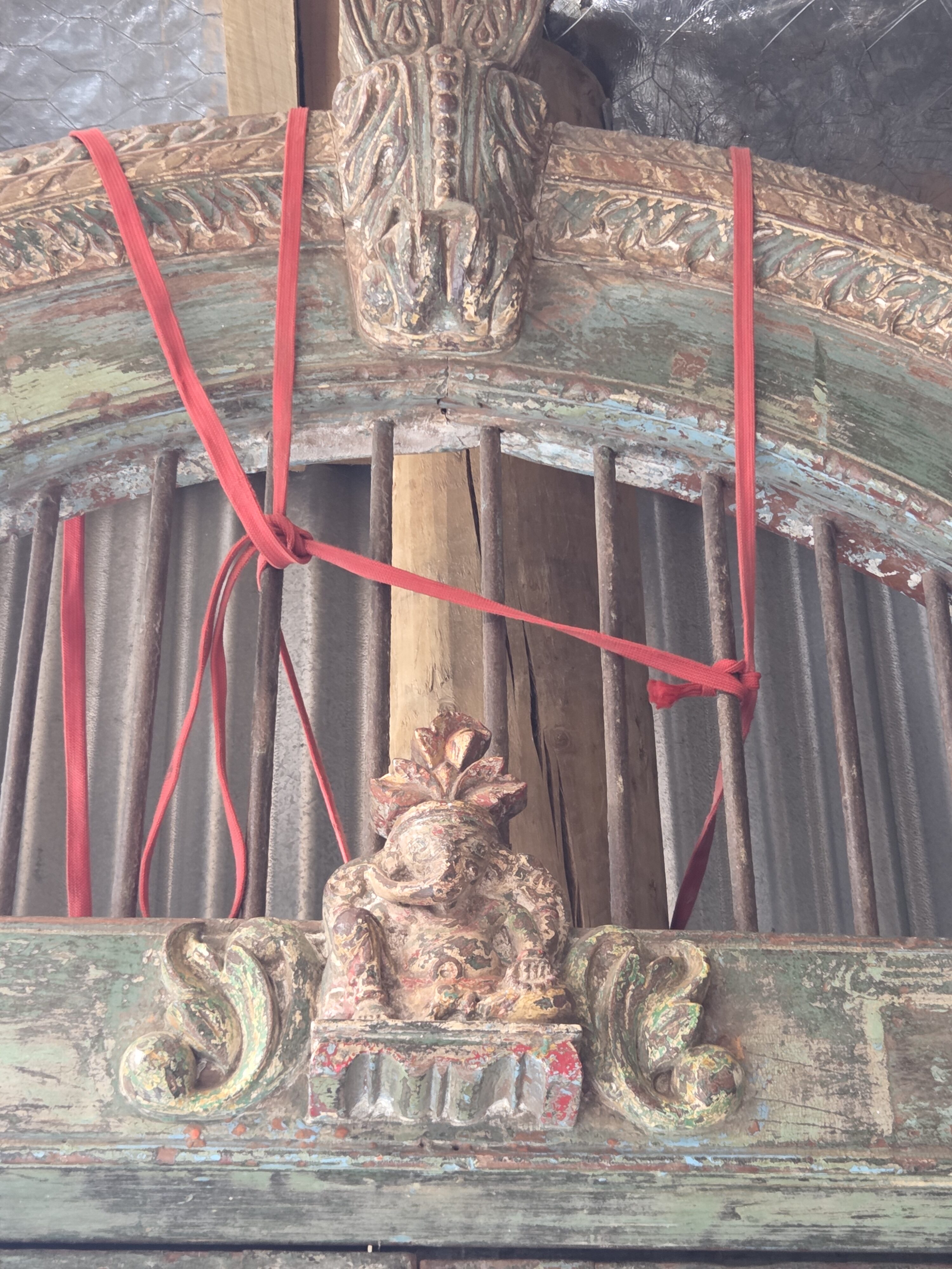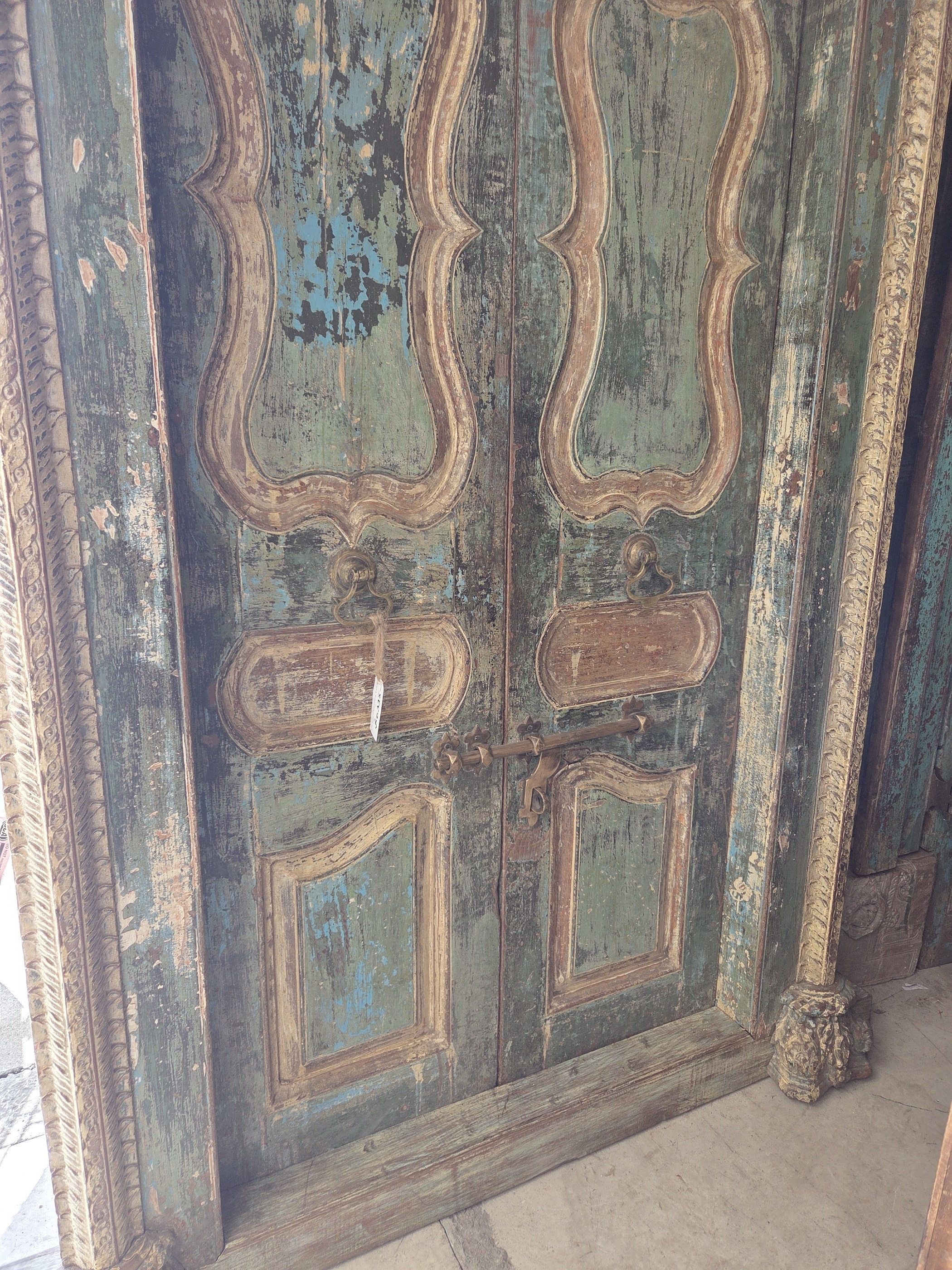 Our doors are all one of pieces which have been handpicked by us. The majority are salvaged from historic buildings, or Temples, from areas all around India. They are made from Teak wood and have been out in the weather for many years, so are suitable for outdoor use. They are hand carved and most have their original fittings. They are naturally aged, with their original patina.