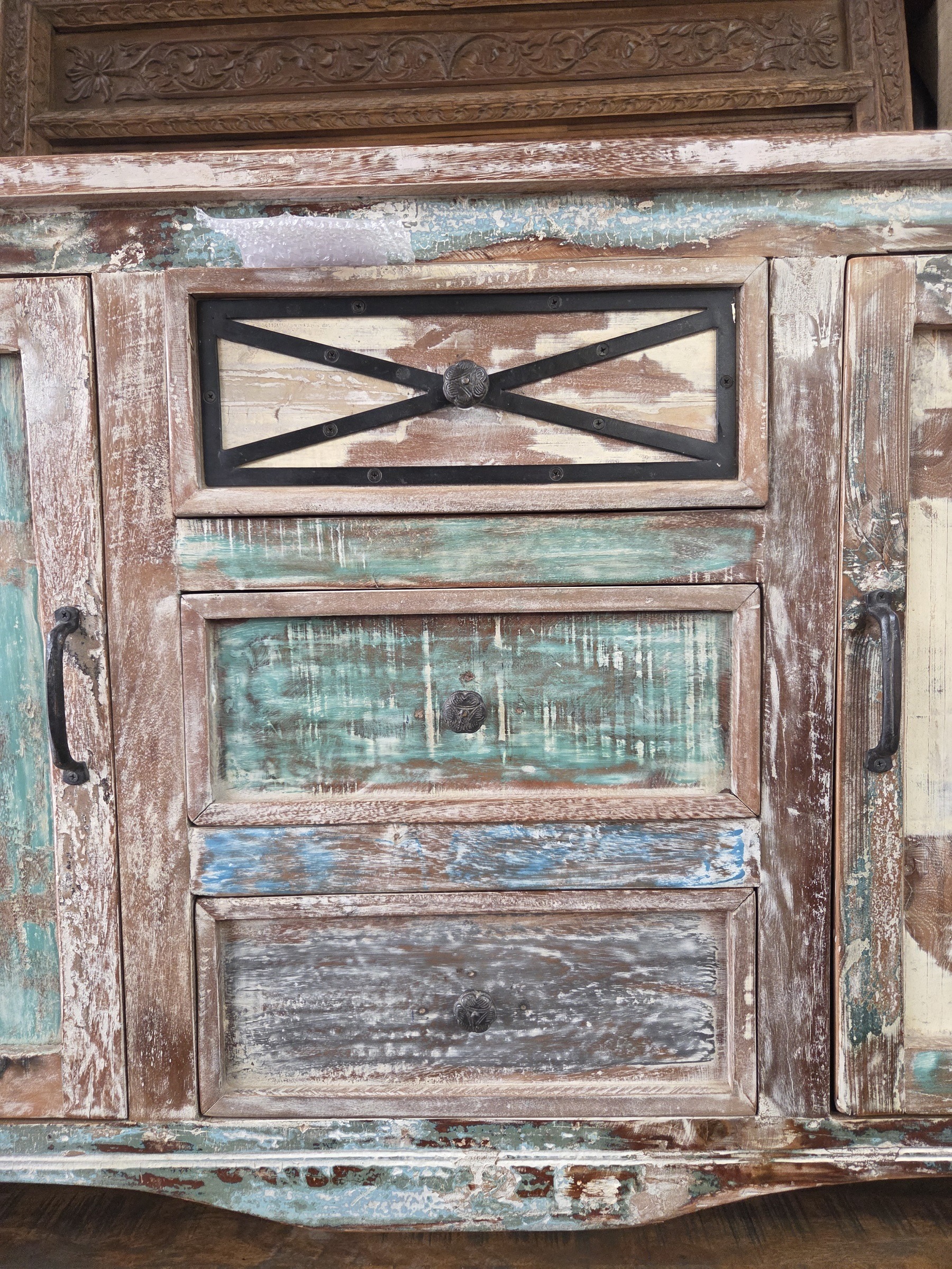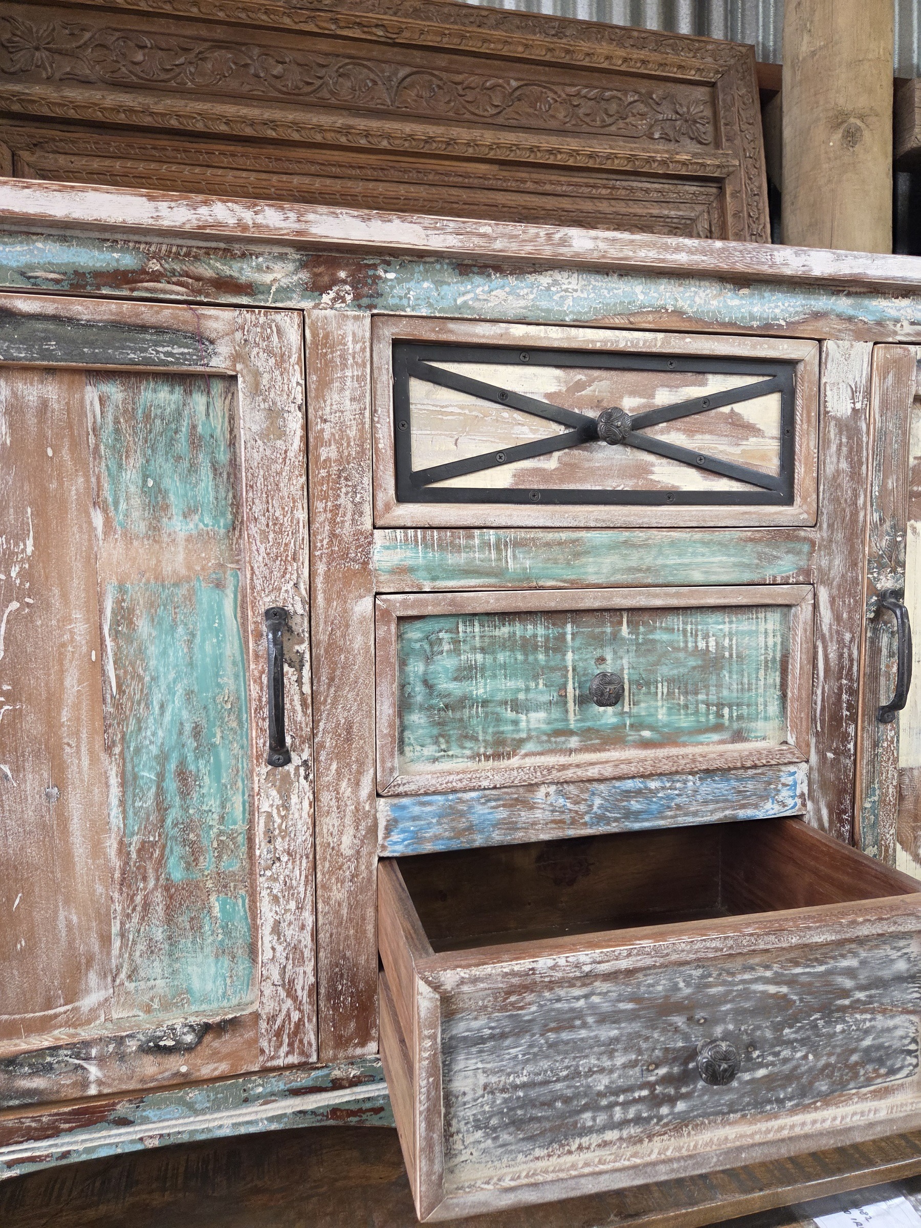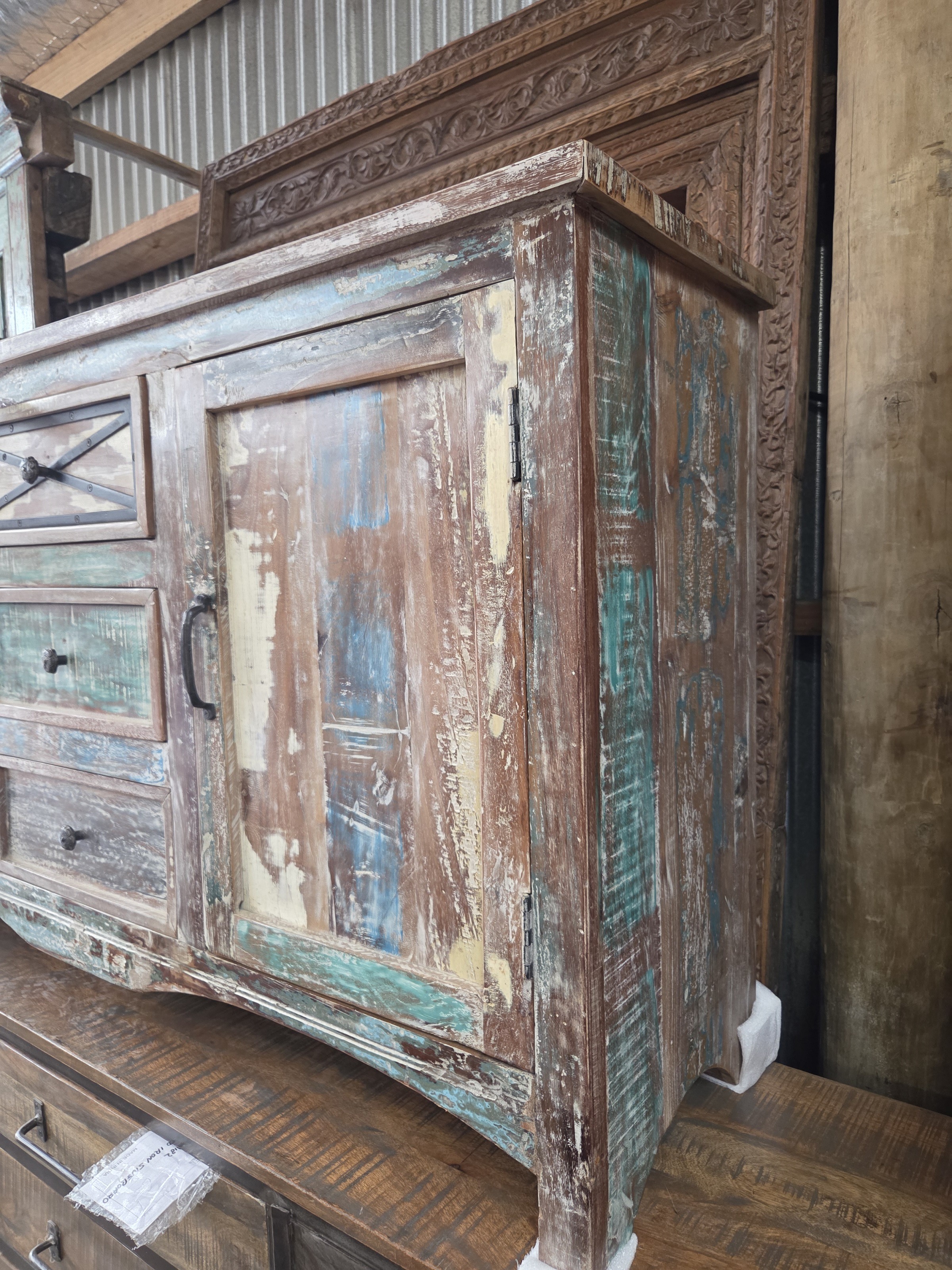 Colourful, large sideboard, newly made from re-purposed wood.
