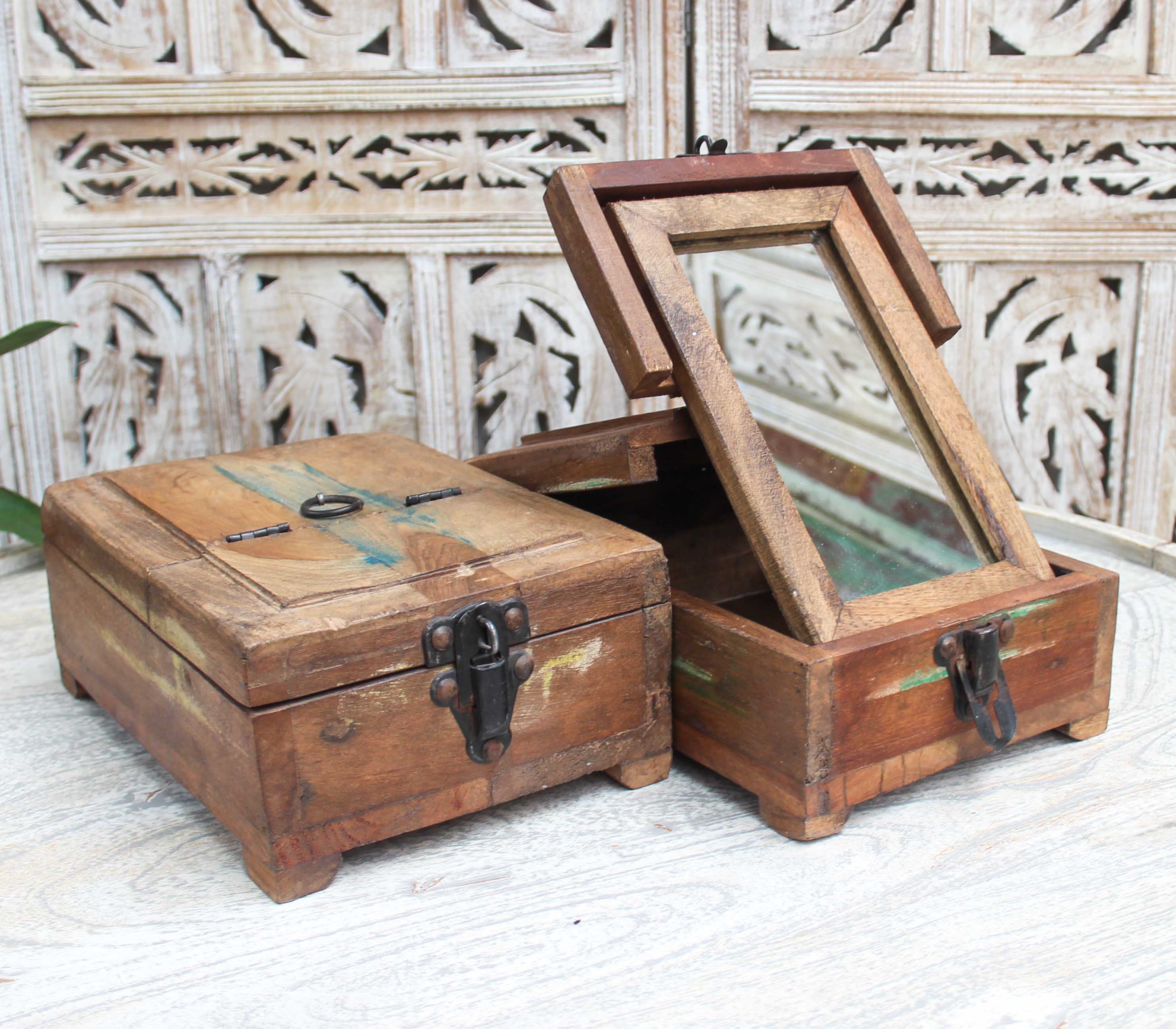 Vintage, wood barbers box with mirror.
