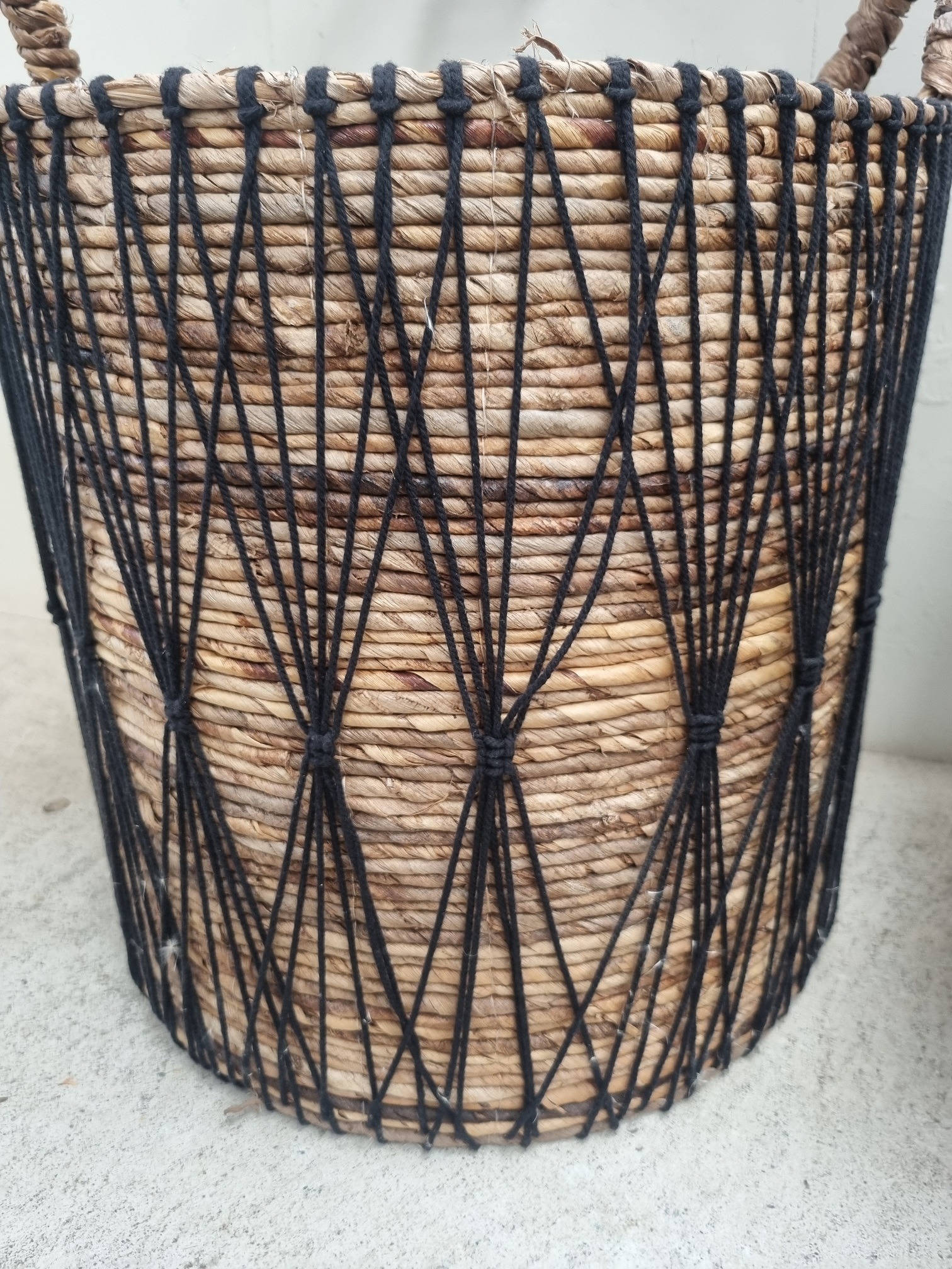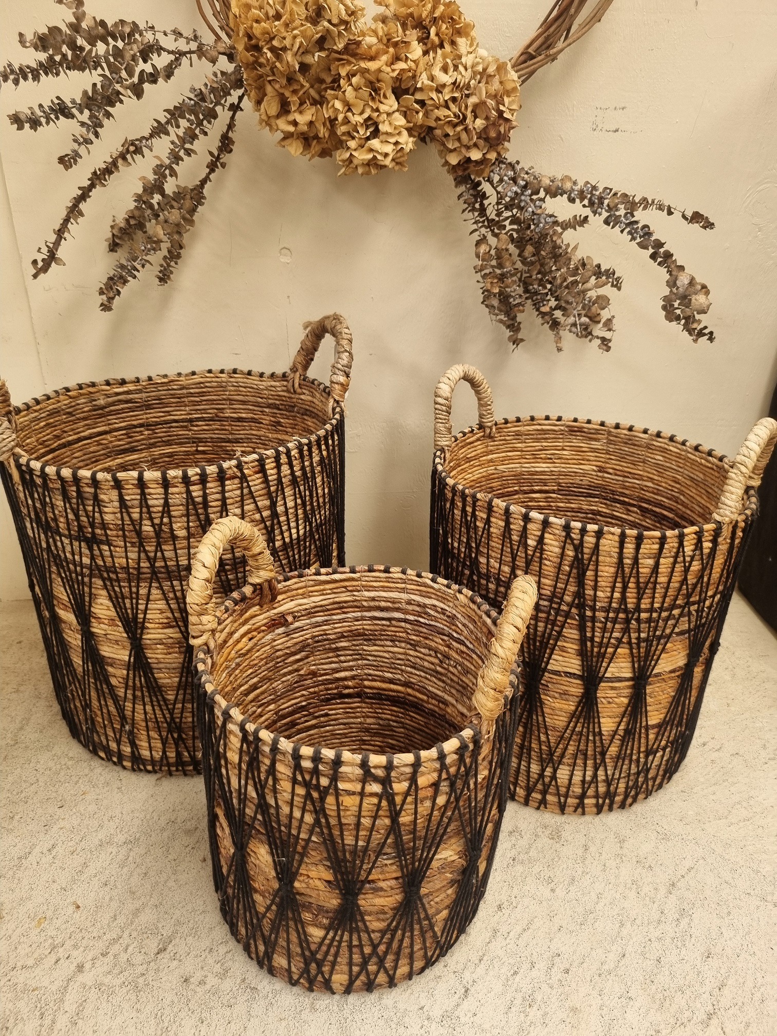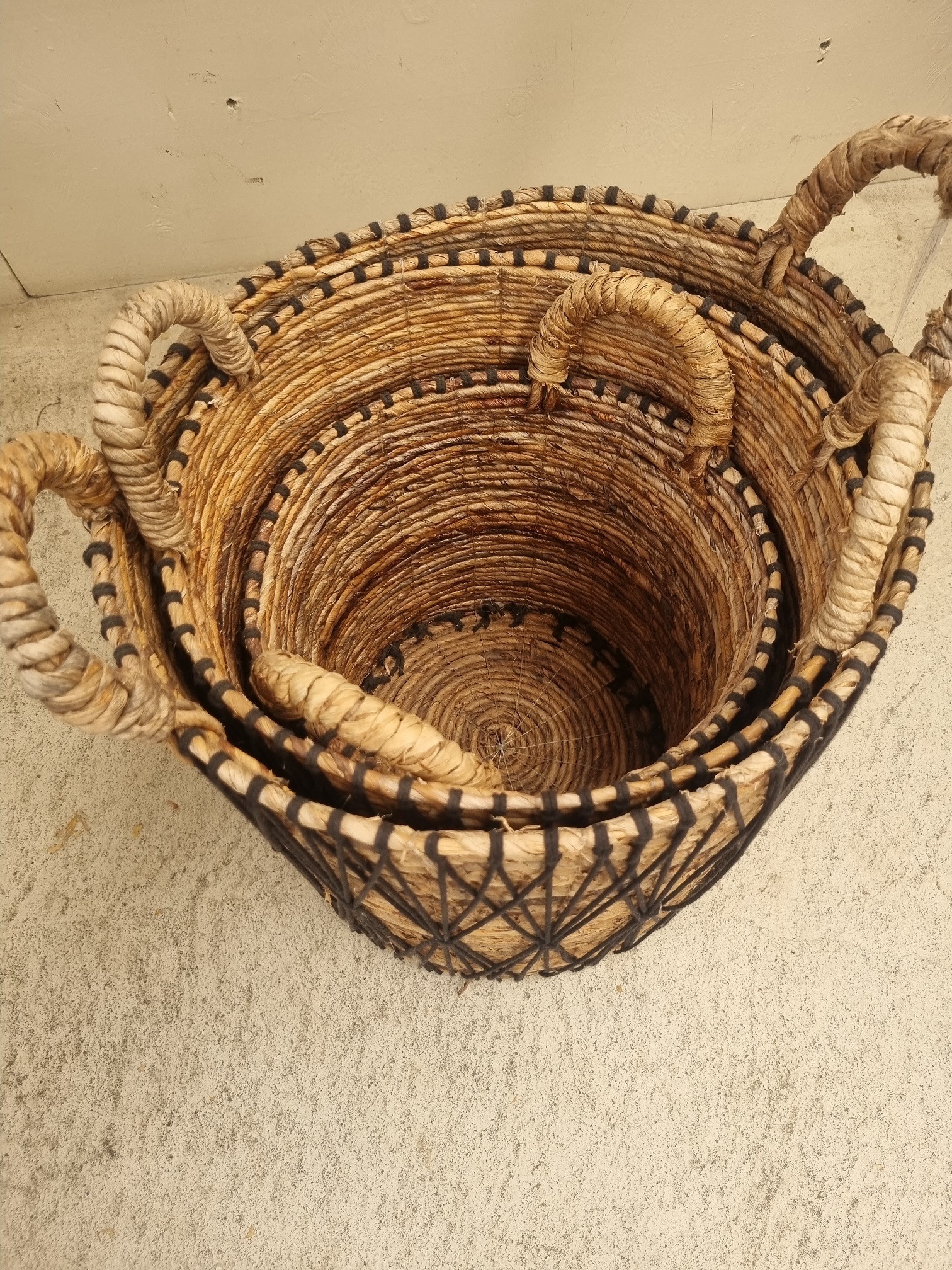 Set 3 rattan baskets with black string decoration.