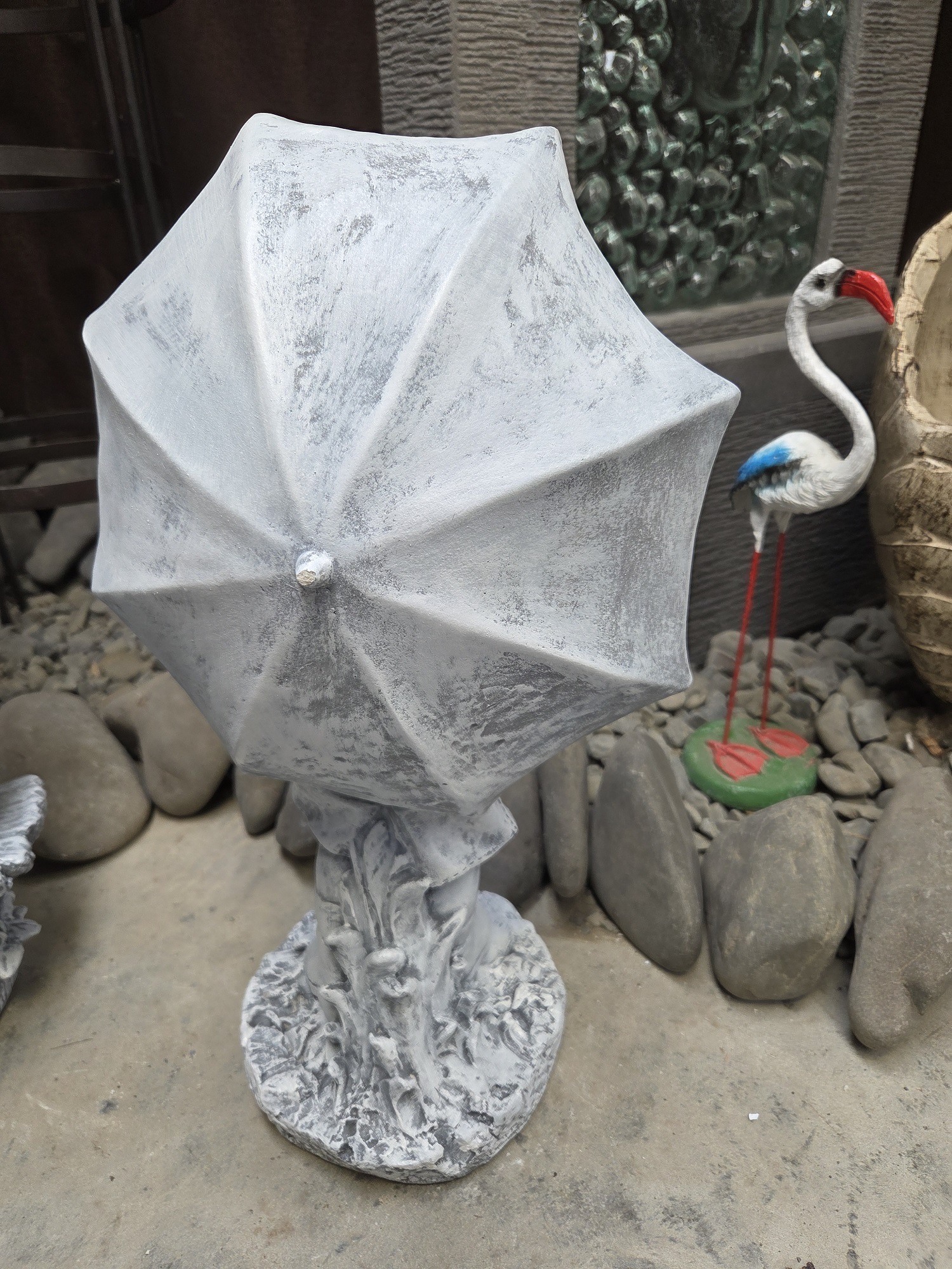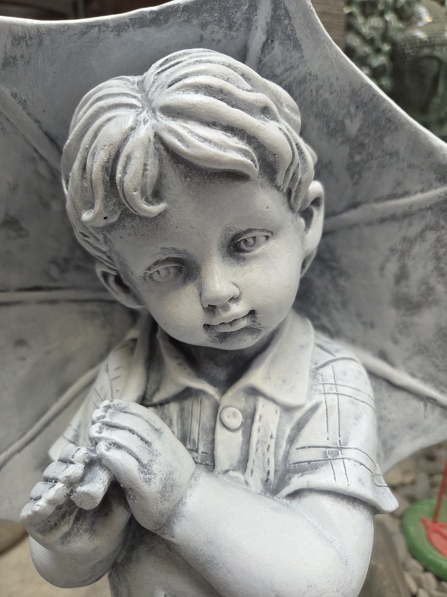 A lovely concrete statue of a boy holding an umbrella.