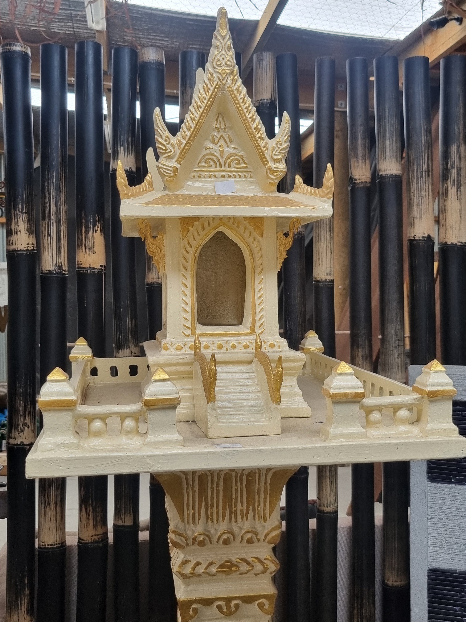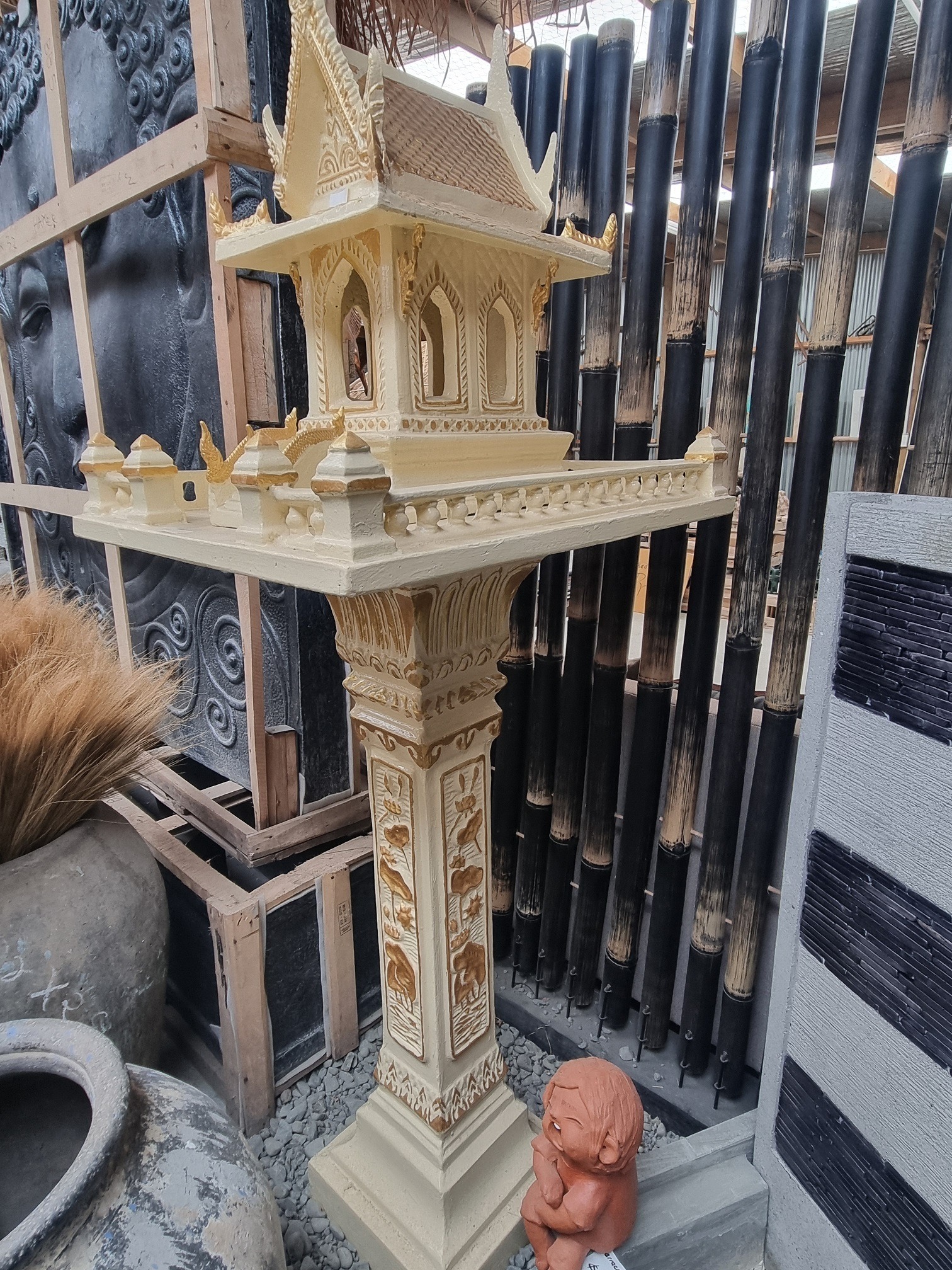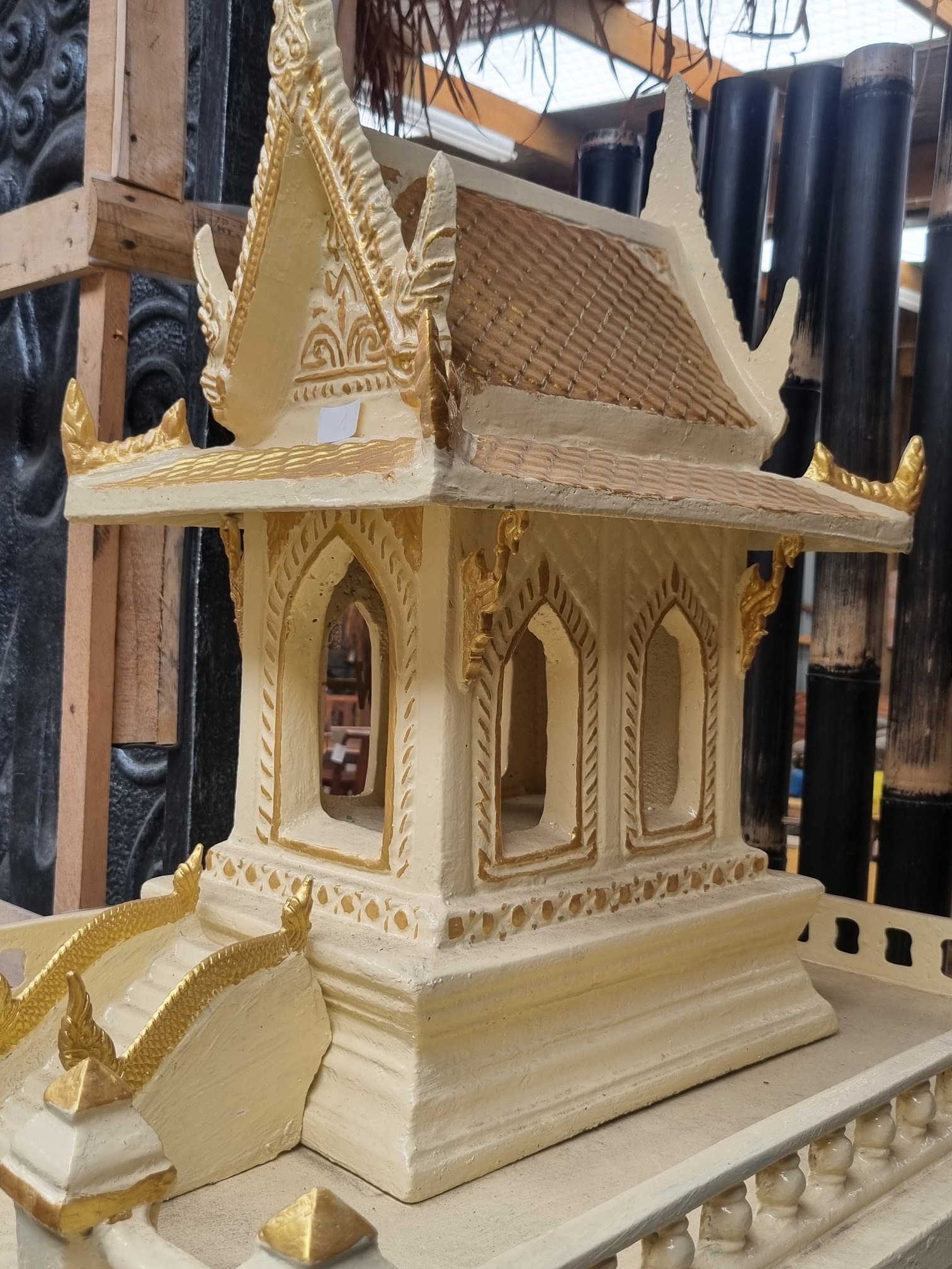 Thai Spirit houses are miniature shrines dedicated to the guardian spirits believed to inhabit the land. They are erected outside homes, businesses, and other buildings to provide a dwelling for these spirits, with the intention of ensuring harmony, and bringing good fortune and protection. Offerings of food, drink, flowers and incense, are made daily to keep the spirits content and the people safe.