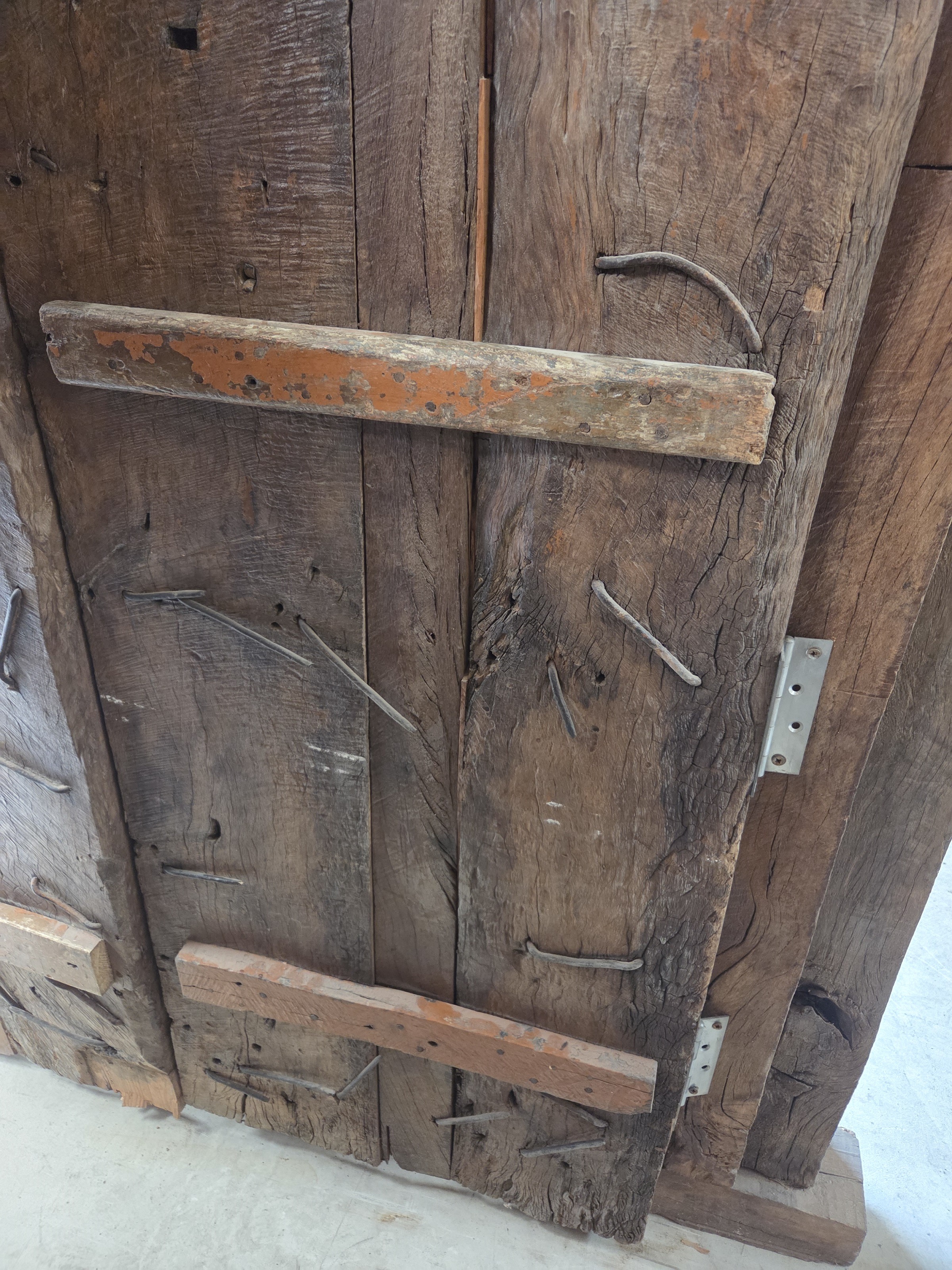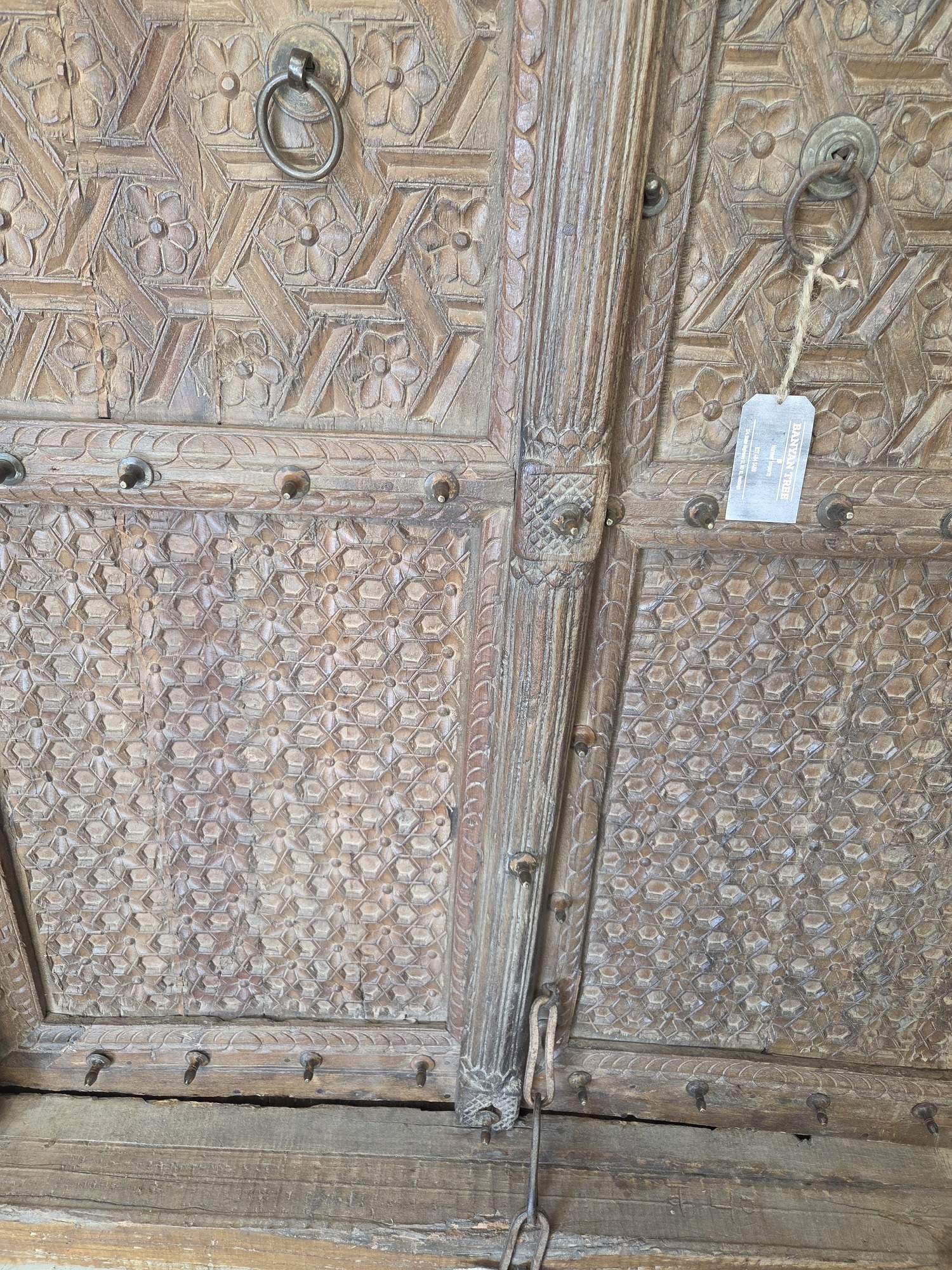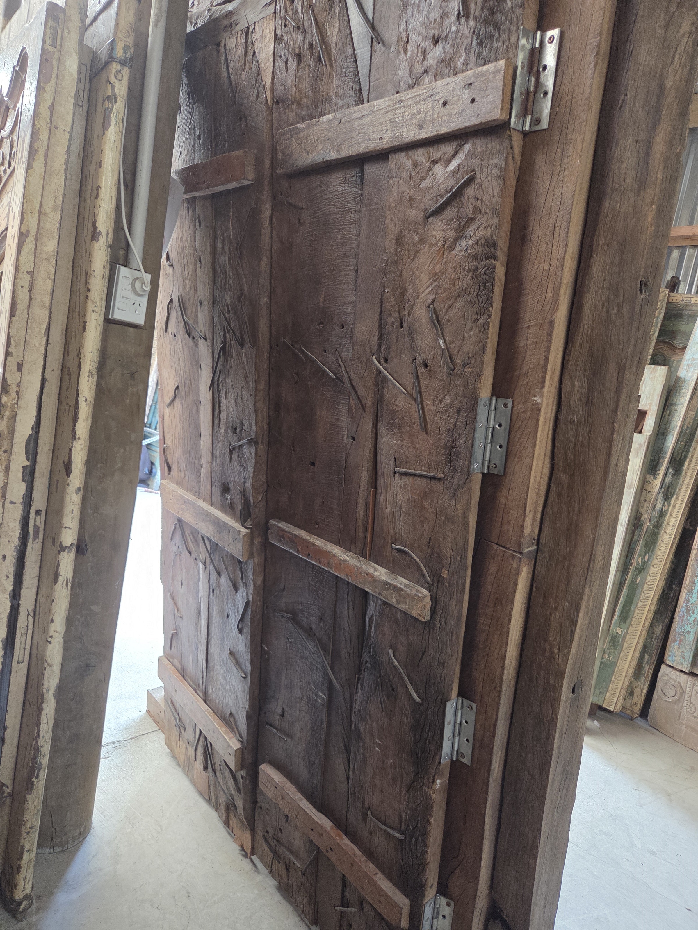 Our doors are all one of pieces which have been handpicked by us. The majority are salvaged from historic buildings, or Temples, from areas all around India. They are made from Teak wood and have been out in the weather for many years, so are suitable for outdoor use. They are hand carved and most have their original fittings. They are naturally aged, with their original patina.