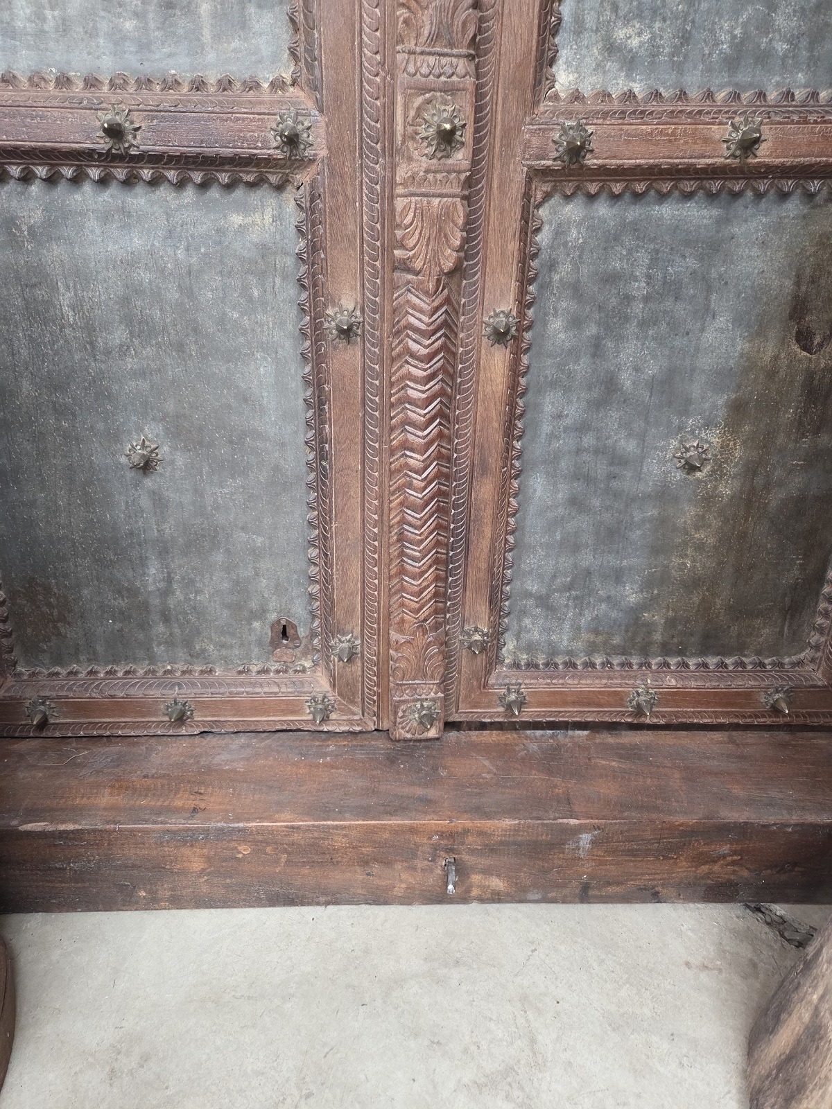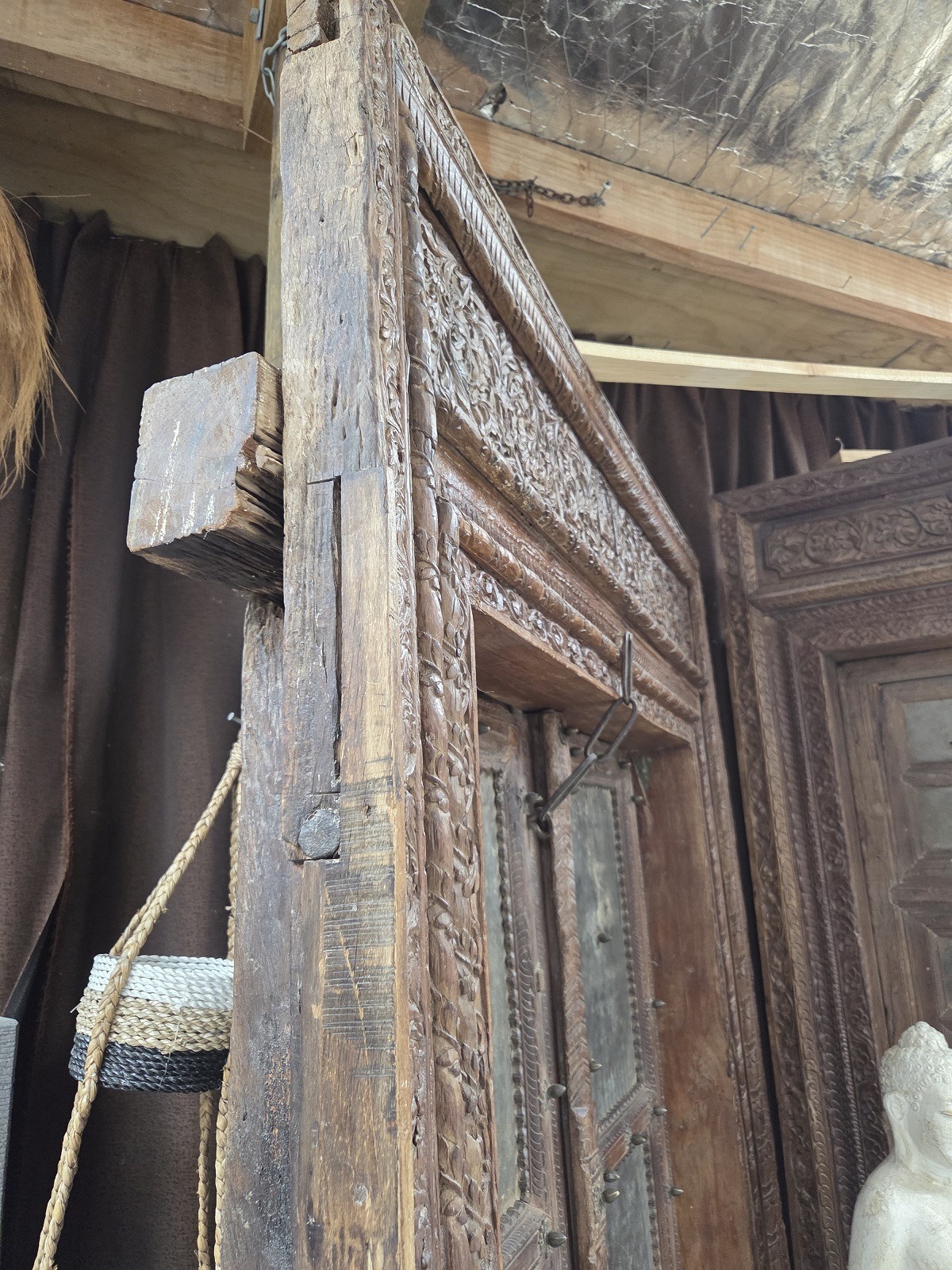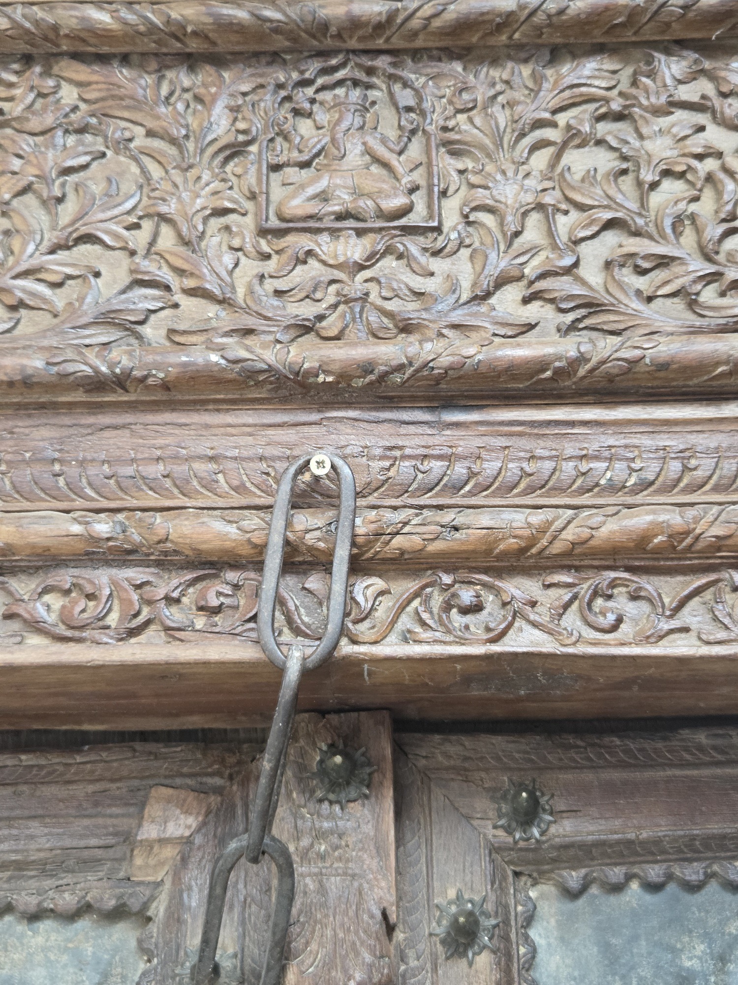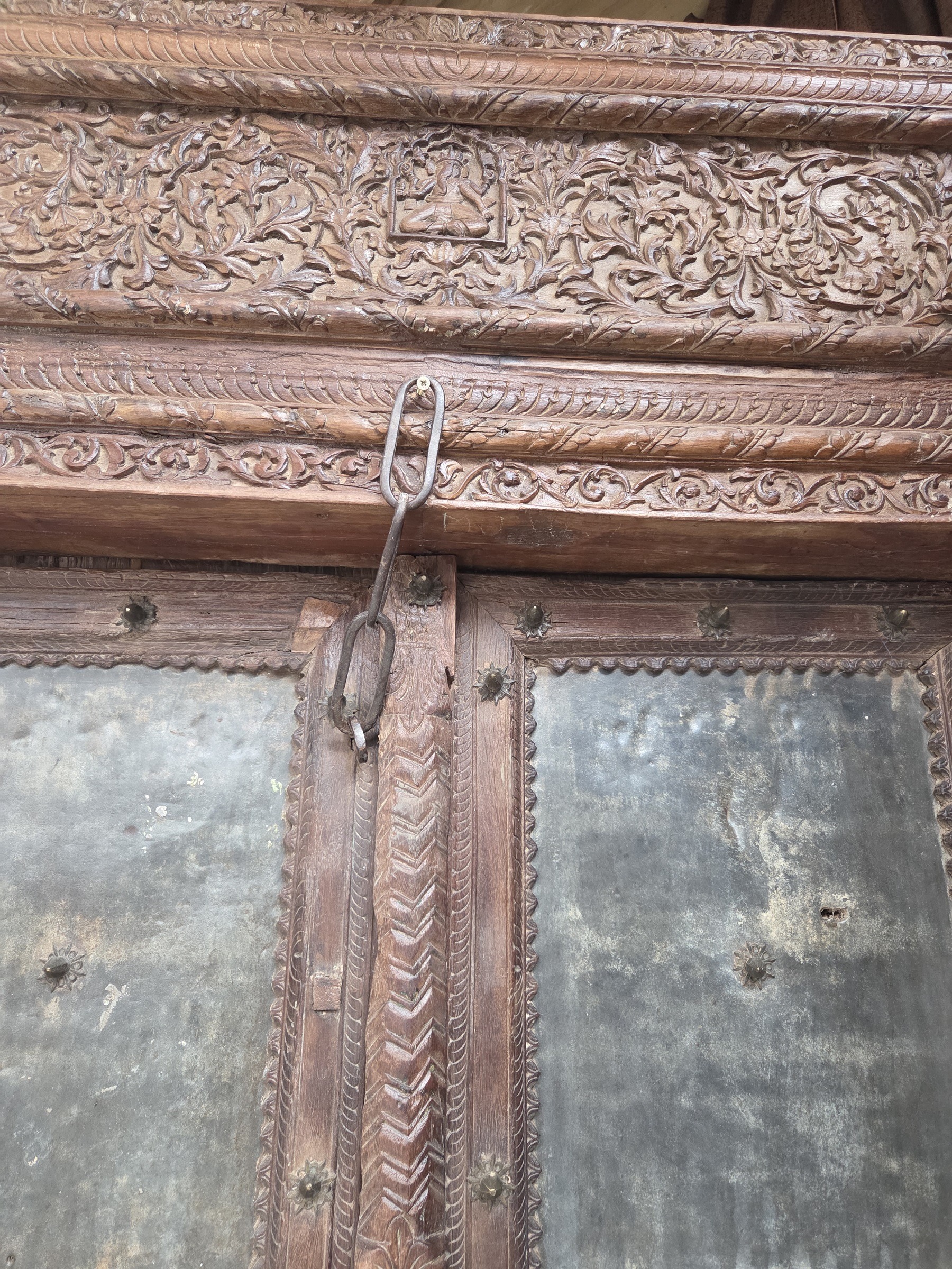 Our doors are all one of pieces which have been handpicked by us. The majority are salvaged from historic buildings, or Temples, from areas all around India. They are made from Teak wood and have been out in the weather for many years, so are suitable for outdoor use. They are hand carved and most have their original fittings. They are naturally aged, with their original patina.