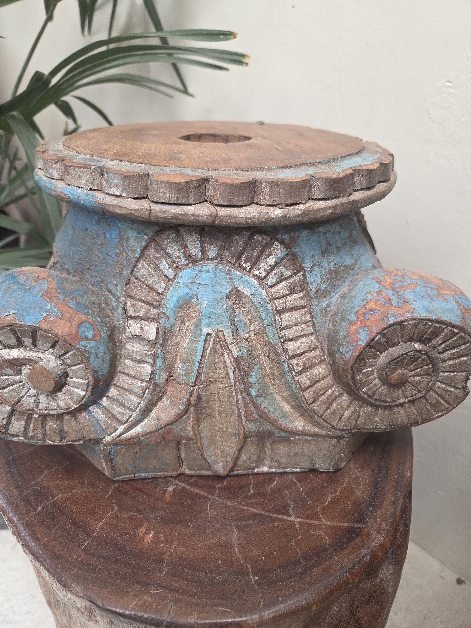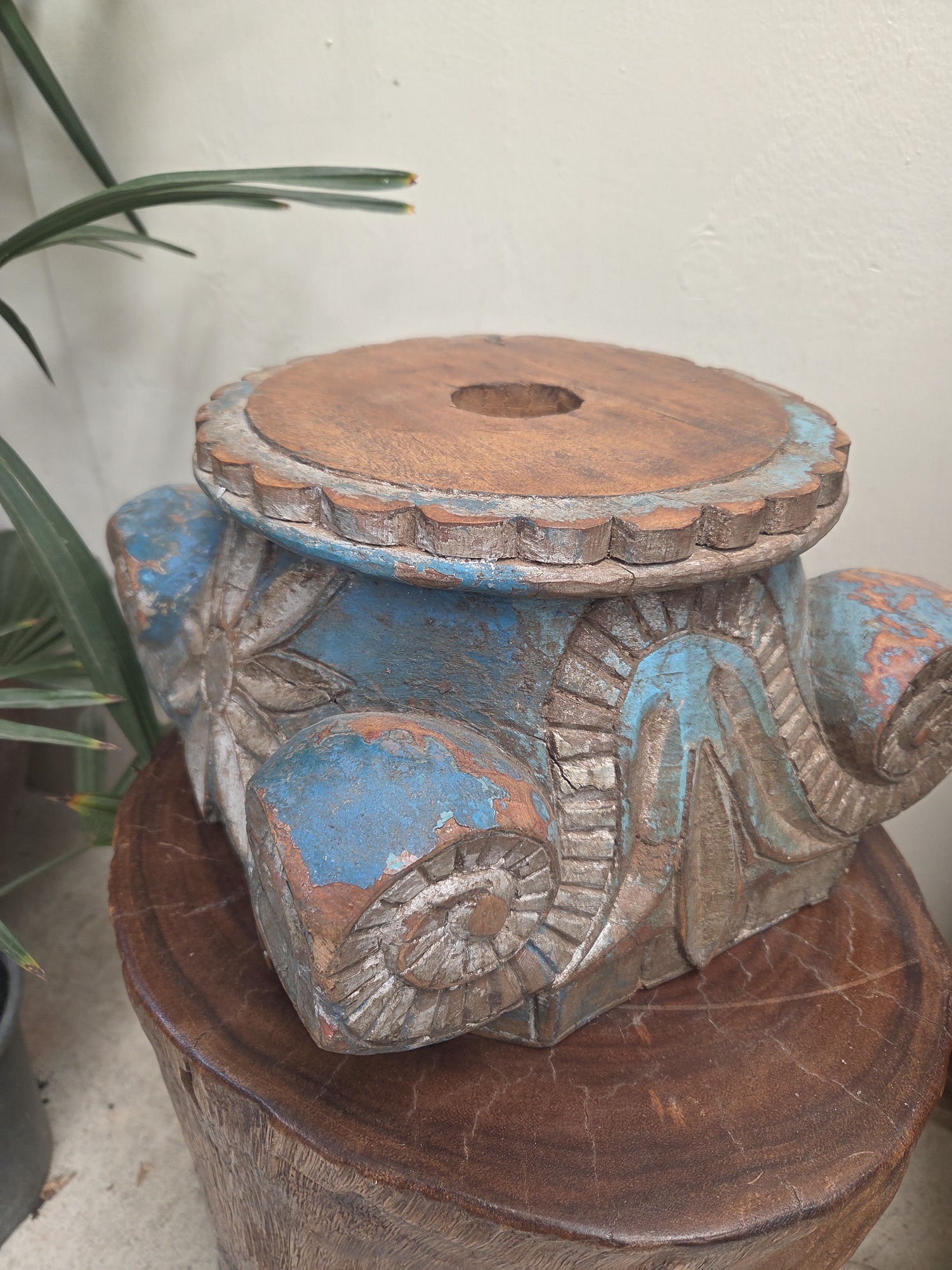 This pillar base is a stunning example of India’s rich heritage, crafted over 80years ago from solid Teak wood. Originally part of a grand structural pillar, this piece can now serve as a decorative candle stand or similar.